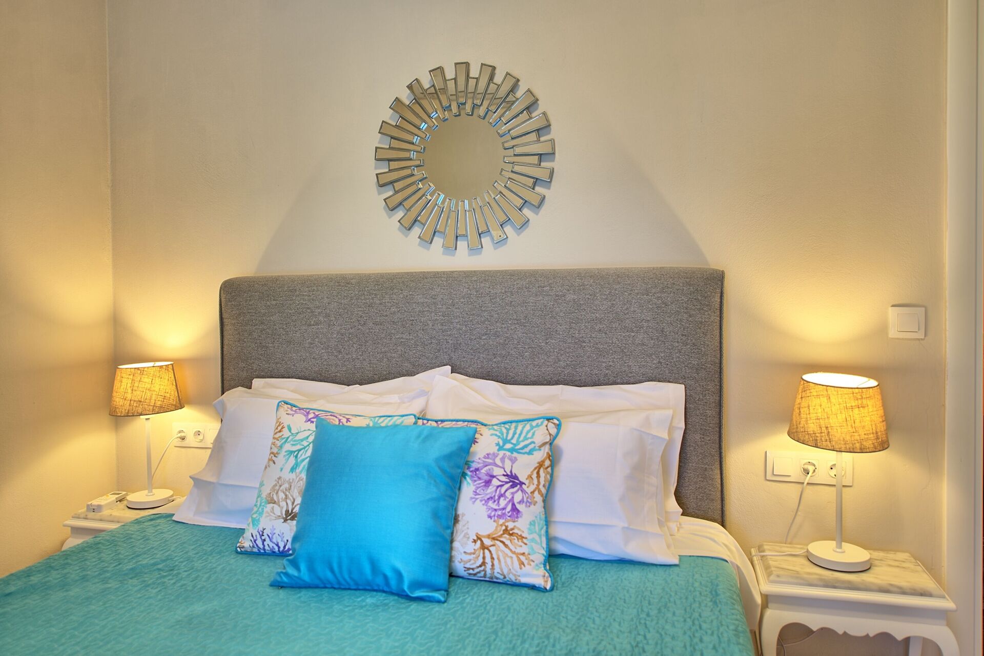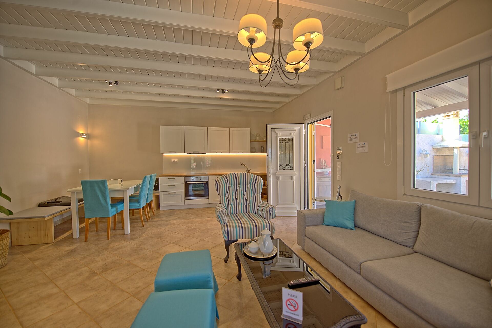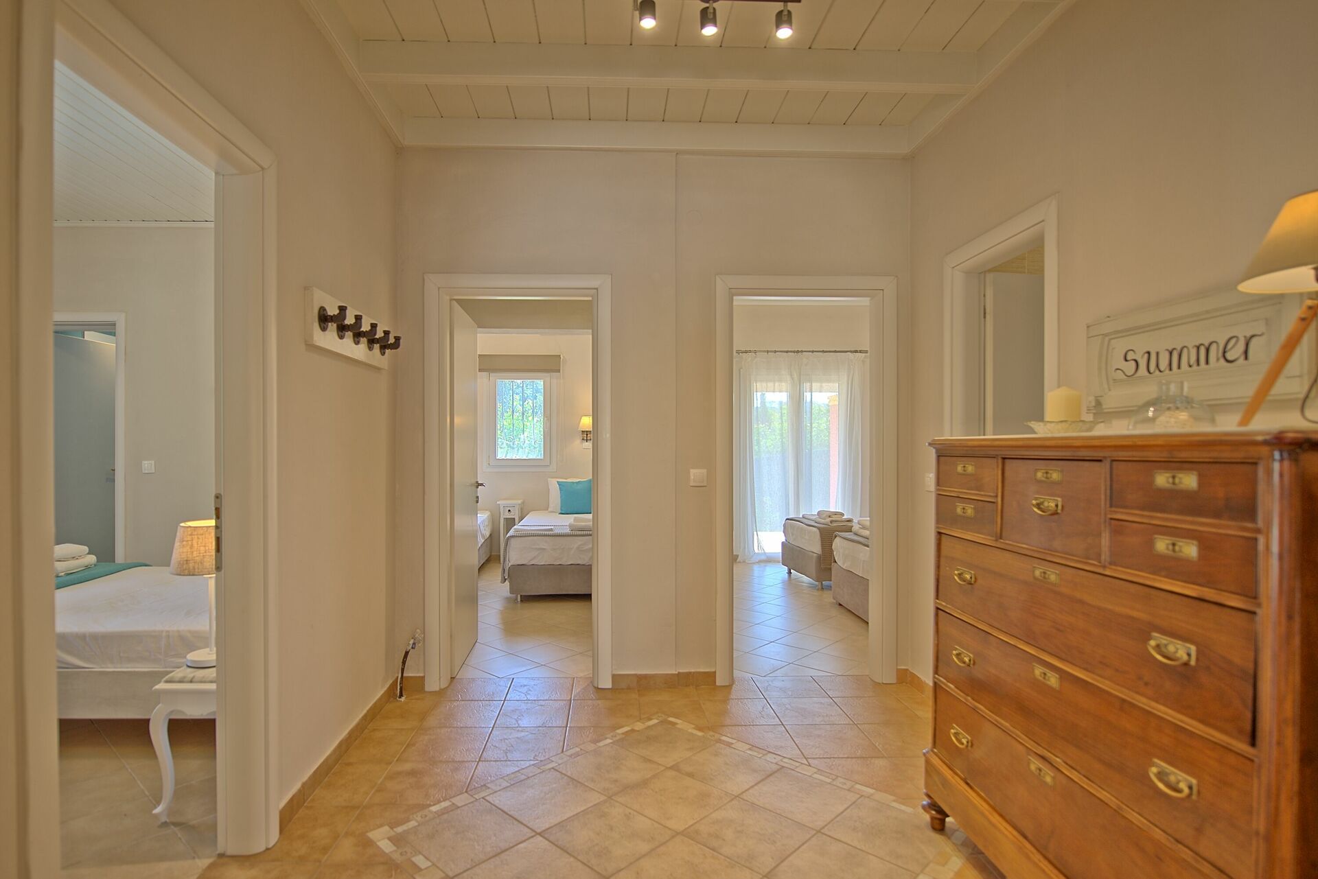 Huset er bygget over ett plan og det moderne interiøret er designet for å gi en avslappende, munter følelse, med stort fokus detaljer. Åpen stue / kjøkken har 2 sofaer (som kan gjøres om til 2 enkeltsenger i vanlig størrelse), TV, wi-fi internettforbindelse, spisebord. Kjøkkenet er stilig utformet og er fullt utstyrt med 4 kokeplater ovn, mikrobølgeovn, oppvaskmaskin, kjøleskap / fryser. Stuen har utgang rett ut til den romslige utendørsterrassen med direkte tilgang til bassenget! Feriehuset har 3 soverom og 2 bad totalt. Et stort soverommet har eget bad med dusj og store terrassedører som åpner seg ut mot terrassen ved bassenget. Det andre soverommet har to enkeltsenger, mens det tredje er spesielt romslig og har 2 enkeltsenger (som kan settes sammen på forespørsel) og en ekstra sammenleggbar seng. De deler et familiebad med badekar og vaskemaskin. Eieren Joanna har under restaureringen nøye gjenskapt antikke deler som er laget av bestefaren John som var den tidligere eieren av villaen, så vel som en dyktig snekker.