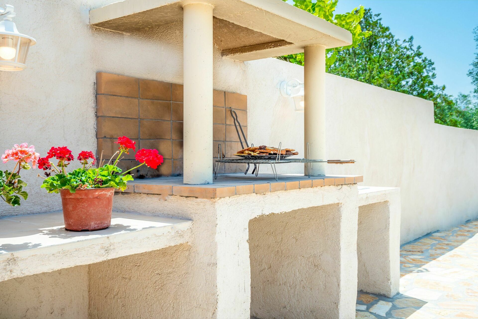 Uteområdene til Beach Villa Joanna er imponerende. Bassenget er smart utformet og er vakkert opplyst om natten. Gjestene har mulighet for å ta en forfriskende dukkert direkte fra terrassen. Svømmebassenget er delt inn i to seksjoner, en dedikert til voksne og en dedikert til barna, forbundet med en imponerende fossefall. Den voksne delen måler 9m x 4m (dybde fra 1,2 m til 1,7 m), mens barneseksjonen måler 5 m x 2 m (avd. 0,5 m). Den sirkulære delen av bassenget har en hyggelig sittegruppe, perfekt for å slappe av mens du nyter en drink. Voksne og barn kan trygt leke på plenen foran villaen, eller sole seg på en av de komfortable solsengene som tilbys, og nyte den vakre utsikten over de omkringliggende oliventrærne. Privat parkering er tilgjengelig på stedet.