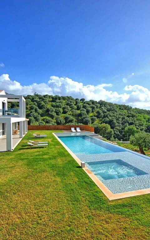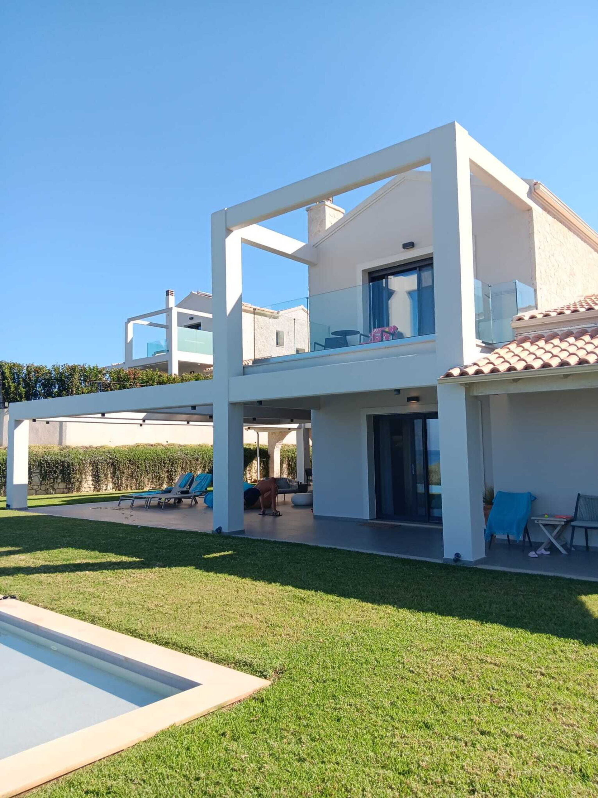 A beautiful, modern and spacious property perched on a hill with views from all the rooms overlooking the sea and the Albanian mountains in the distance.