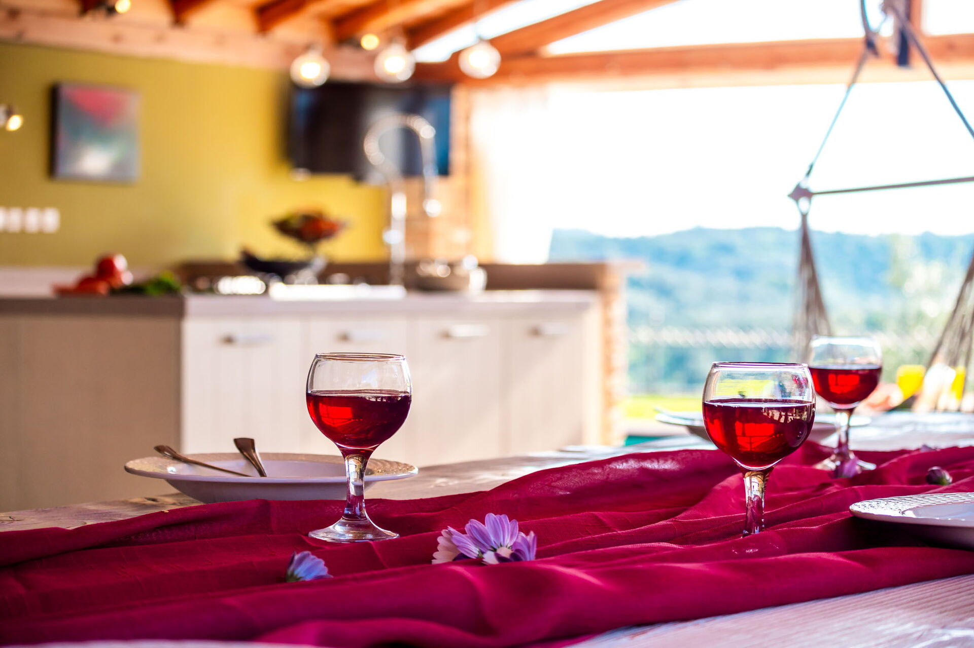 Ekstern bygning (ikke tilknyttet hovedhuset innvendig, men bare noen få meter unna): oppholdsrom med stue (TV) og spisestue med stort, godt utstyrt kjøkken (koketopper, stekeovn, grill, vedfyrt ovn).