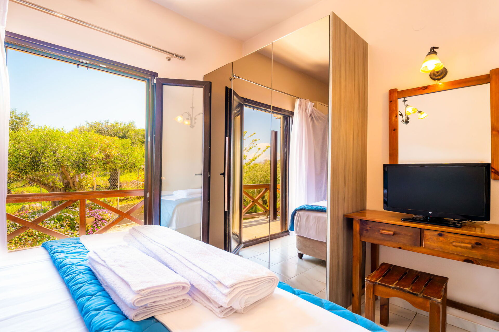 Avstander: sjø 400 meter unna (Agios Spyridon-stranden), Acharavi (butikker av alle slag) 5 km, Kassiopi 7 km, Palaiokastritsa 40 km, Korfu by 43 km, flyplass 45 km.
