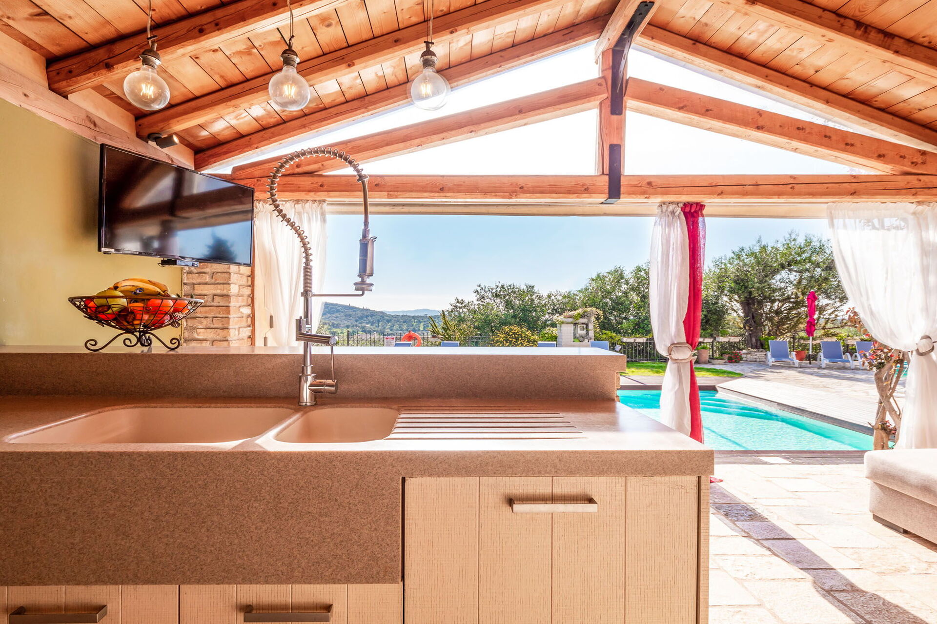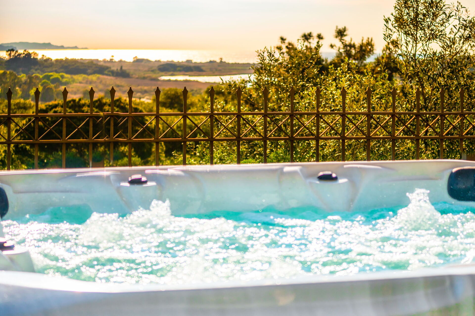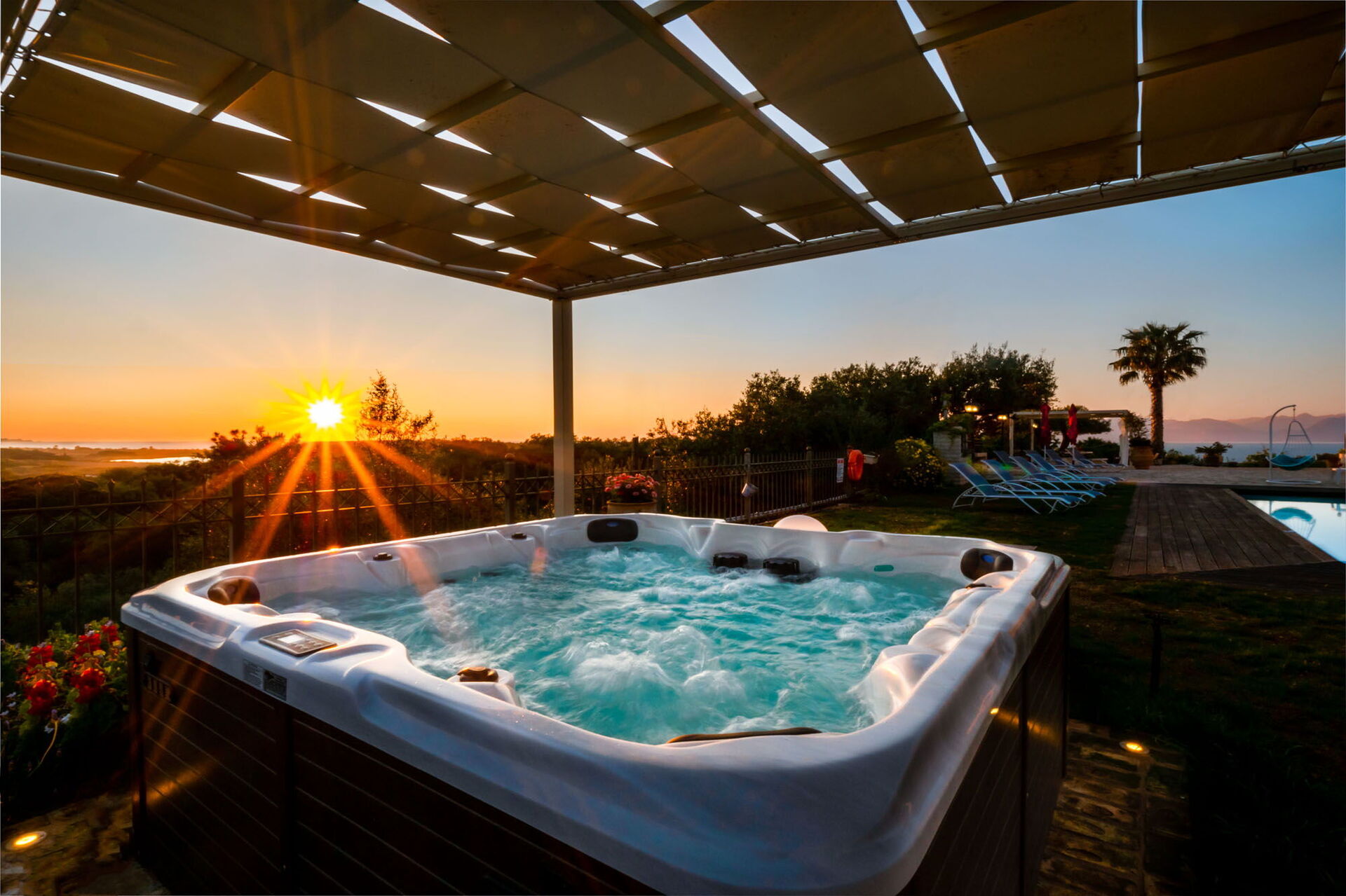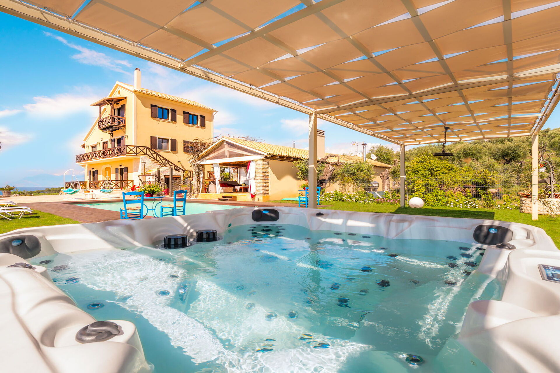 Et vakkert basseng og et spektakulært boblebad med plass til 7 personer er til gjestenes bruk. Også utendørs områdene er private, samt et imponerende eksternt rom med kjøkken og stor spiseplass som vender mot bassenget og hagen. Dette rommet har justerbare gardiner som kan åpnes på solrike dager, eller lukkes for å beskytte mot vind og kjøligere temperaturer.