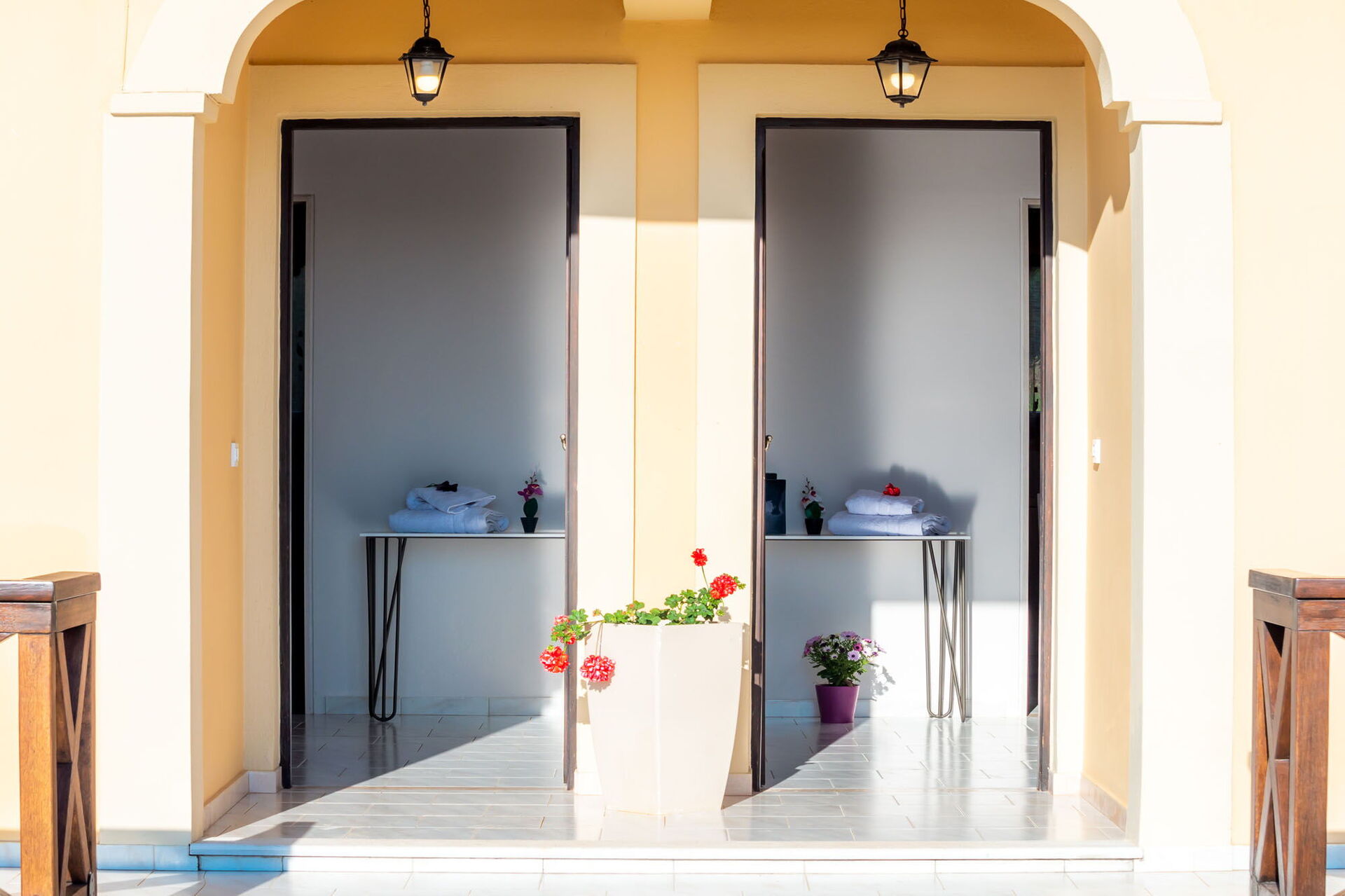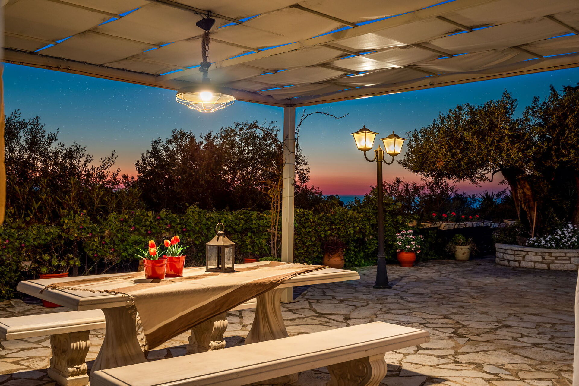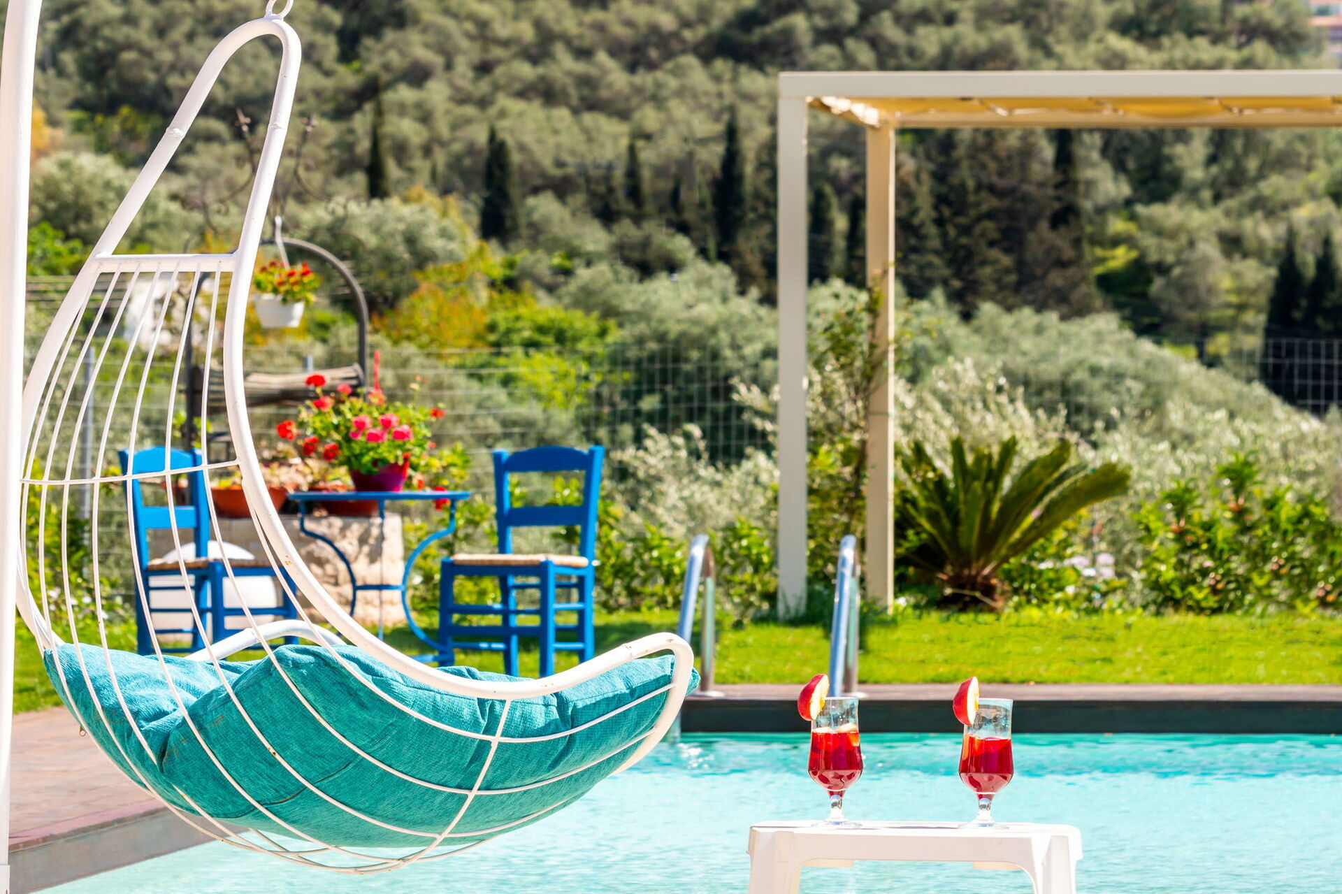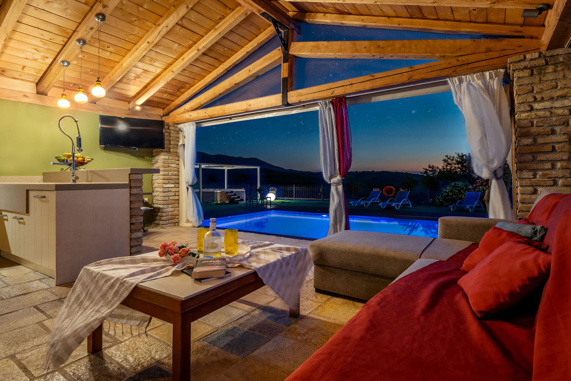 Et vakkert basseng og et spektakulært boblebad med plass til 7 personer er til gjestenes bruk. Også utendørs områdene er private, samt et imponerende eksternt rom med kjøkken og stor spiseplass som vender mot bassenget og hagen. Dette rommet har justerbare gardiner som kan åpnes på solrike dager, eller lukkes for å beskytte mot vind og kjøligere temperaturer.