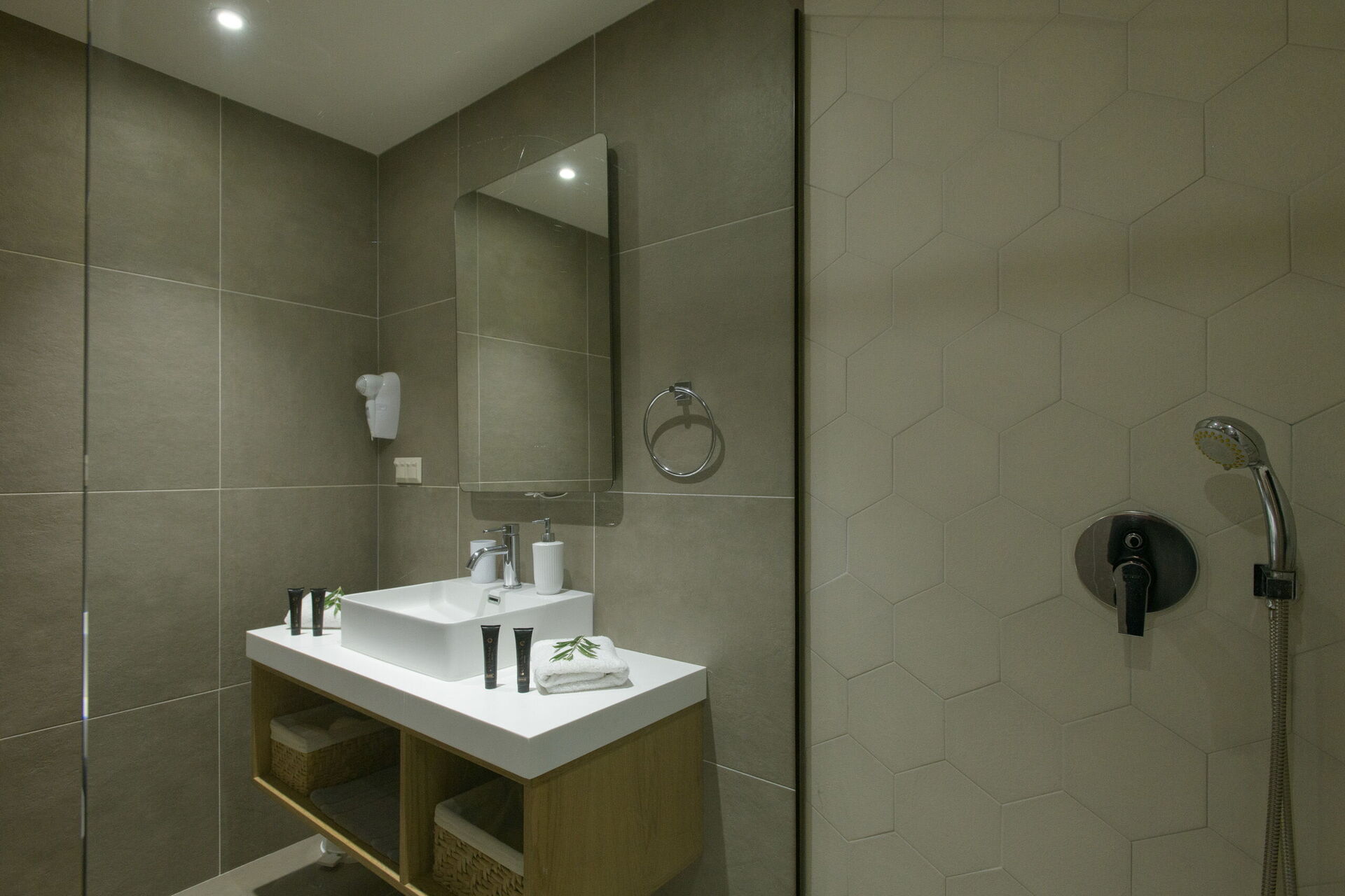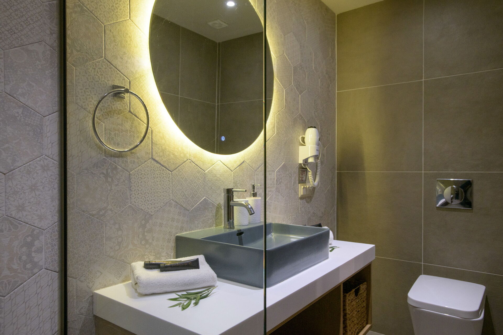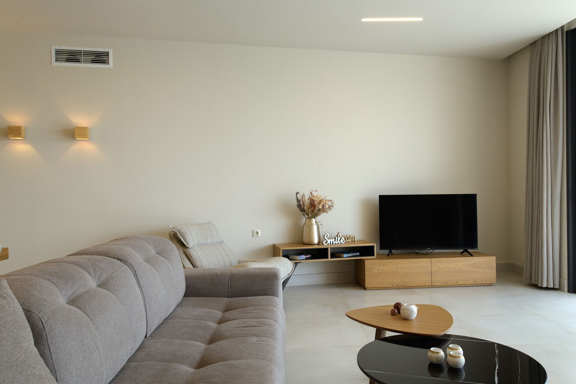 Stue med stue (smart-TV), spiseplass og kjøkken (ovn, fryser, oppvaskmaskin, mikrobølgeovn, brødrister, vannkoker og kaffetrakter); TOALETT; 2 soverom, hver med eget bad med dusj; soverom med 2 enkeltsenger (kan settes sammen på forespørsel) og eget bad med dusj.