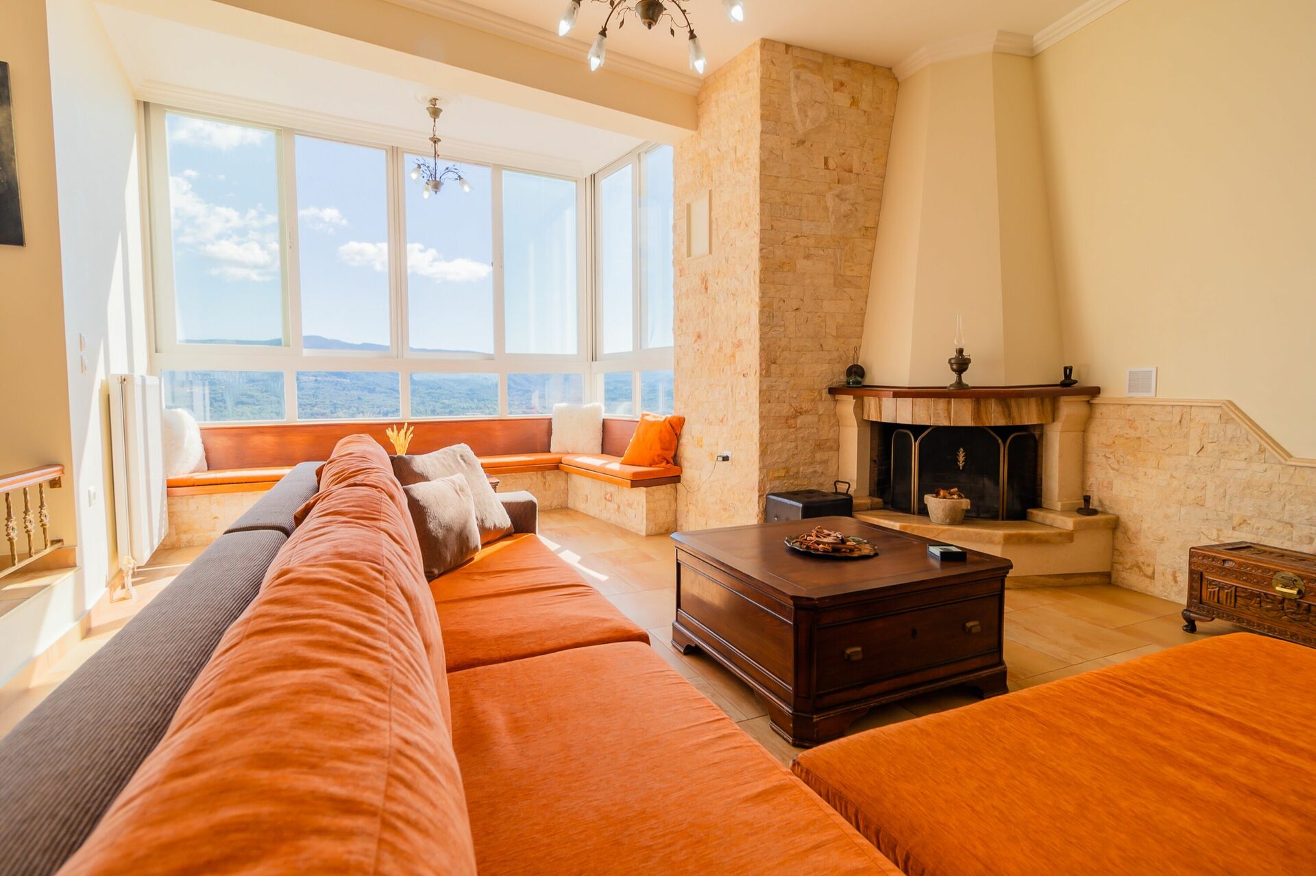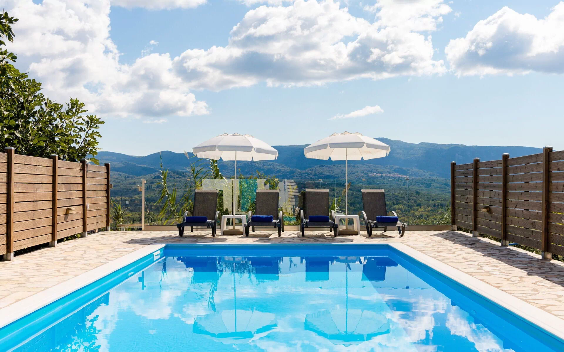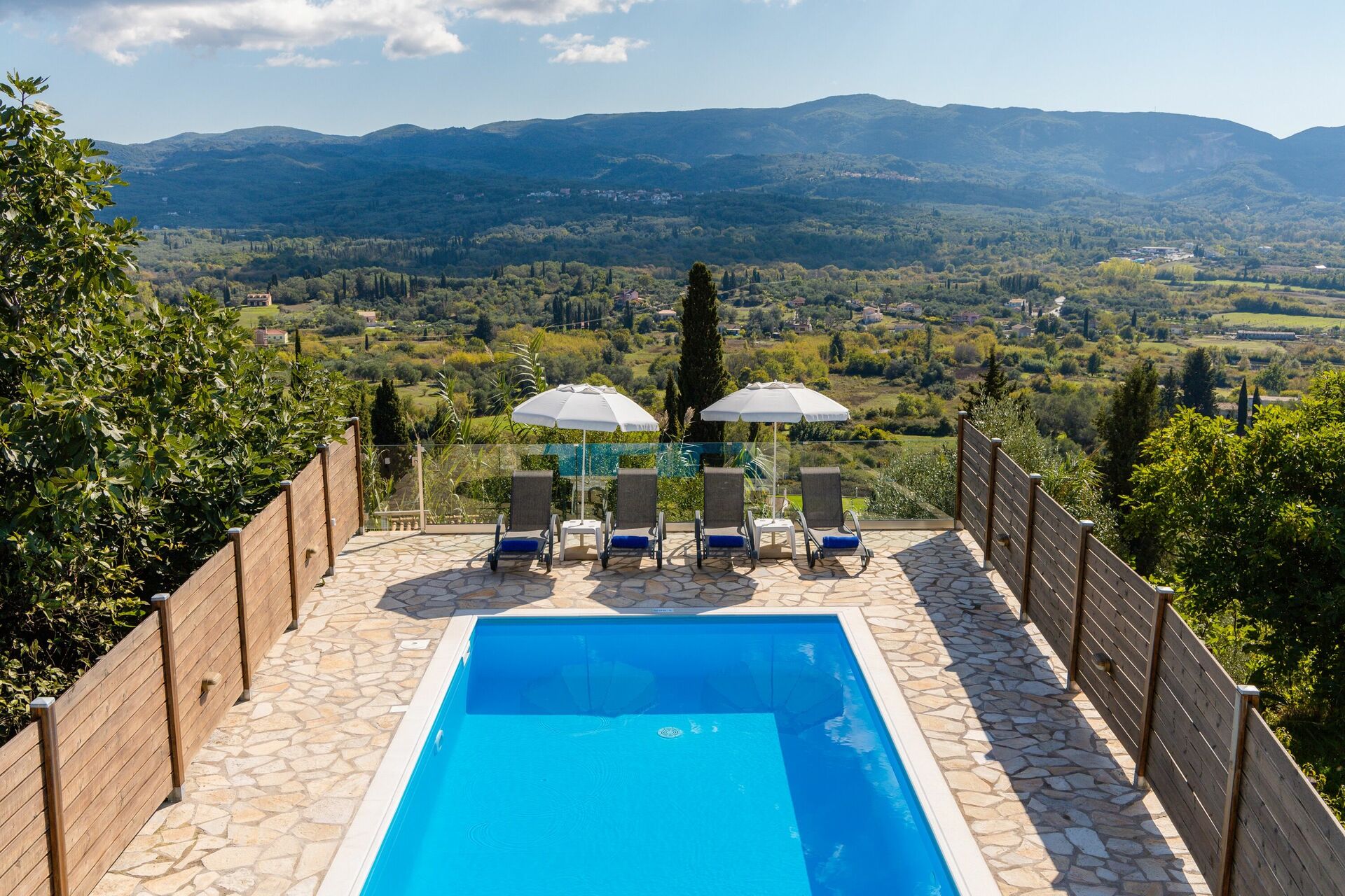 Feriehuset vakker utsikt fra både stuen, uteområdene og det private svømmebassenget.