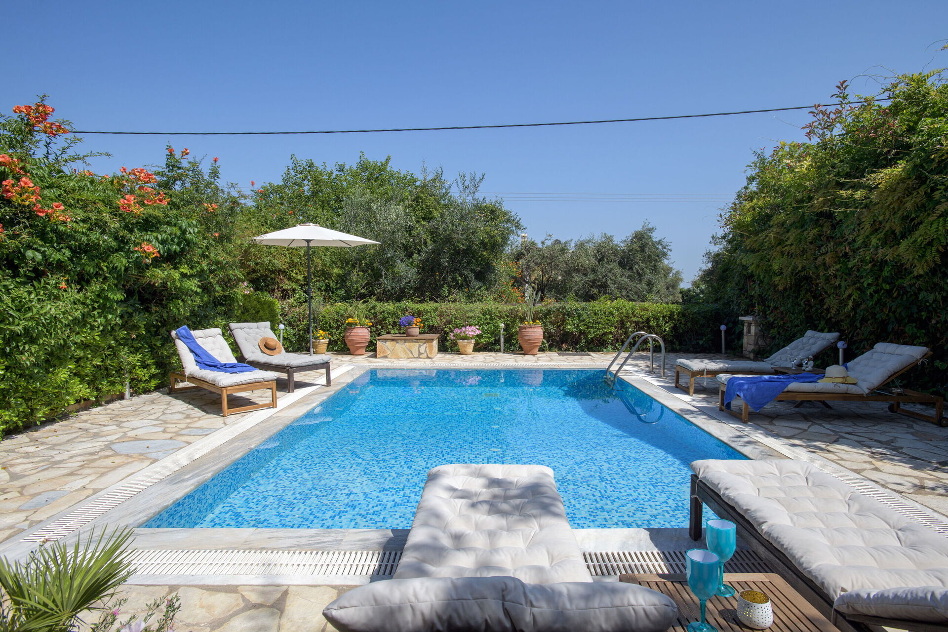 Bassenget ligger foran villaen, og er utstyrt med solsenger og parasoller. Frodige middelhavsbusker rundt sørger for at det ikke er noe innsyn.