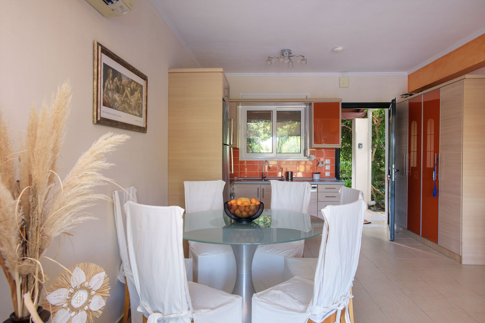 Brilliant location beach and restaurant a few metres away , super markets, shops and restaurants all within walking distance and a great view from the upstairs terrace. Many great restaurants close by, restaurant Glyfa across the bay will send a boat to pick you up from the beach, hire a car to see the island.