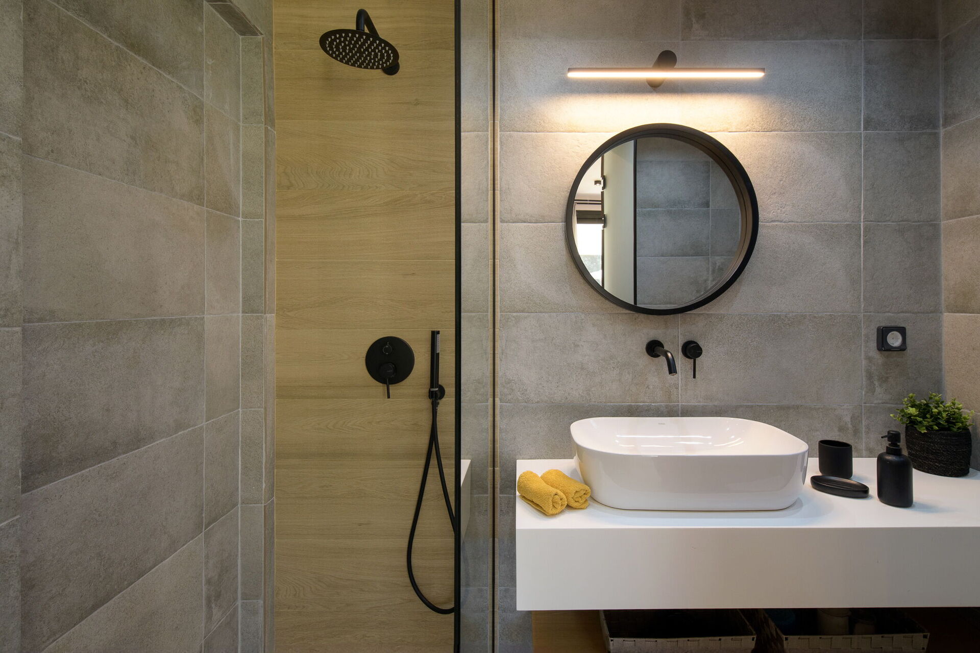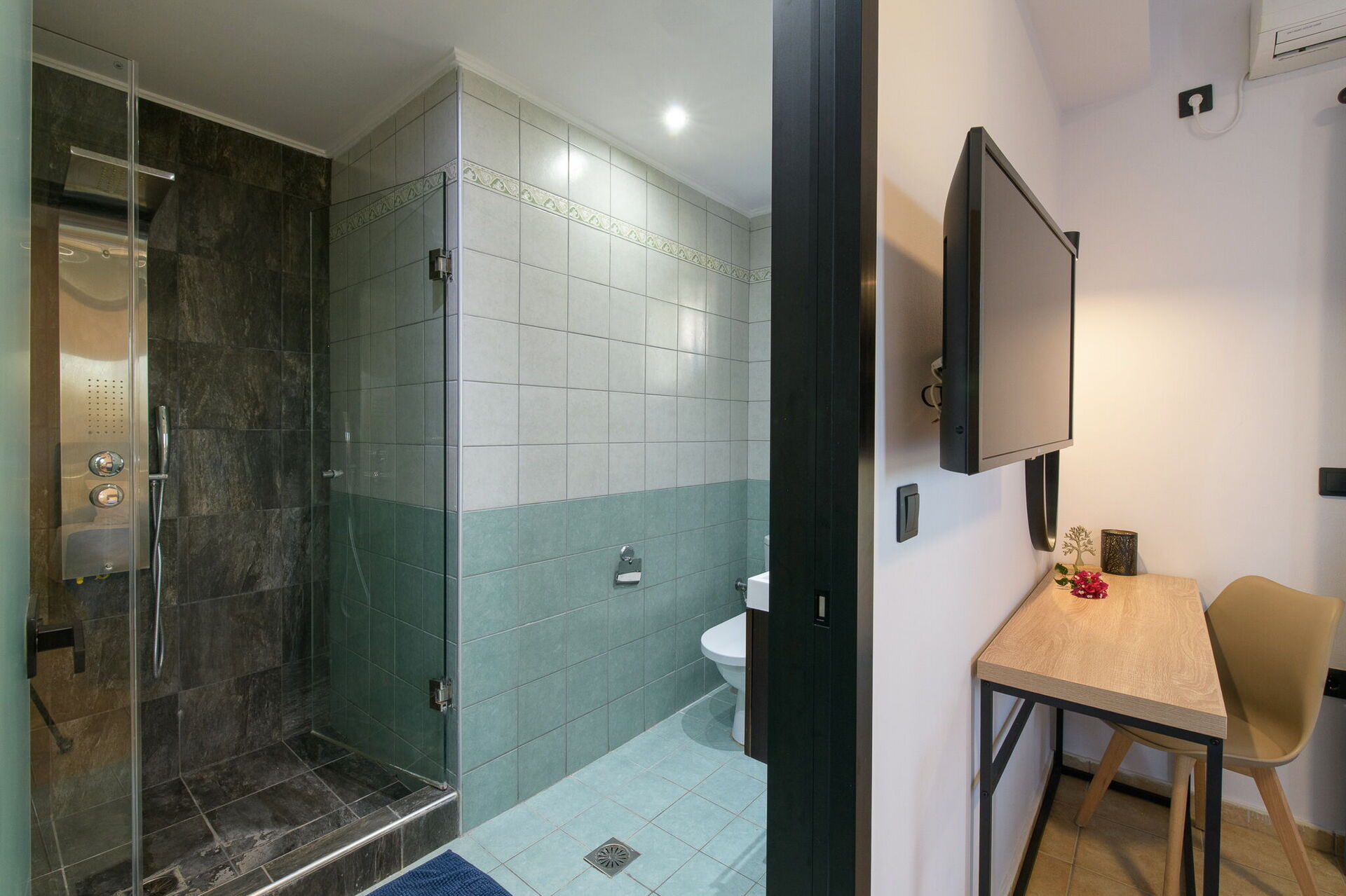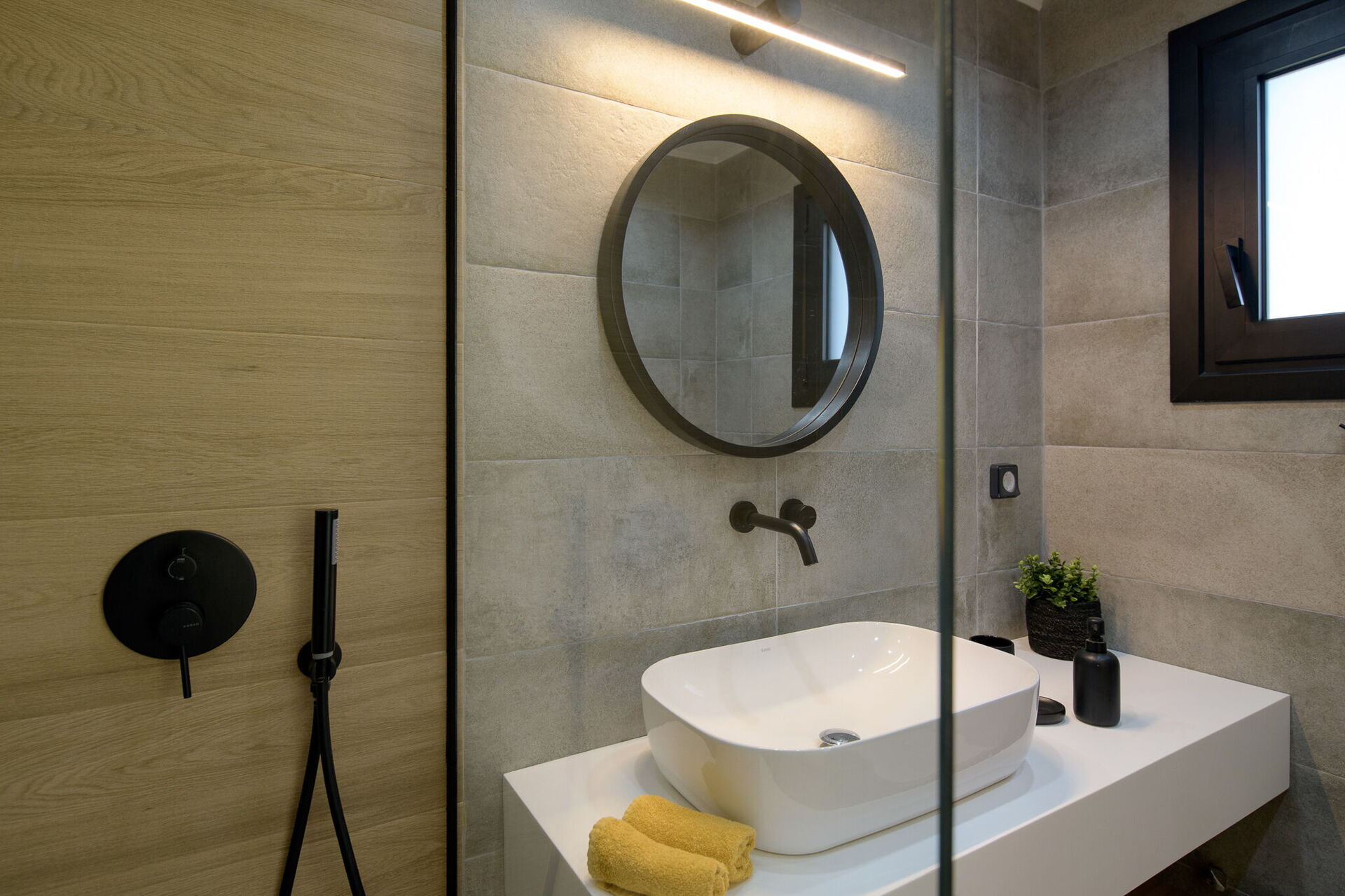 Andre etasje: soverom med dobbeltseng, eget bad med dusj og utgang til terrasse møblert med bord og stoler; soverom med dobbeltseng, eget bad med dusj og utgang til terrasse møblert med bord og stoler.