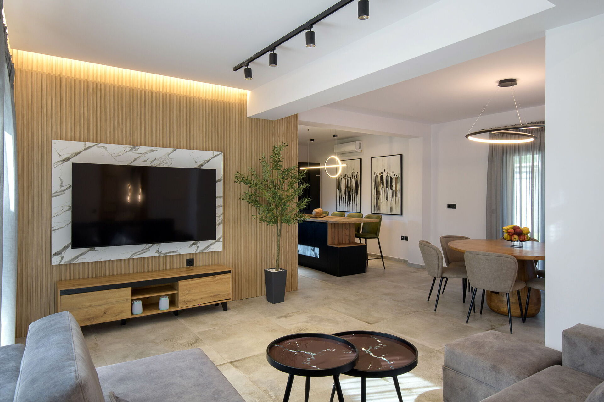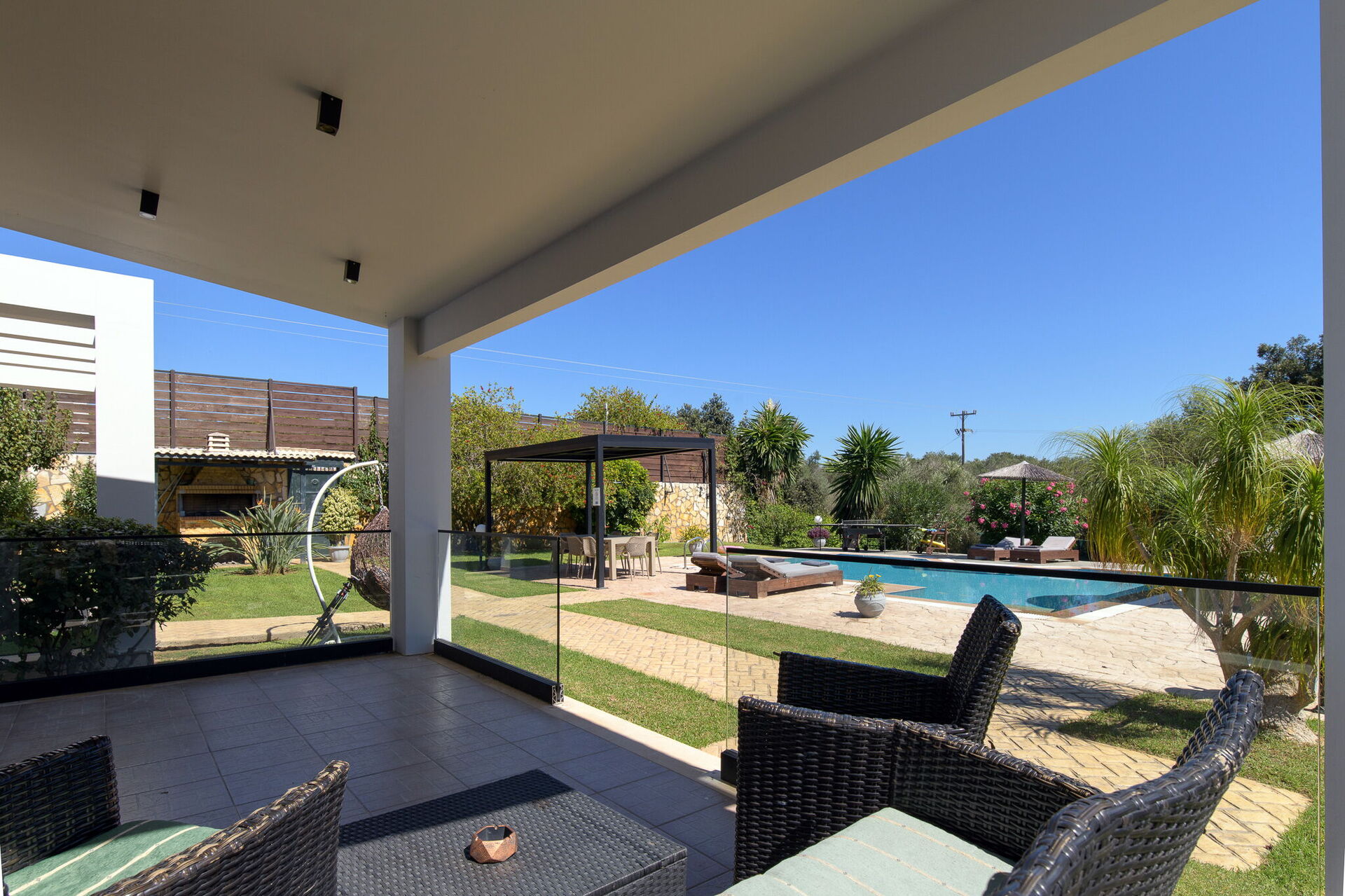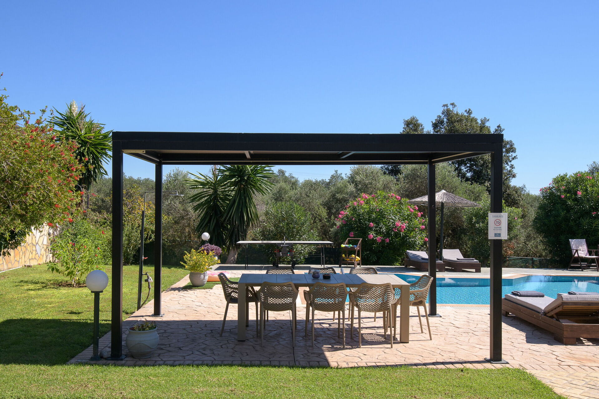 På uteområdet er det fellesarealer hvor gjestene kan tilbringe tid sammen med familie eller venner, perfekt for å skape uforglemmelige øyeblikk under solen på Korfu – enten ved spiseplassen i skyggen, eller ved det store bassengområdet med solsenger.