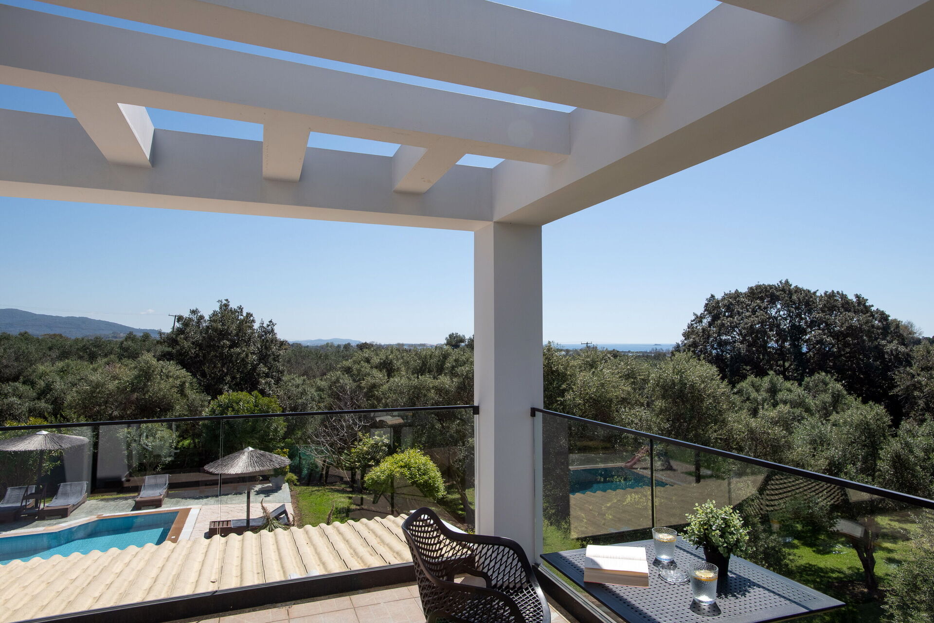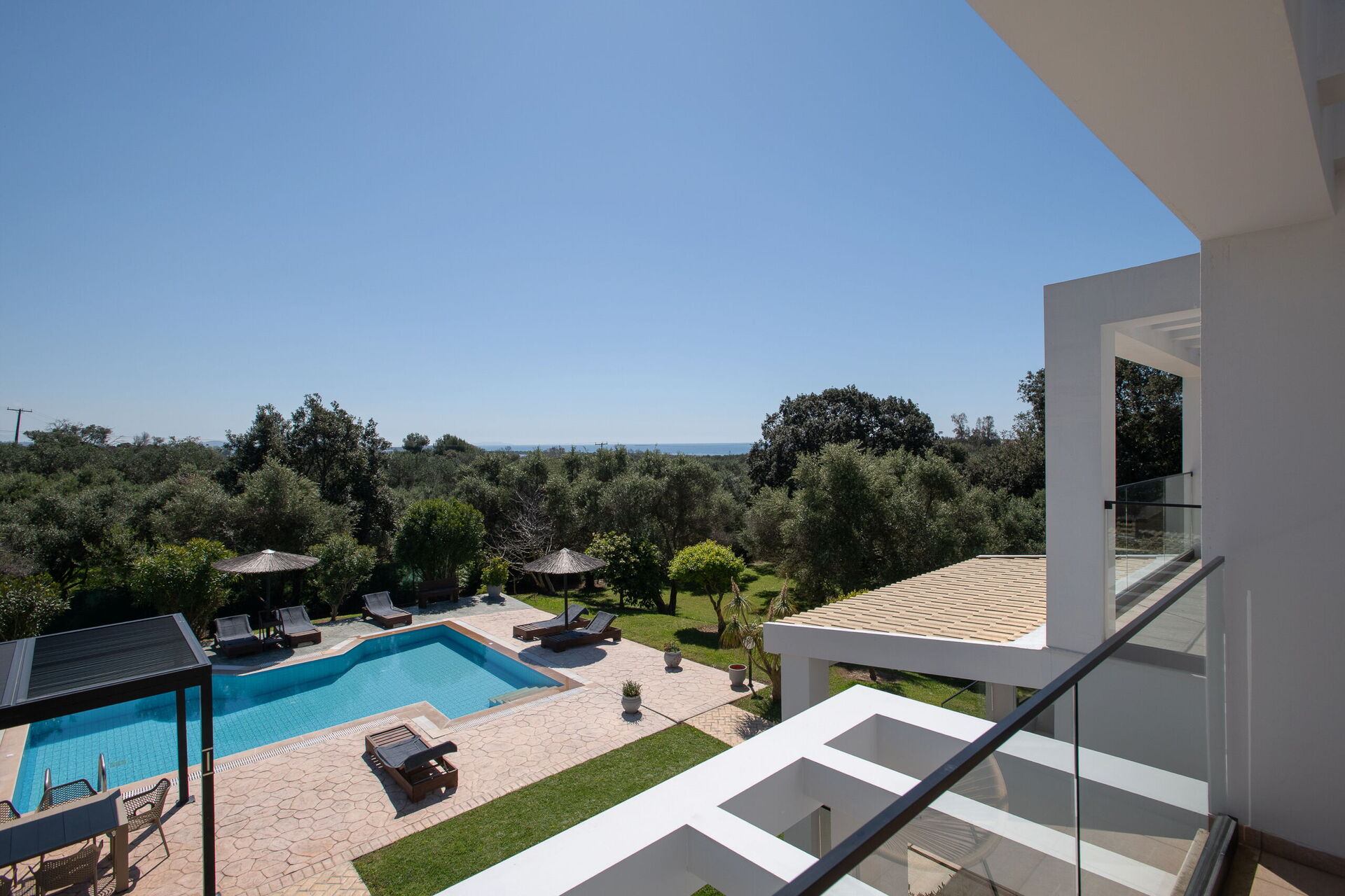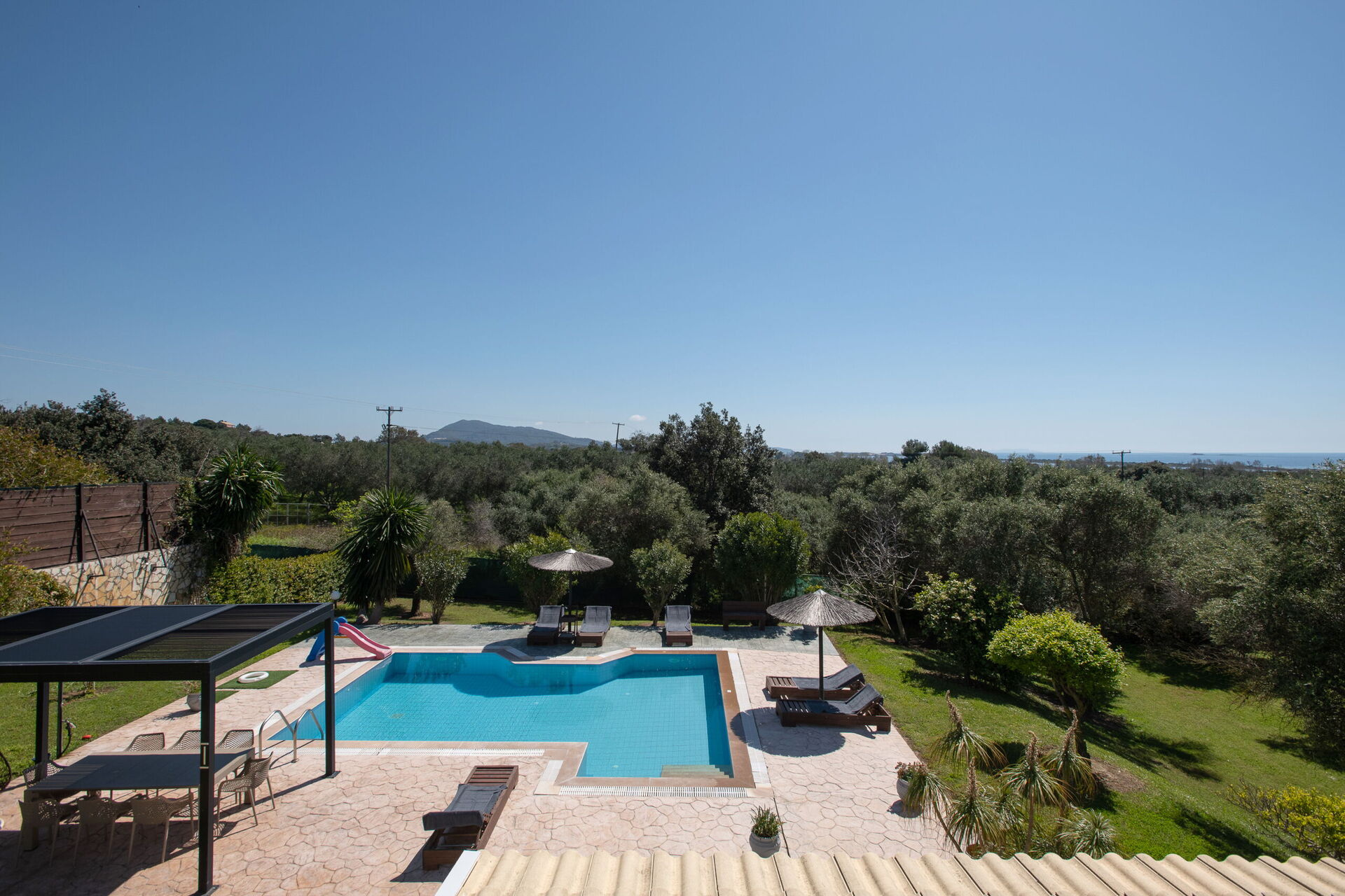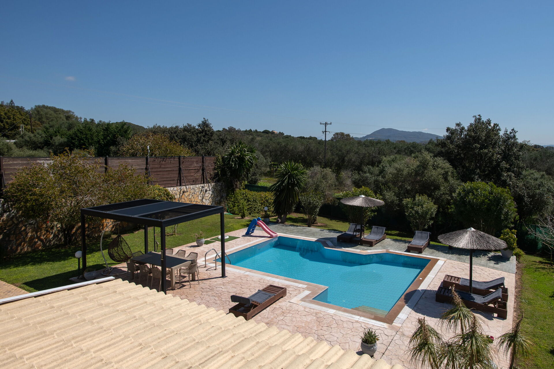 På uteområdet er det fellesarealer hvor gjestene kan tilbringe tid sammen med familie eller venner, perfekt for å skape uforglemmelige øyeblikk under solen på Korfu – enten ved spiseplassen i skyggen, eller ved det store bassengområdet med solsenger.