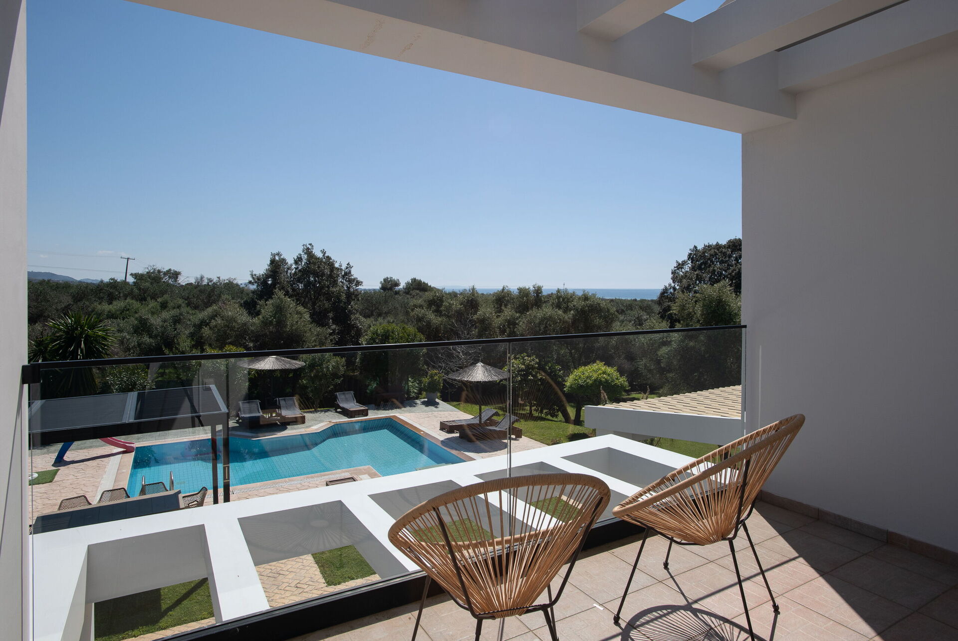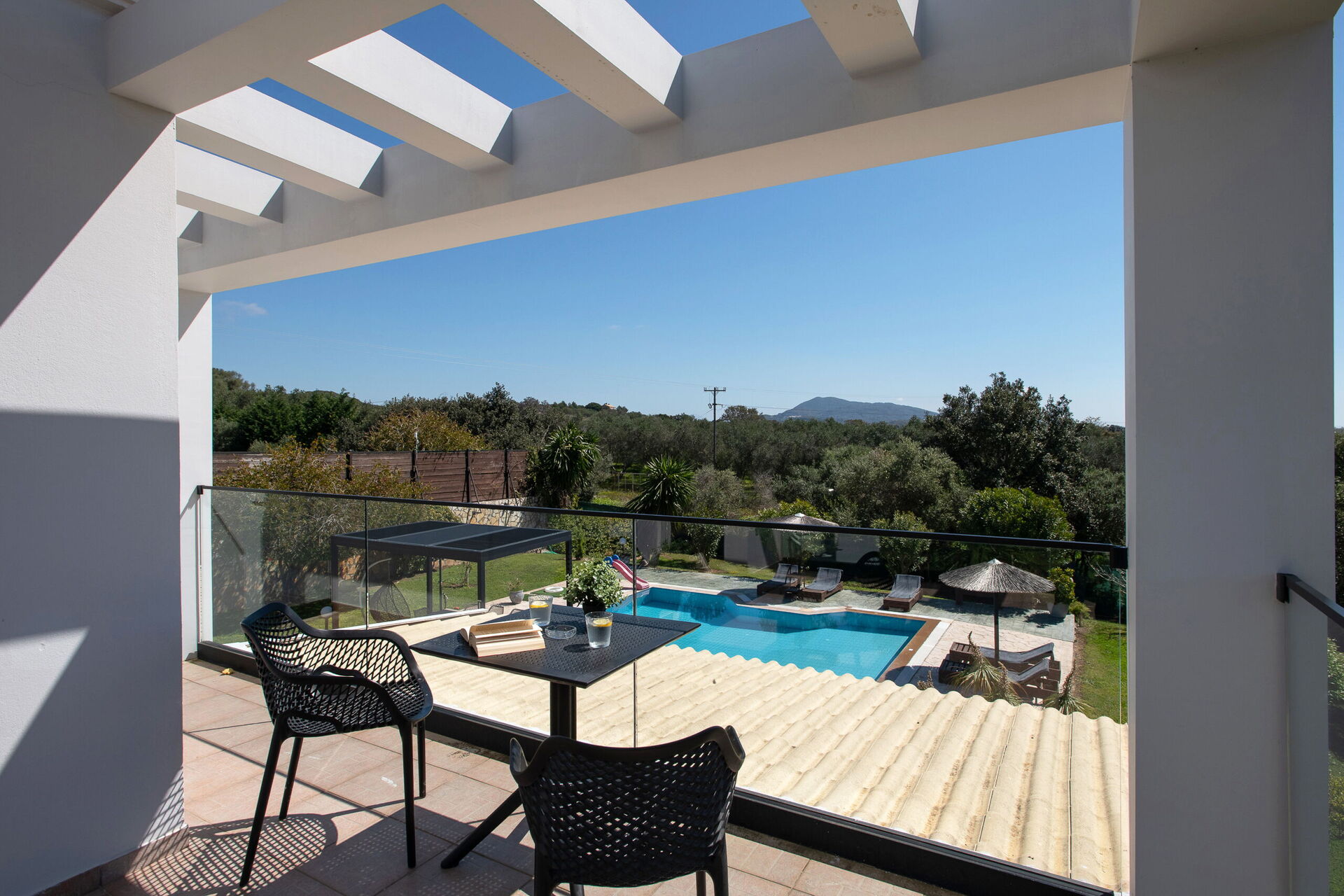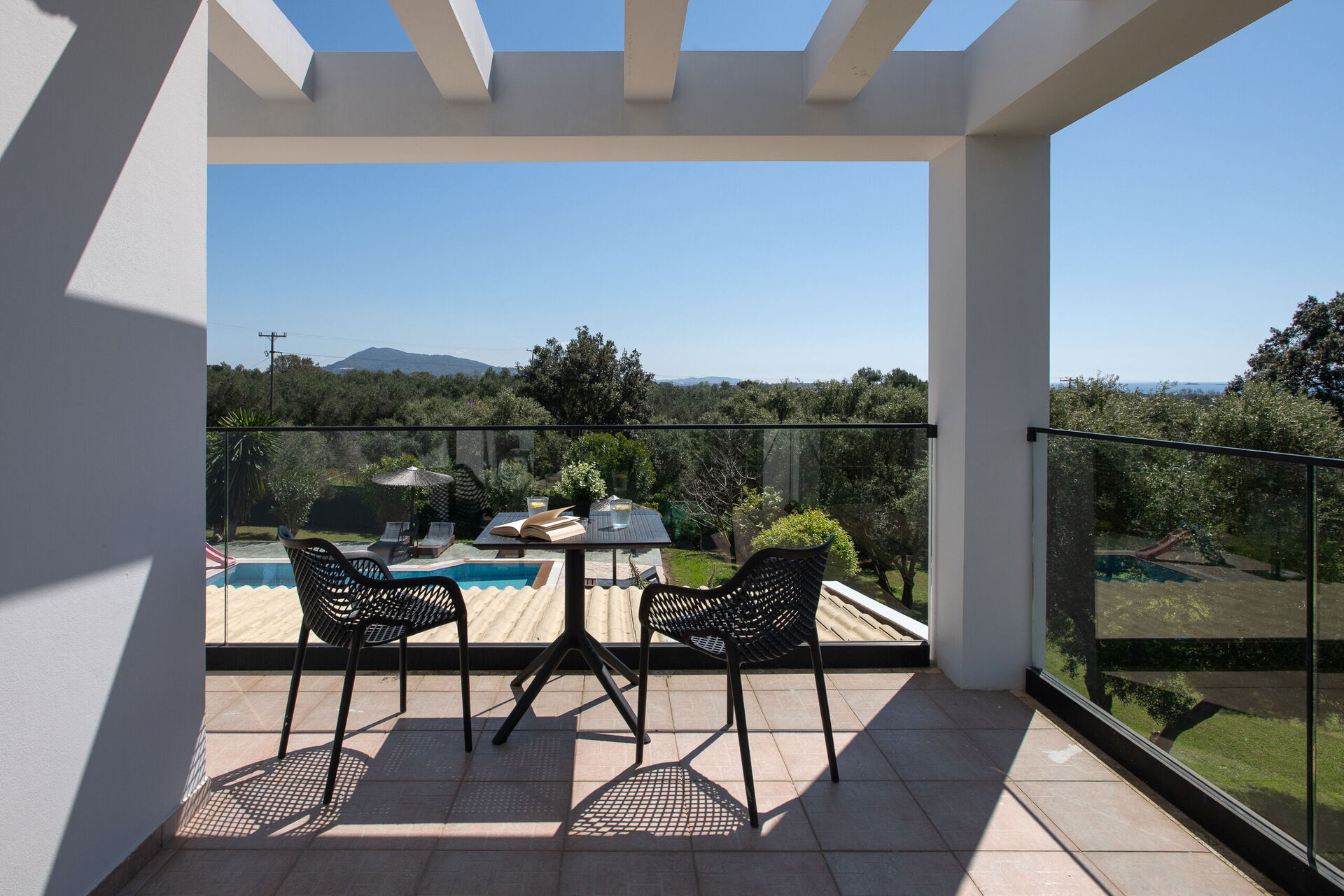 På uteområdet er det fellesarealer hvor gjestene kan tilbringe tid sammen med familie eller venner, perfekt for å skape uforglemmelige øyeblikk under solen på Korfu – enten ved spiseplassen i skyggen, eller ved det store bassengområdet med solsenger.