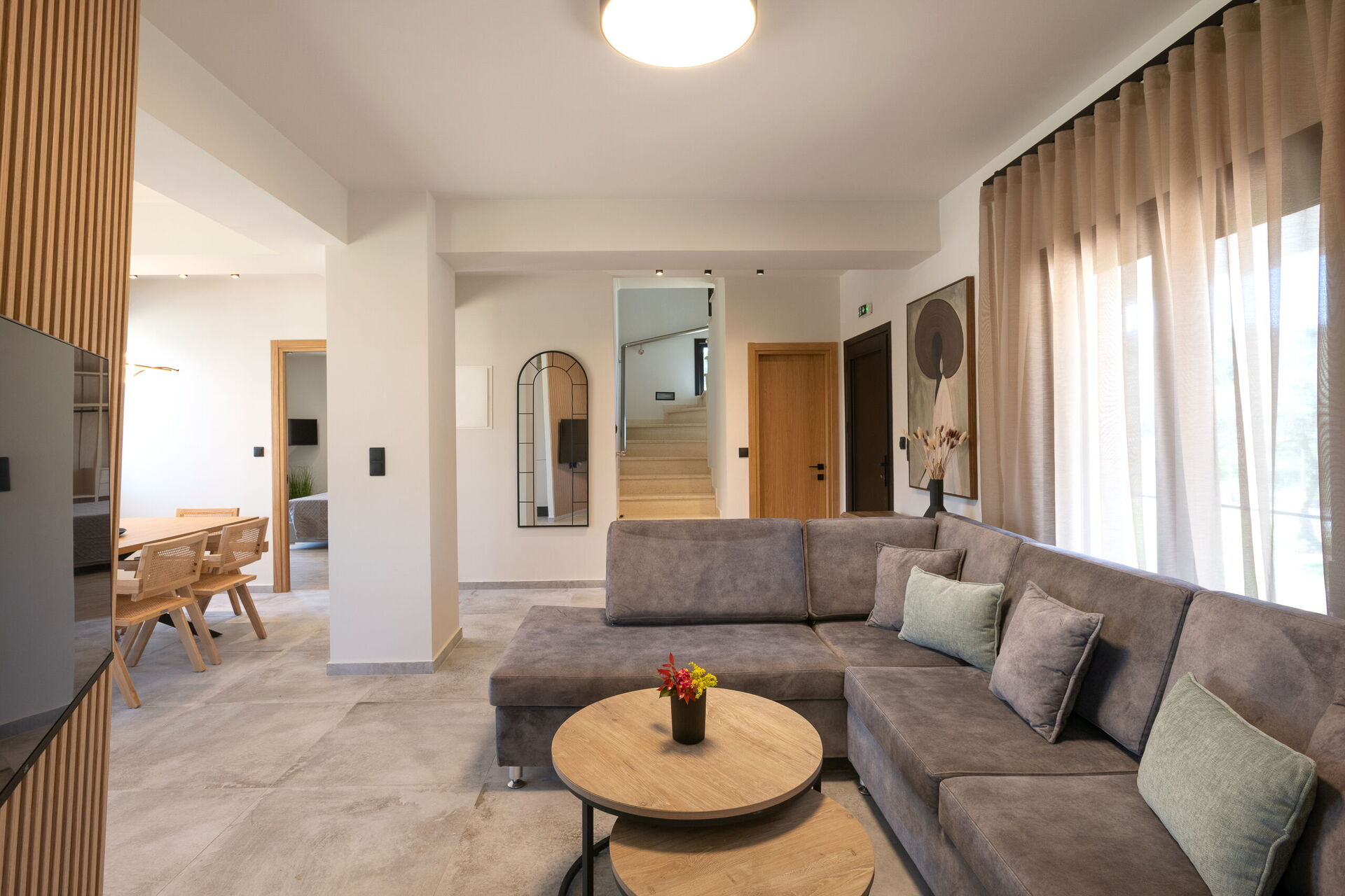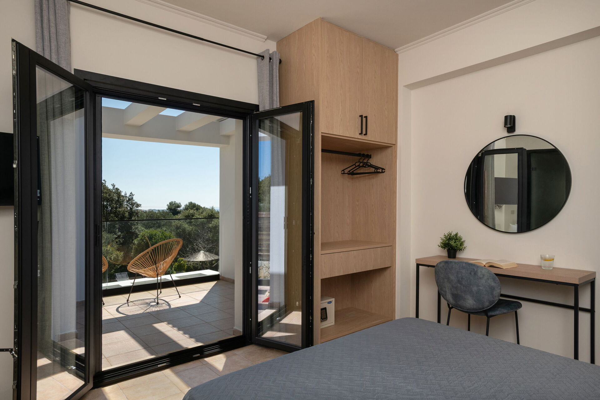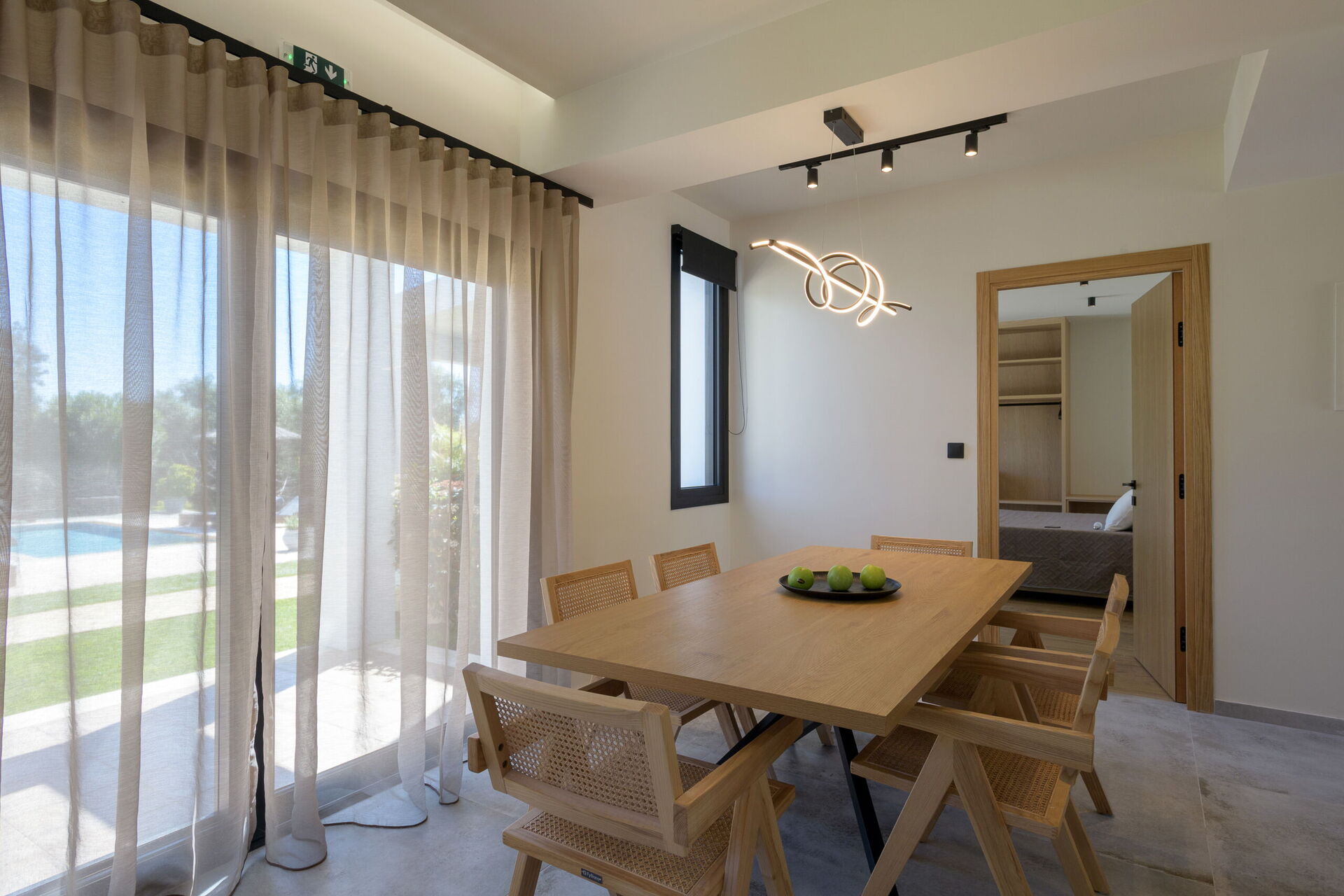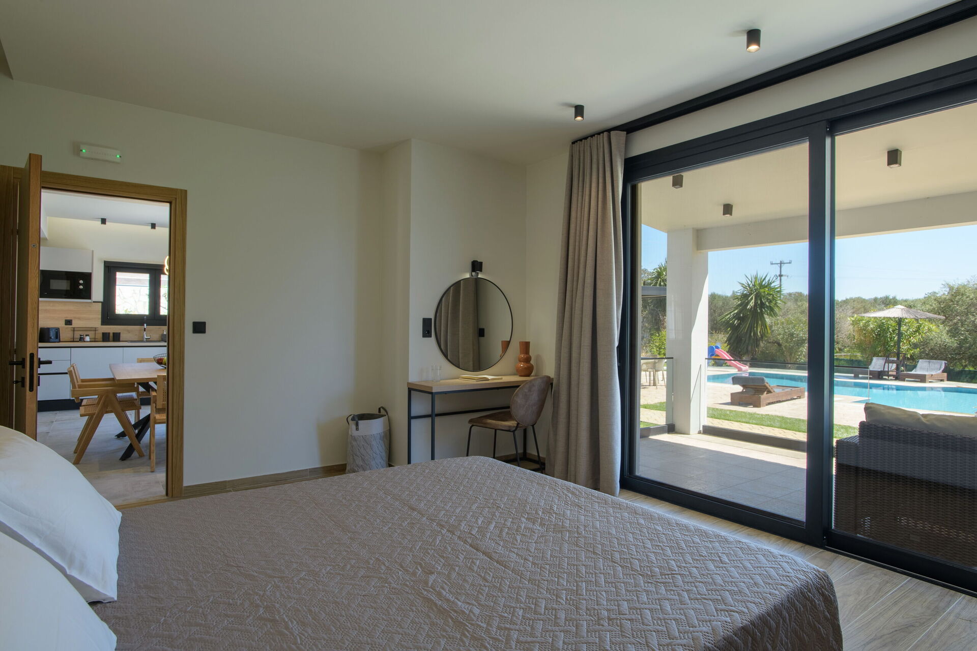 På uteområdet er det fellesarealer hvor gjestene kan tilbringe tid sammen med familie eller venner, perfekt for å skape uforglemmelige øyeblikk under solen på Korfu – enten ved spiseplassen i skyggen, eller ved det store bassengområdet med solsenger.