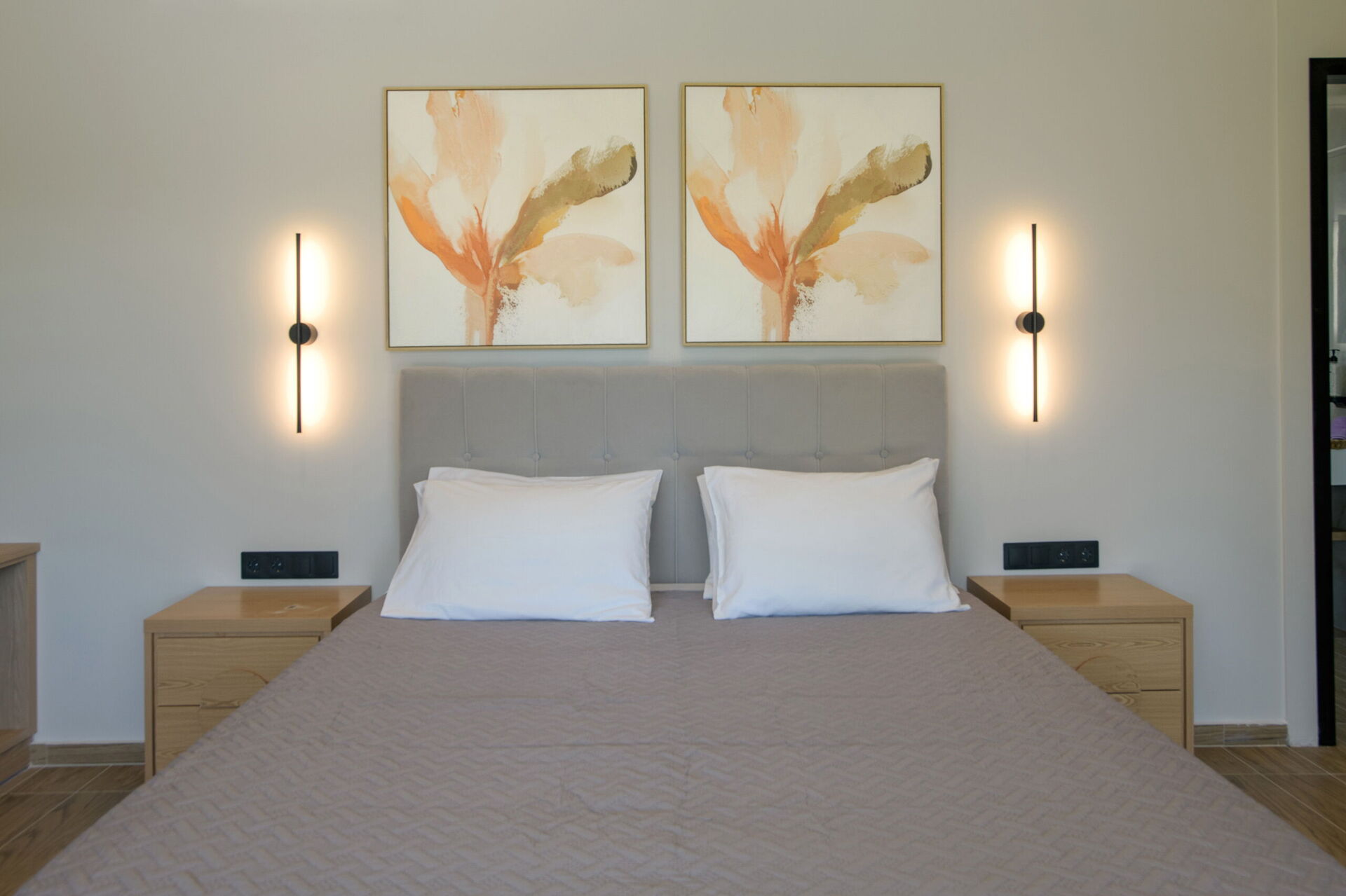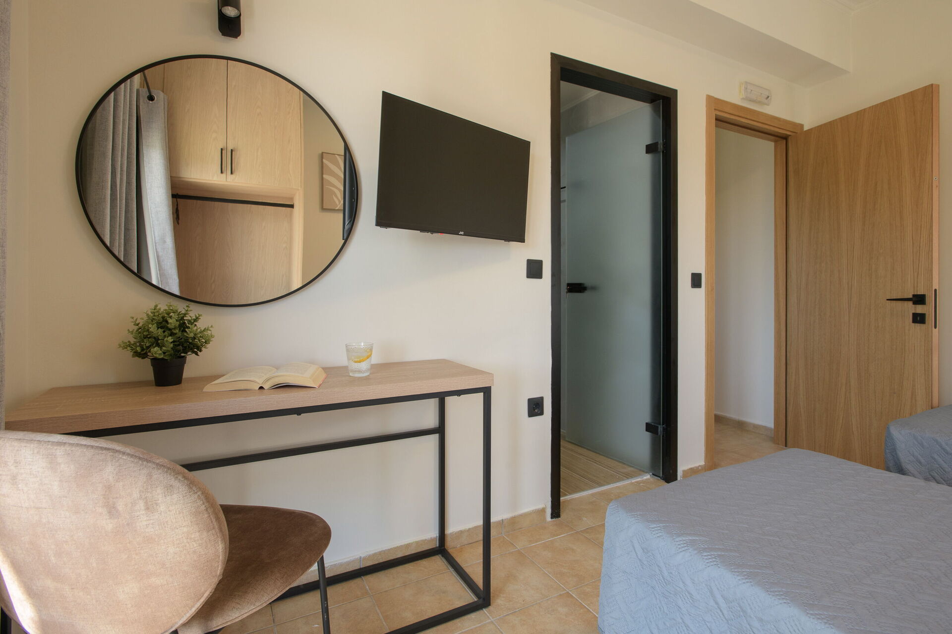 Andre etasje: soverom med dobbeltseng, eget bad med dusj og utgang til terrasse møblert med bord og stoler; soverom med dobbeltseng, eget bad med dusj og utgang til terrasse møblert med bord og stoler.