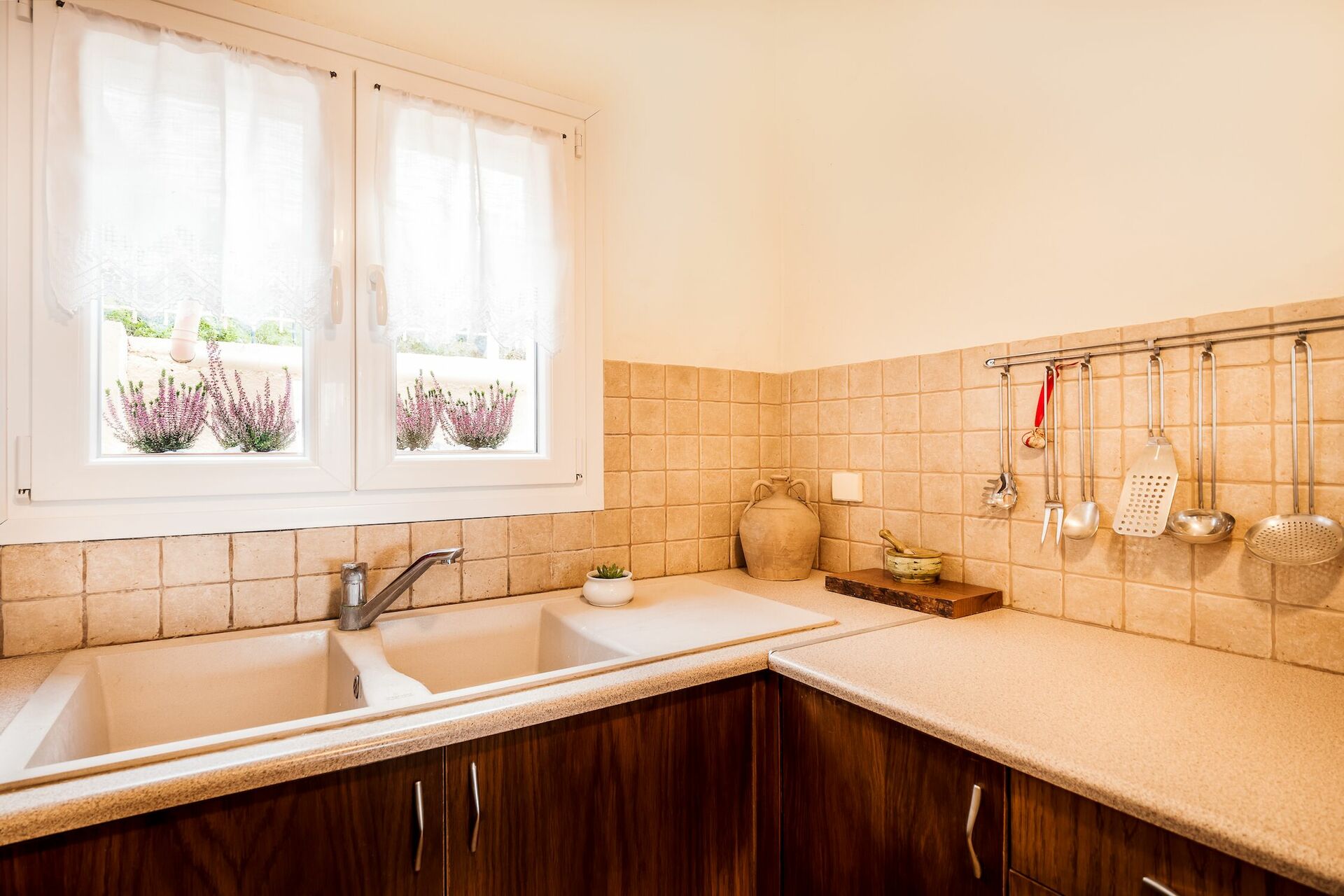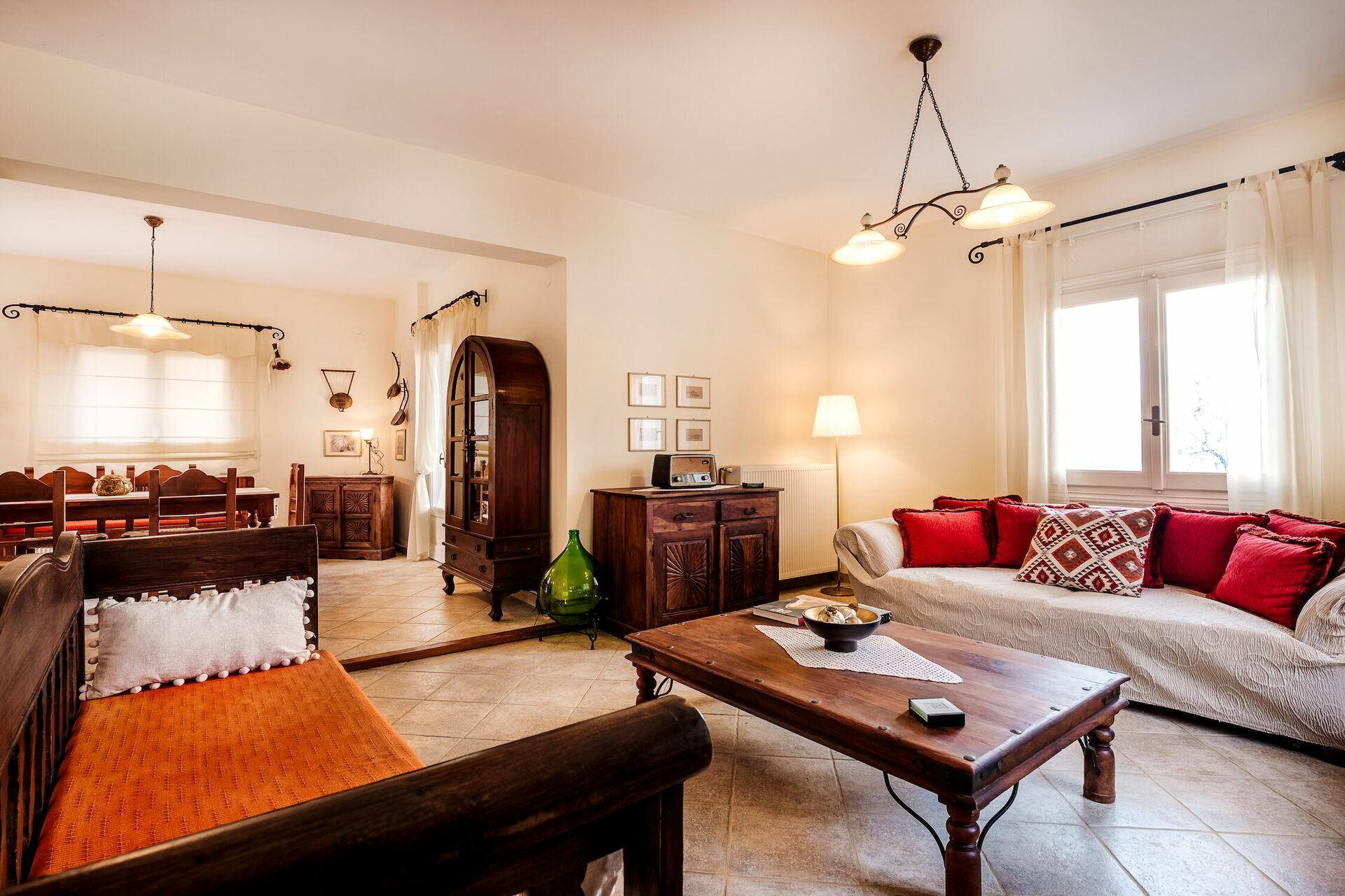 Huset er over 2 etasjer og tilbyr en vakker stil som blander tradisjonelle møbler med moderne elementer og bekvemmeligheter. Villaen har 3 soverom, 2 bad, 1 wc, privat basseng og kan komfortabelt sove opptil 7 gjester med uslåelig verdi for pengene. I første etasje er det en stor salong (med sofaer, sovesofa, spiseplass, terrassedører til utsiden) samt et fullt utstyrt kjøkken og et toalett. Vakre tretrapper fører opp til andre etasje hvor det er et stort dobbelt soverom, et innbydende dobbelt soverom, et stort soverom med eget bad og et ytterligere familiebad med badekar. Soverommene har aircondition og fantastisk utsikt over landskapet, havet og fjellene bak.