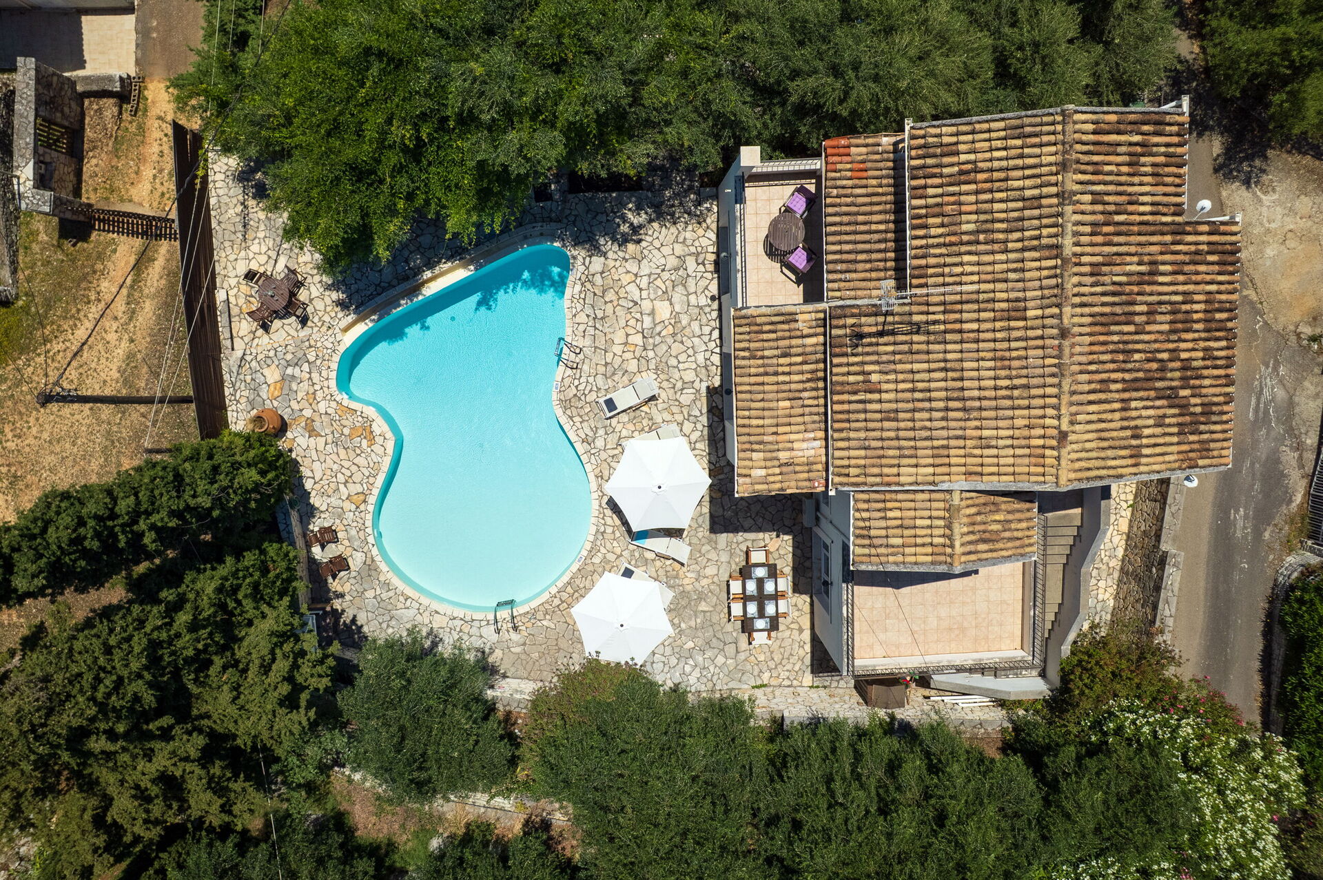 Selv om huset ligger i landsbyen Kassiopi, er man sikret privatliv takket være sypressene og oliventrærene som omgir huset.