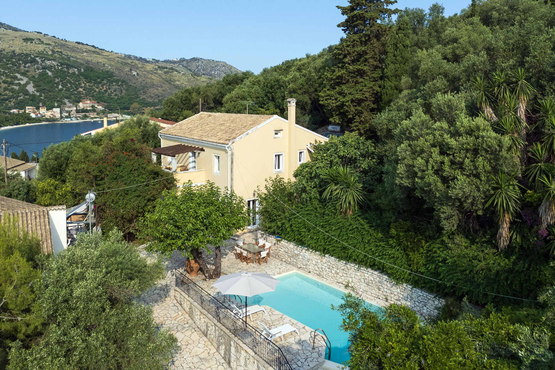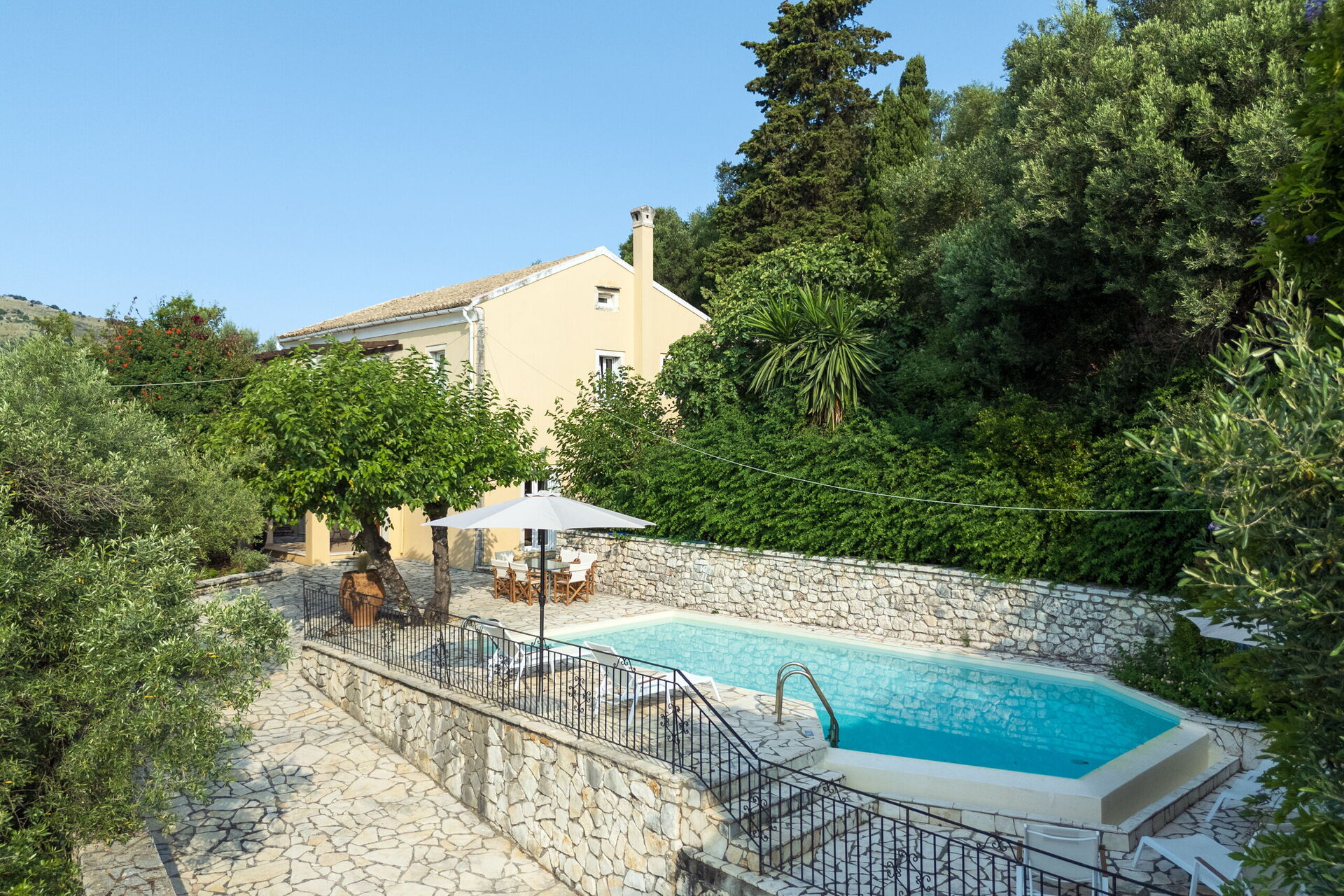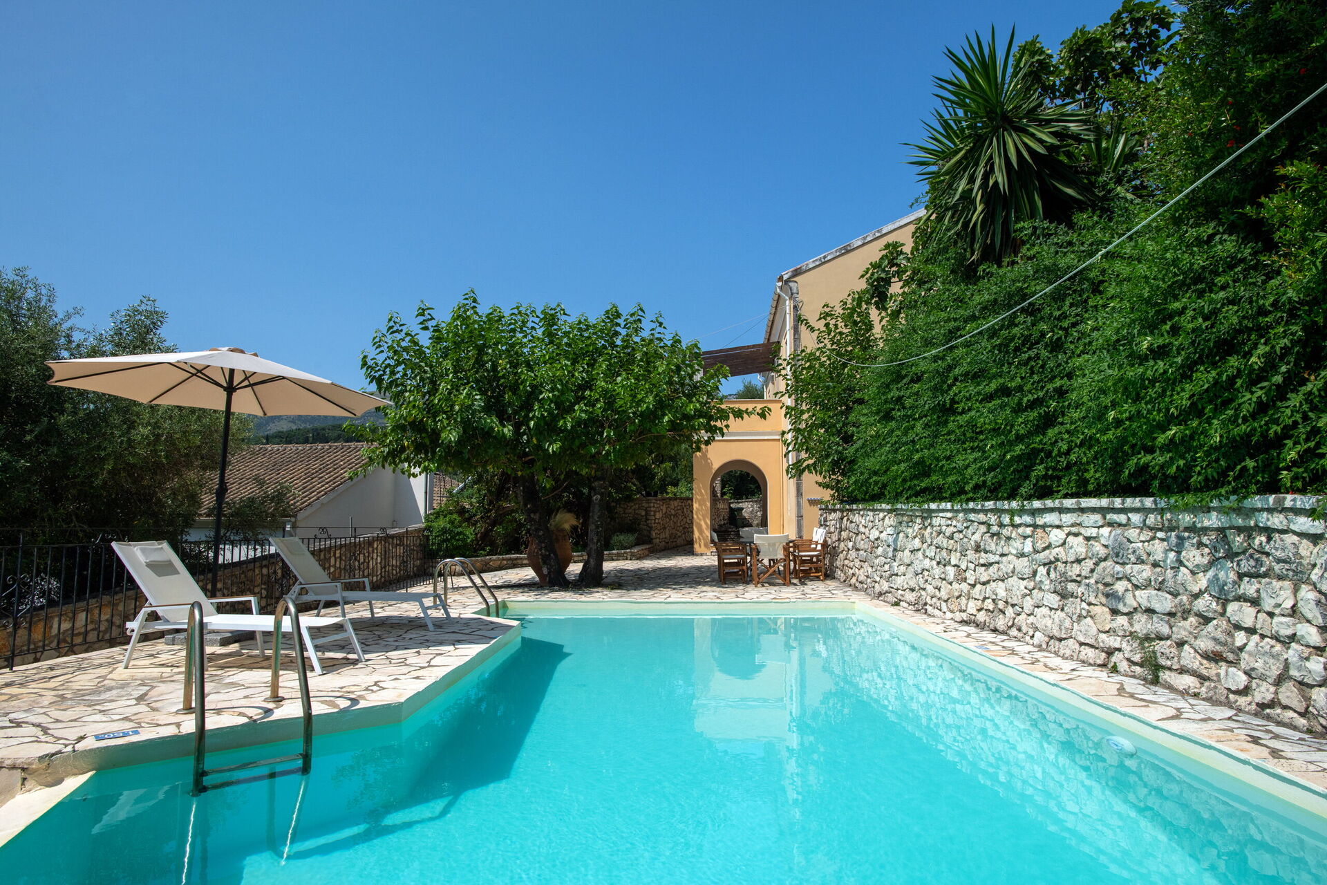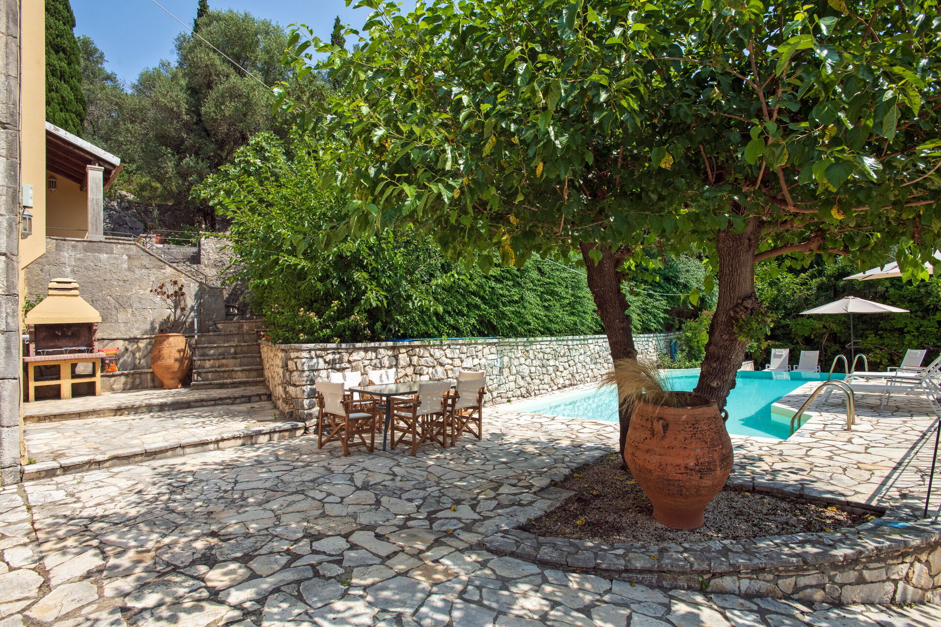 På uteområdet er det et fantastisk oppvarmet svømmebasseng slik at man også kan bade i de kjøligere årstidene. Her finner man også en grillplass, innredet med bord og stoler for å kunne spise ute sammen med familie eller venner. Selv om huset ligger i landsbyen Kassiopi, er det godt skjermet takket være sypresser og oliventrær rundt huset slik at man er sikret privatliv.
