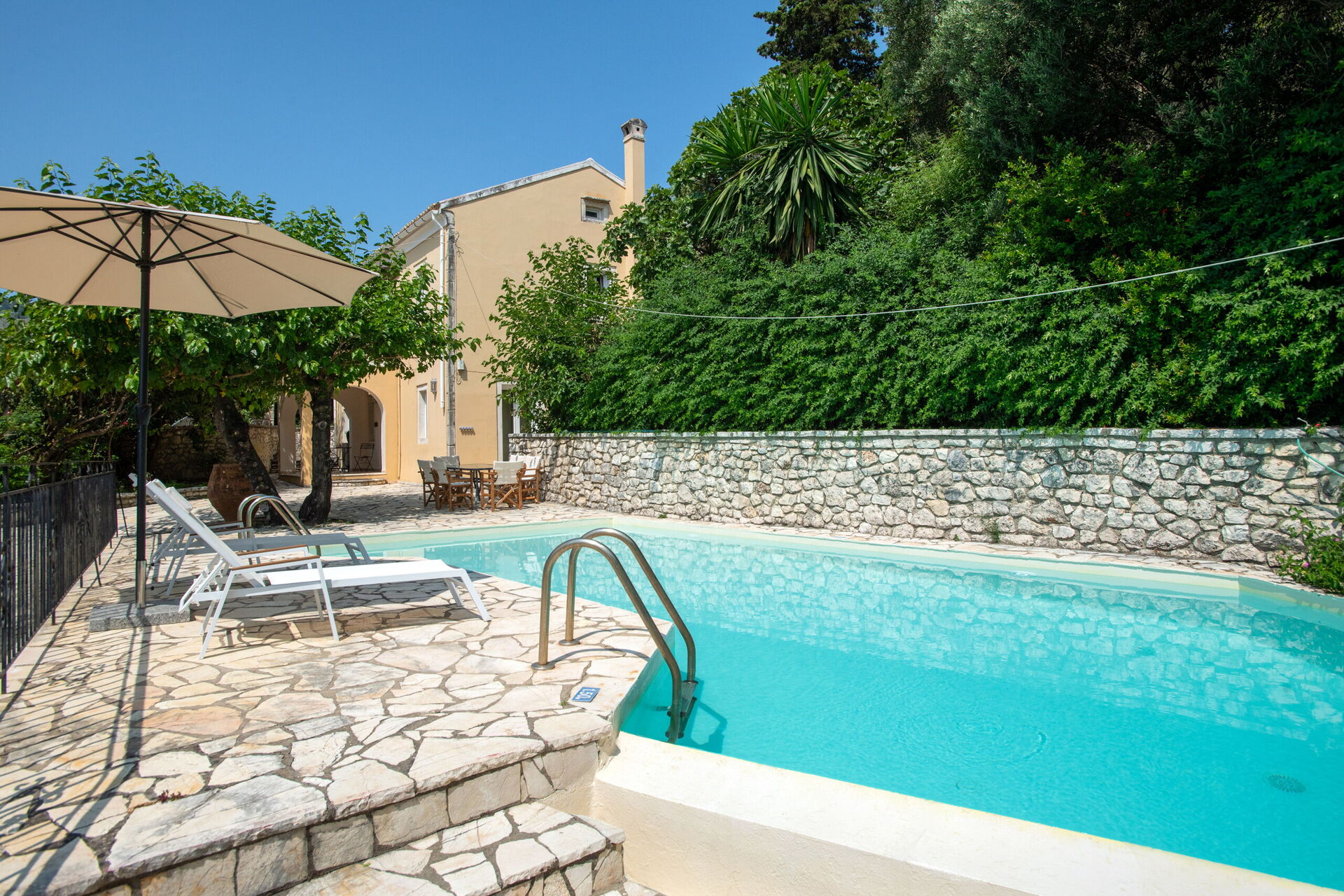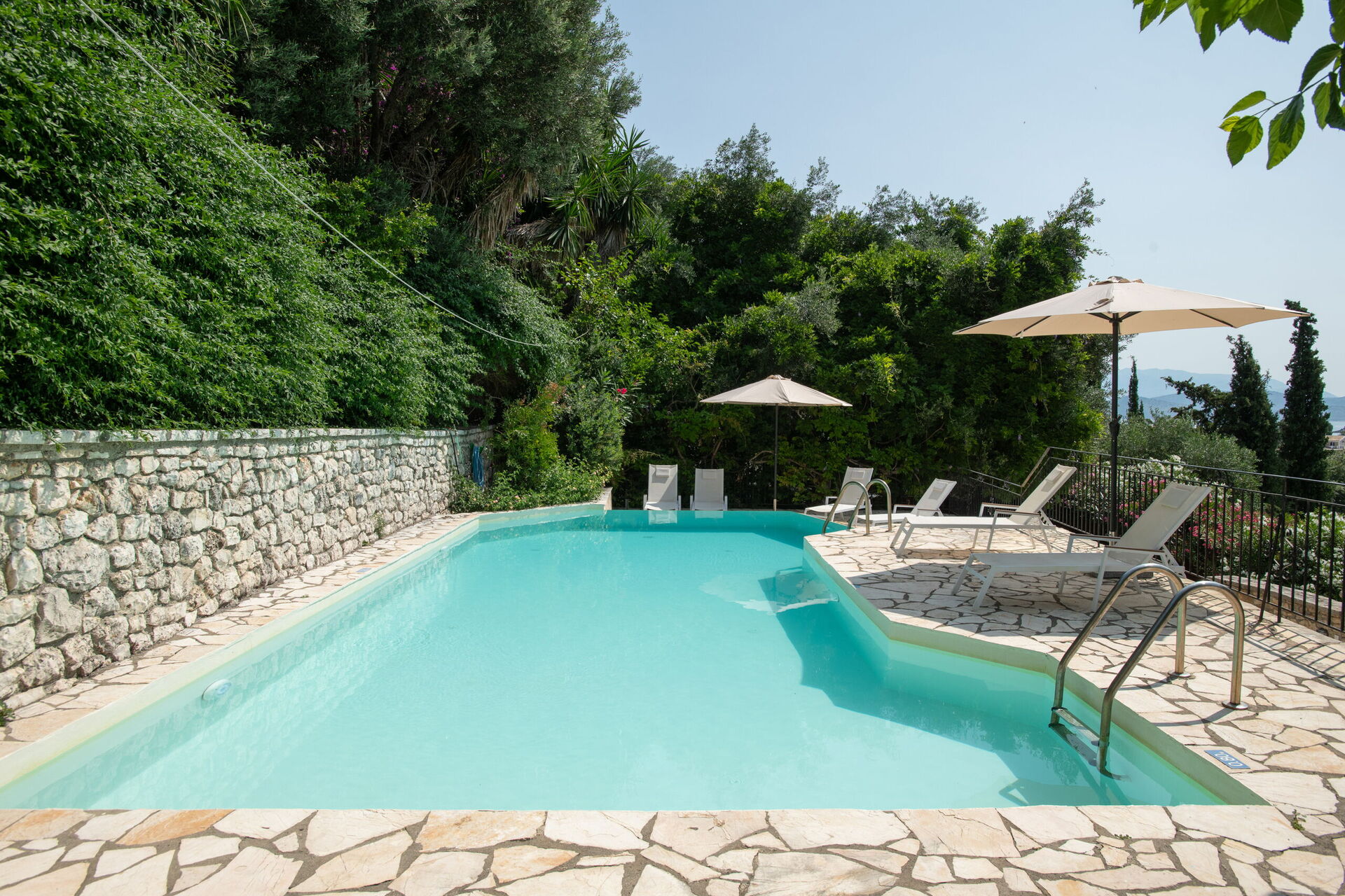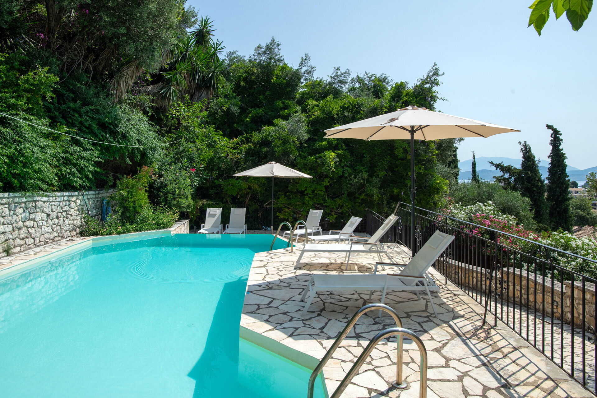 På uteområdet er det et fantastisk oppvarmet svømmebasseng slik at man også kan bade i de kjøligere årstidene. Her finner man også en grillplass, innredet med bord og stoler for å kunne spise ute sammen med familie eller venner. Selv om huset ligger i landsbyen Kassiopi, er det godt skjermet takket være sypresser og oliventrær rundt huset slik at man er sikret privatliv.