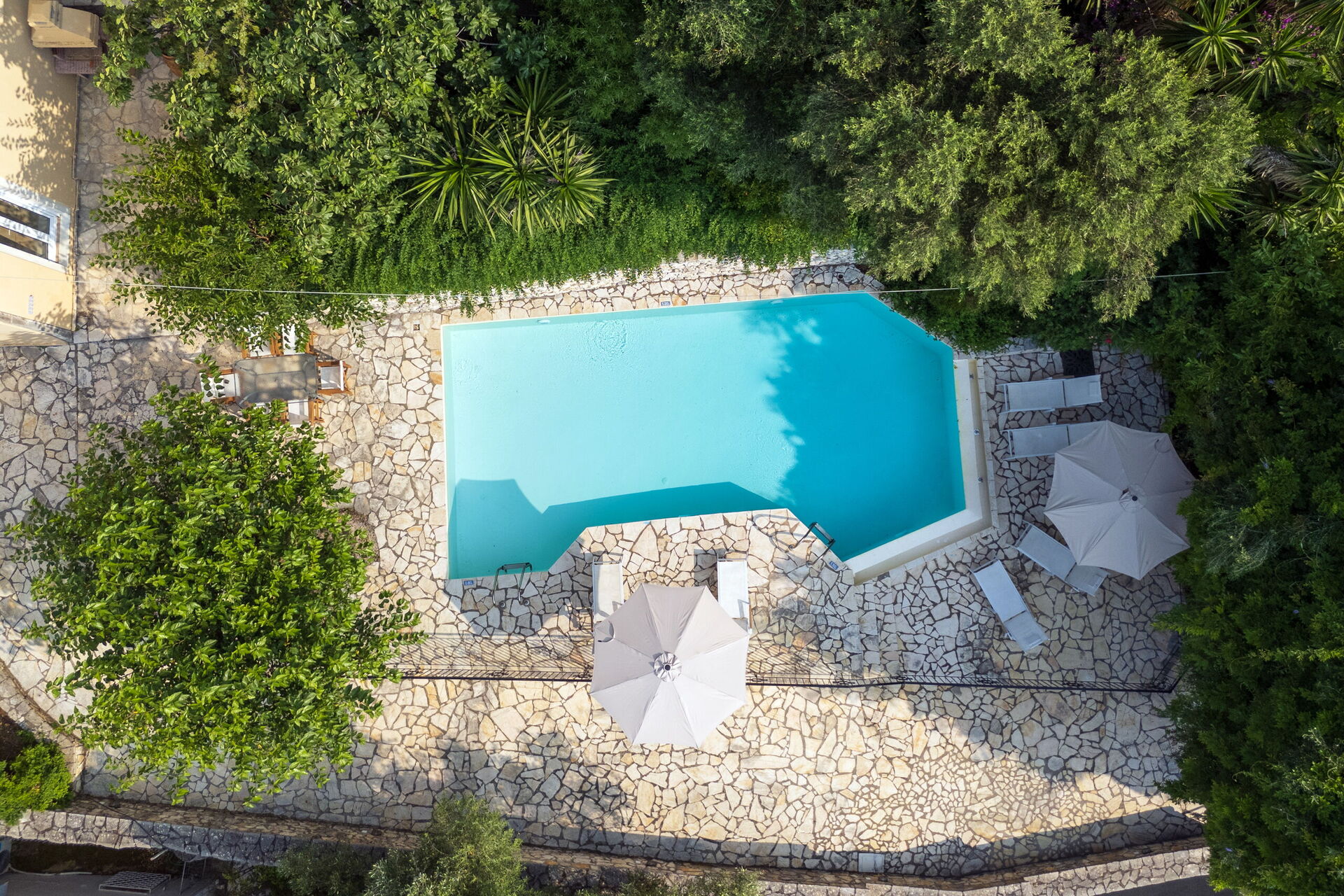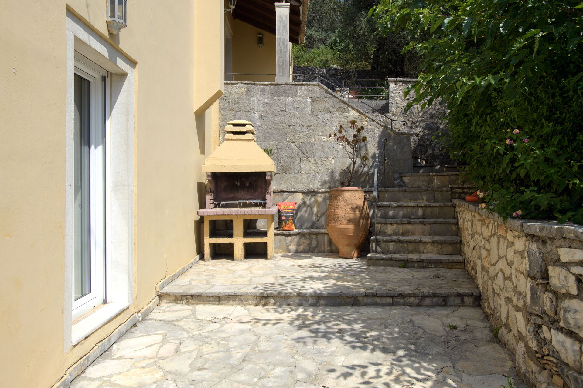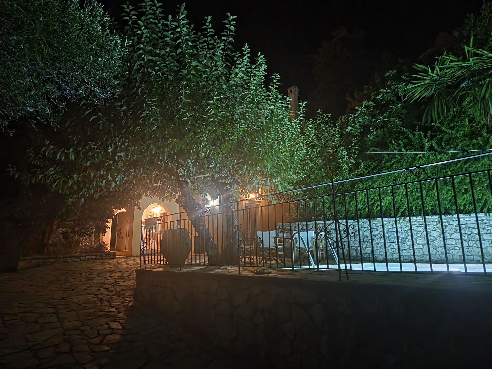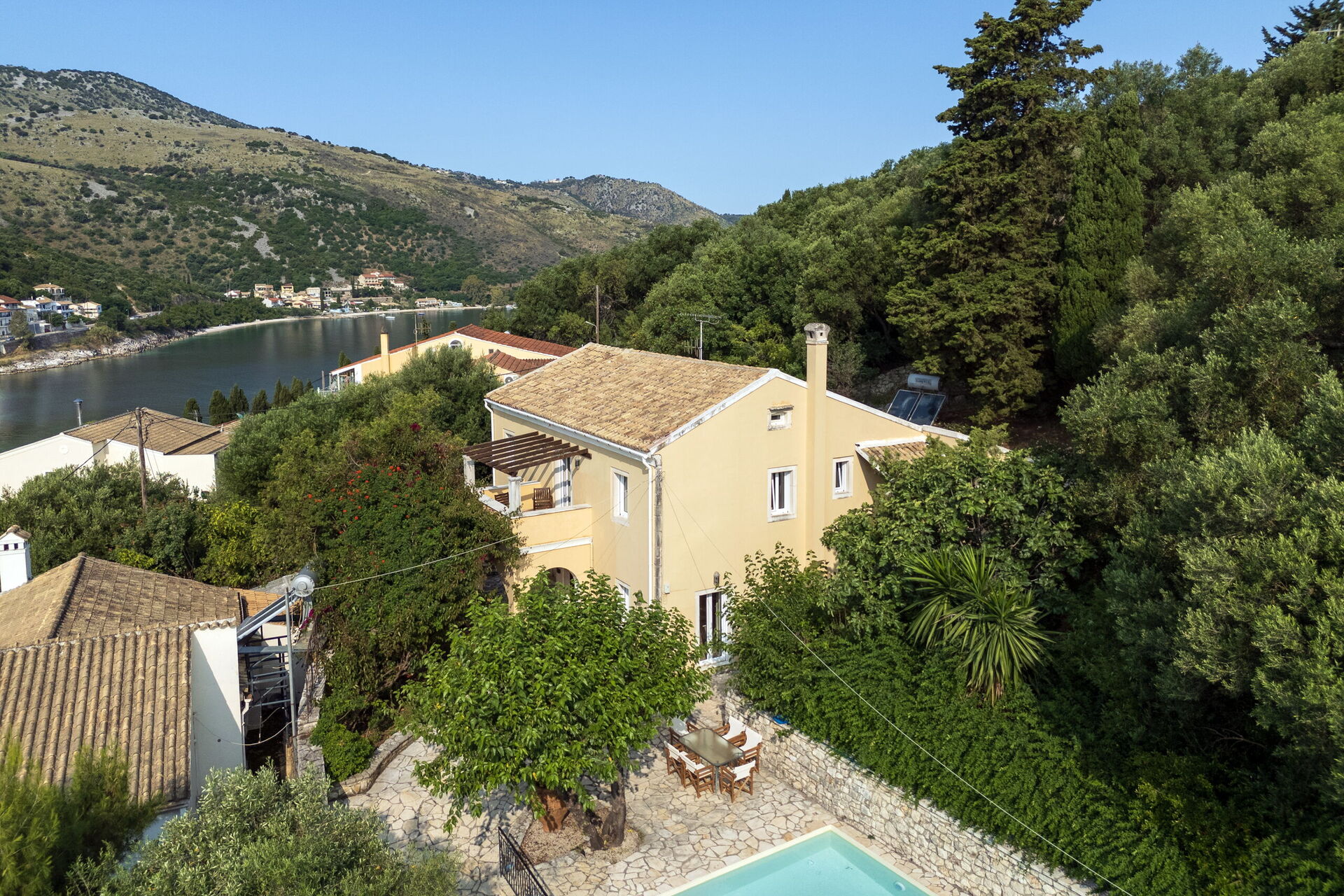 På uteområdet er det et fantastisk oppvarmet svømmebasseng slik at man også kan bade i de kjøligere årstidene. Her finner man også en grillplass, innredet med bord og stoler for å kunne spise ute sammen med familie eller venner. Selv om huset ligger i landsbyen Kassiopi, er det godt skjermet takket være sypresser og oliventrær rundt huset slik at man er sikret privatliv.