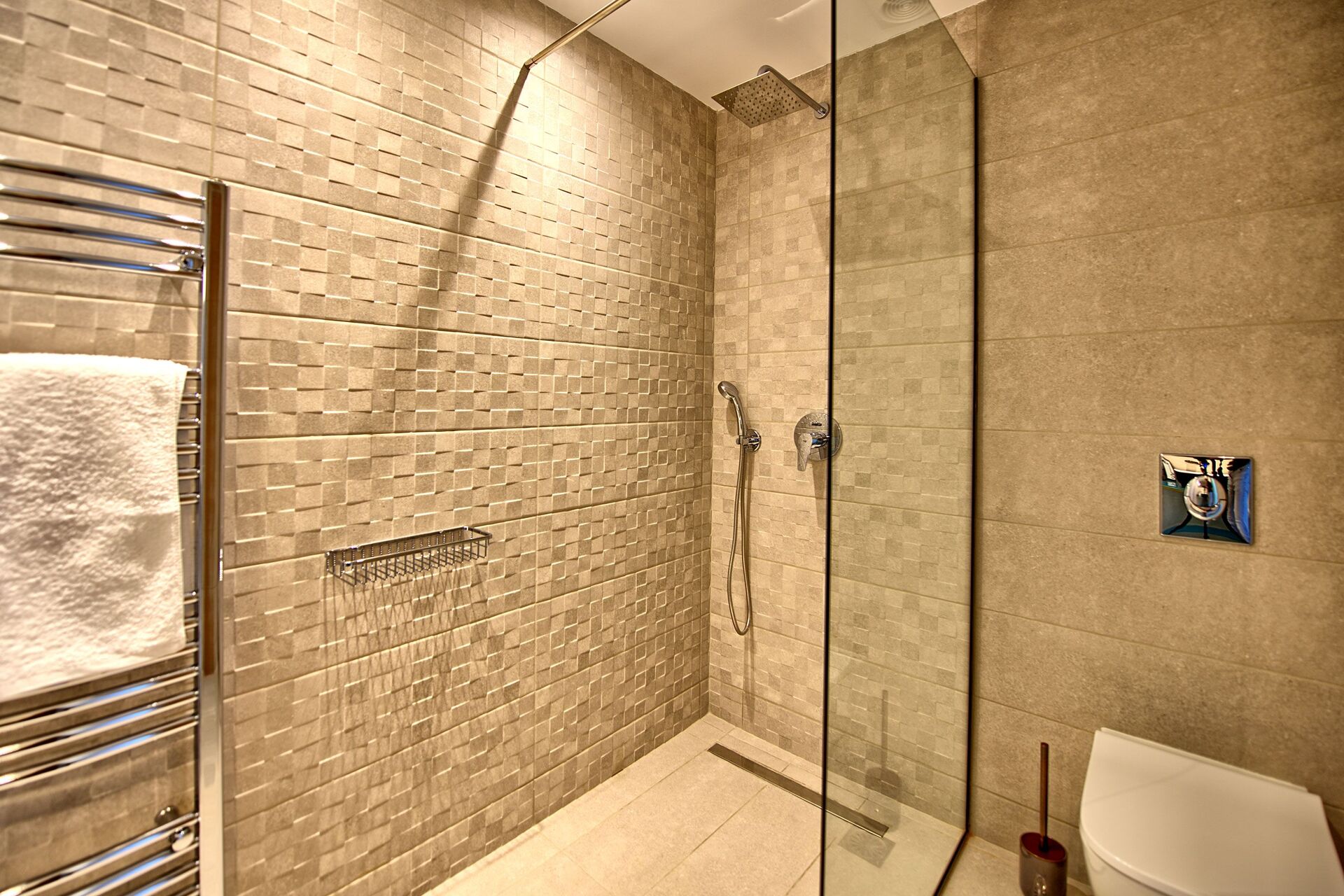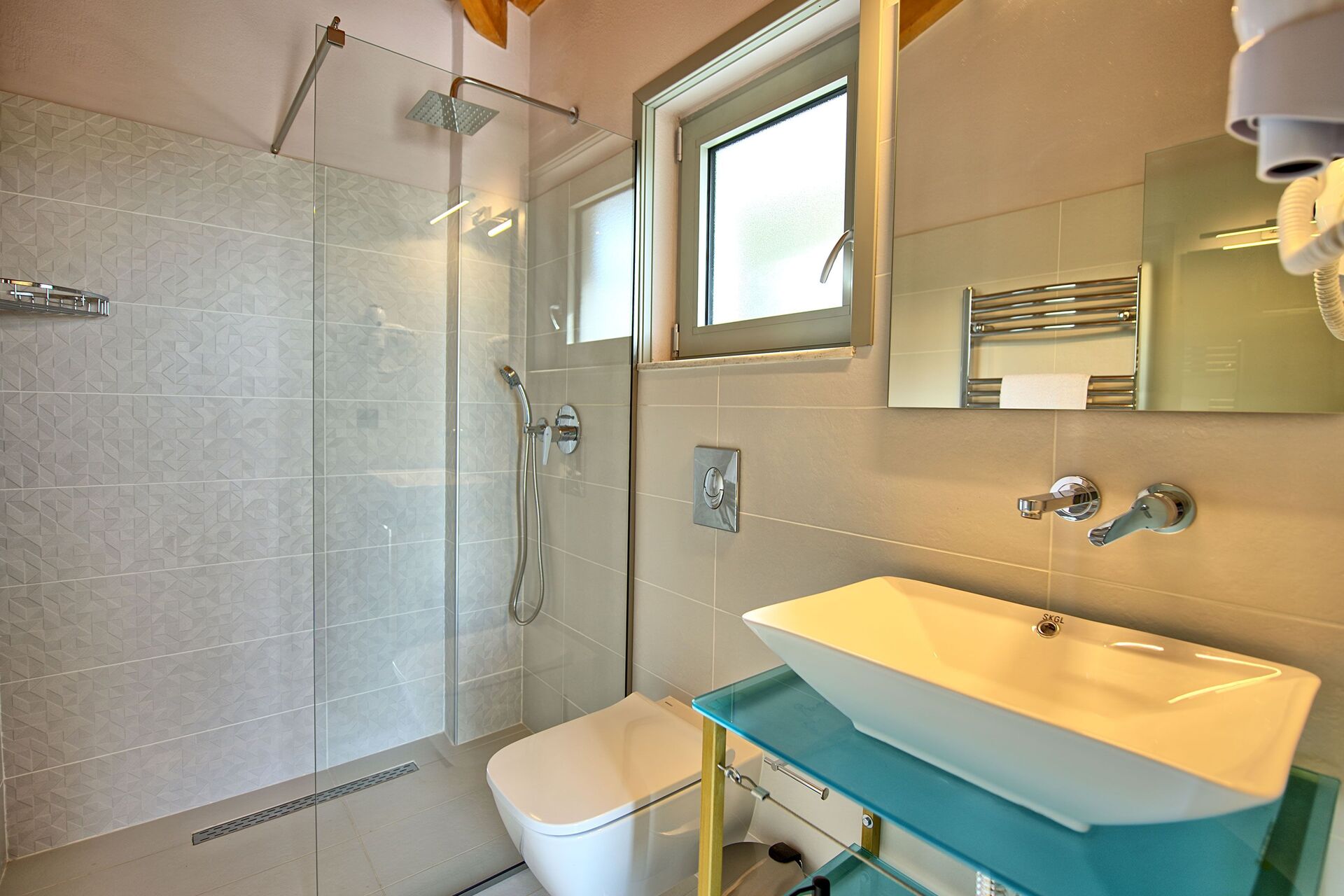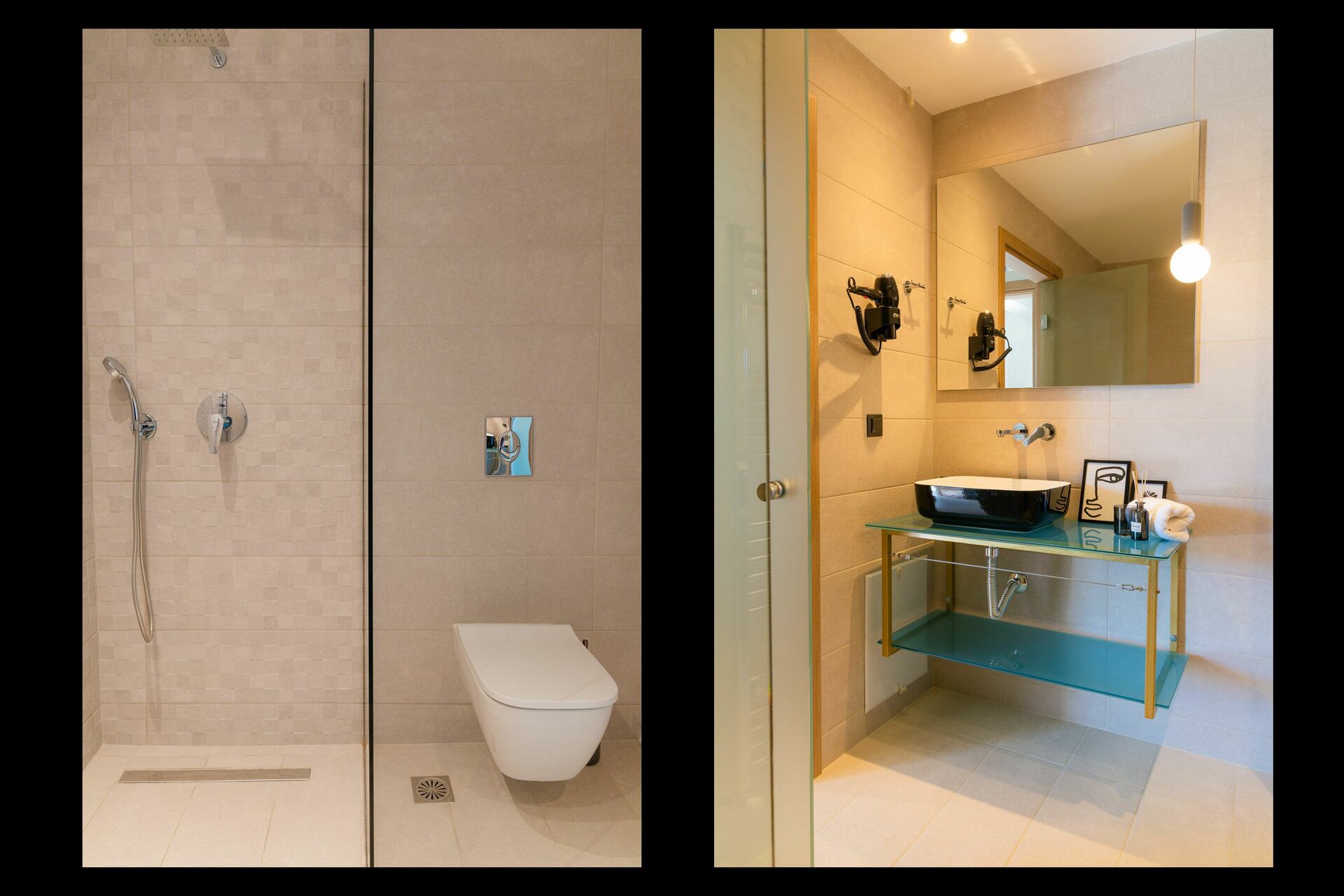 2 dobbeltrom, begge med eget bad med dusj, og tilgang til hage og basseng
