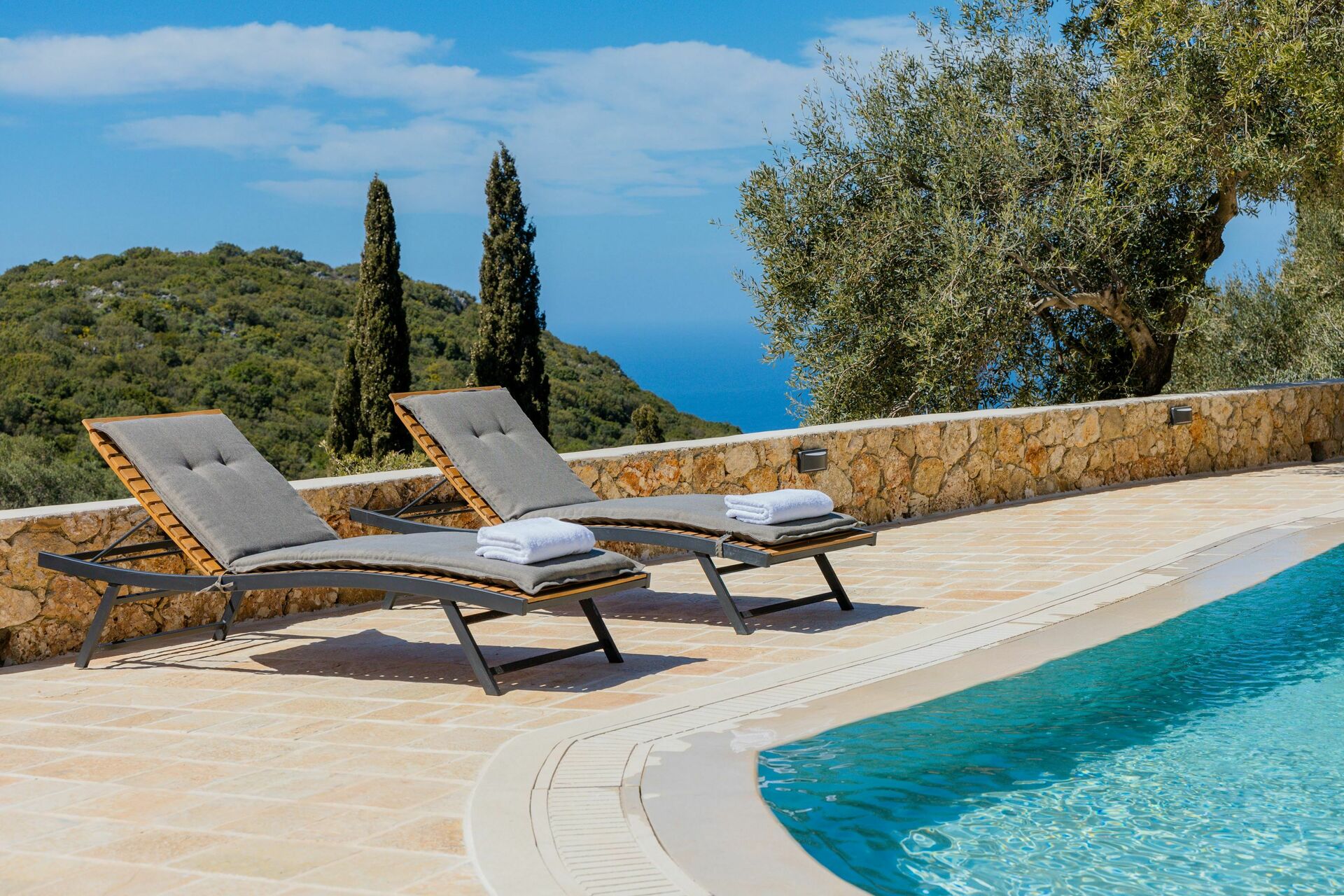 I hagen er det nydelige bassenget og basseng dekket er innredet med solsenger og parasoller for å nyte solfylte Korfu-dager.