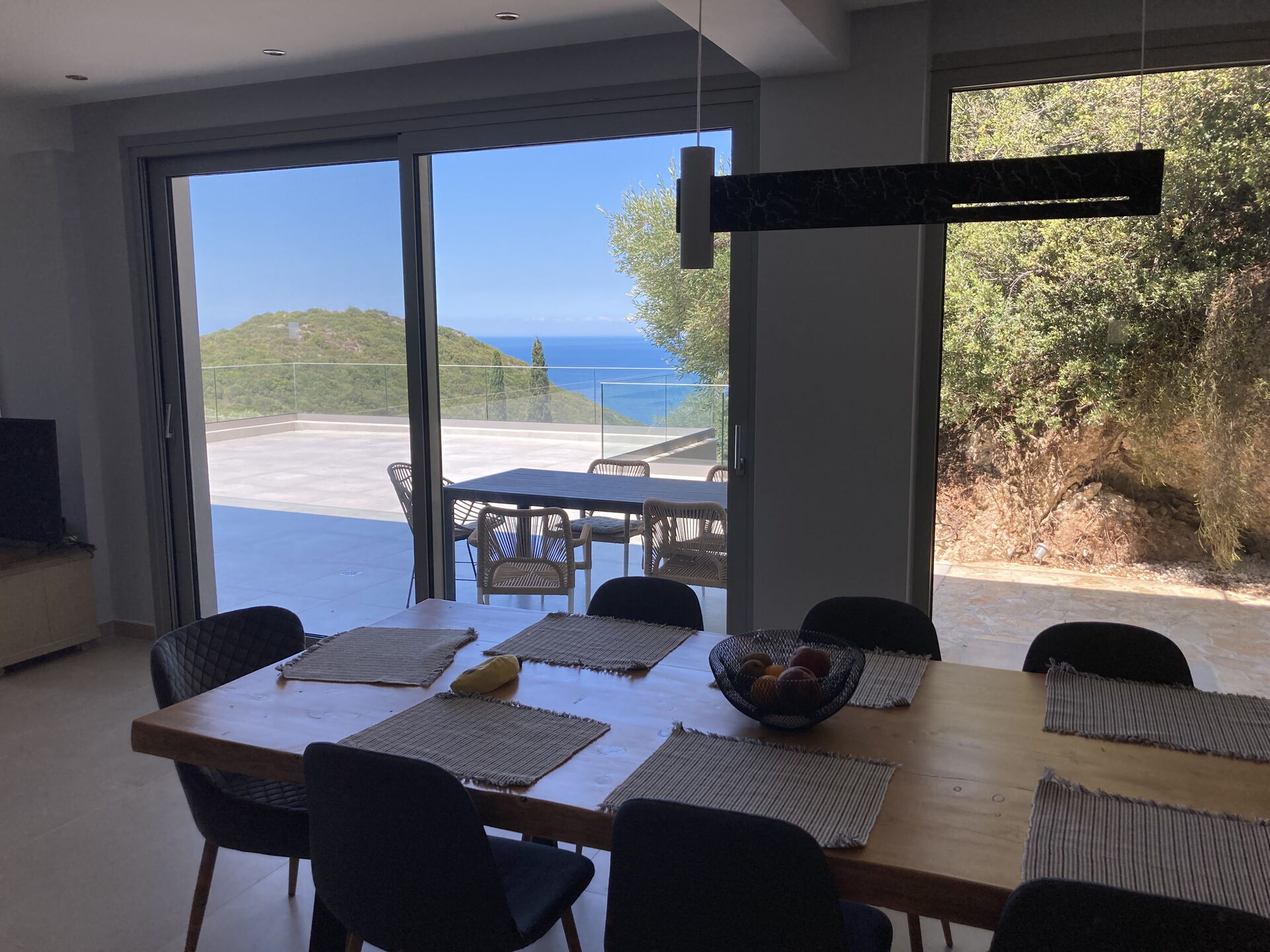 A sensational villa completed in 2022 in an absolute quiet location. Large outdoor pool with elegant lounging areas. 2 spacious bedrooms with each en-suite bathroom on the ground floor - at the level of the pool. In addition, a utility room with washing machine and ironing facilities. On the upper floor a fantastic open, overfully equipped kitchen. integrated into an enormously large and all-round glazed living-dining area. Before it had a view of the pool, forest, the mountain village of Krini and the sea a huge terrace with a large dining table. In the DG another bedroom with en-suite bathroom and also huge terrace. Accessible via a somewhat hazardous but very layy metal spiral staircase. Air conditioning everywhere and opaque curtains. Theodora and her husband Ioannis took great care of us and responded to all interim requests quickly and competently. Makrades village About 5 minutes on foot, Theodora's brother runs an excellent tavern (Tomateli) - also quite new and therefore not listed in all guides. The house is located on approx. 300 m above sea level and can be reached via a mountain road. Accordingly, the way to the sea is either only motorized or a bit laborious in a descent of at least 30 minutes.