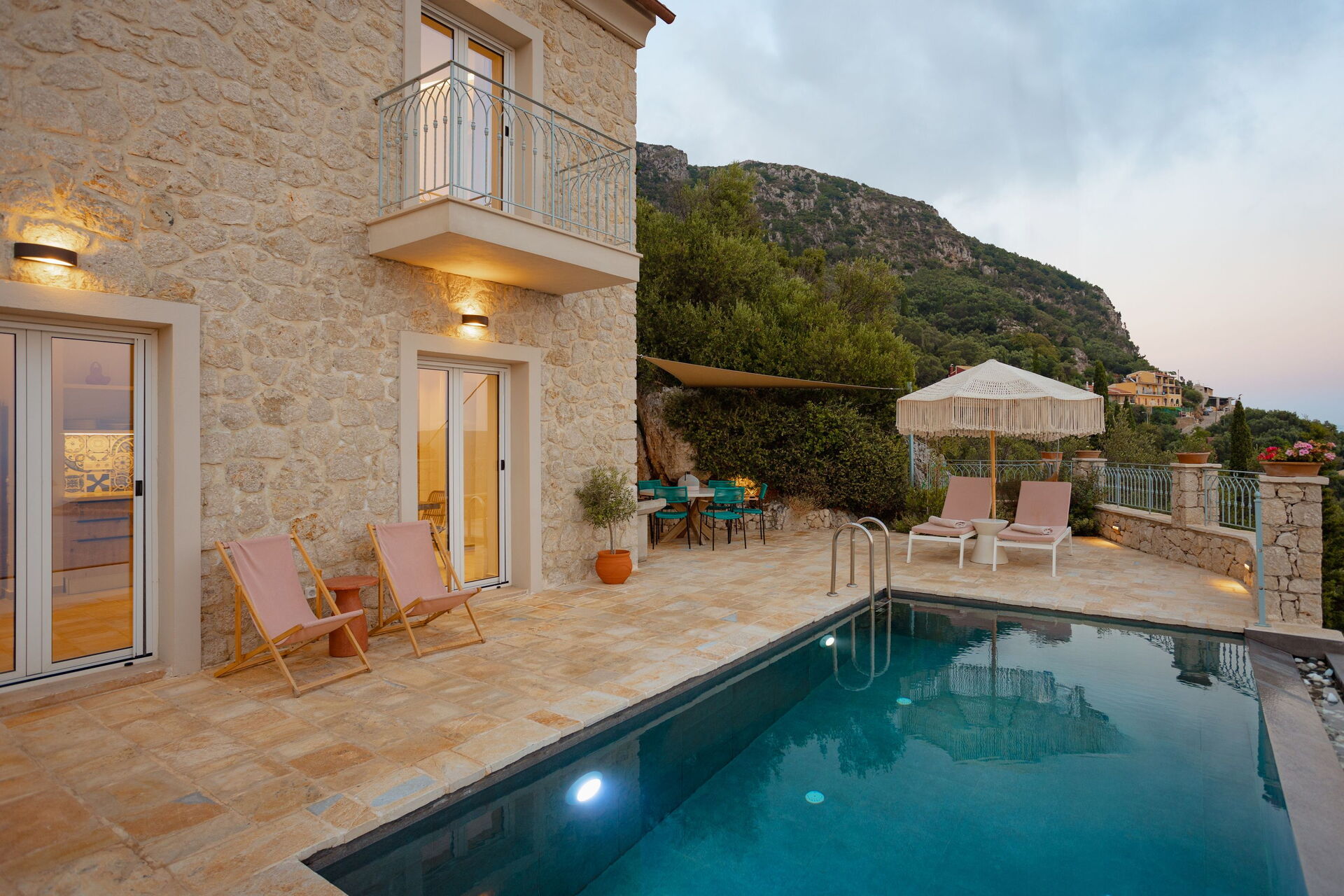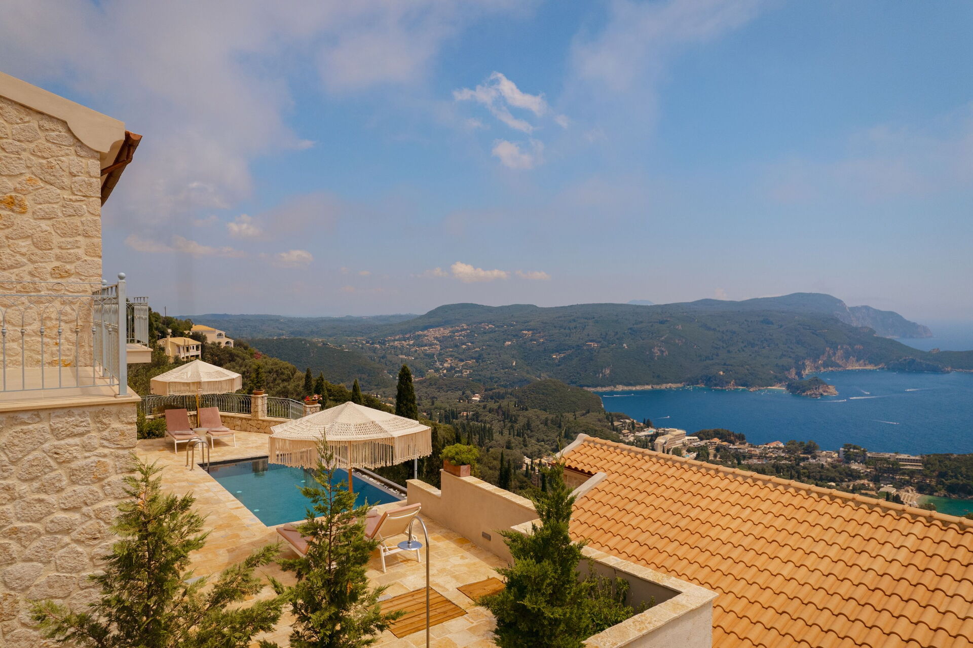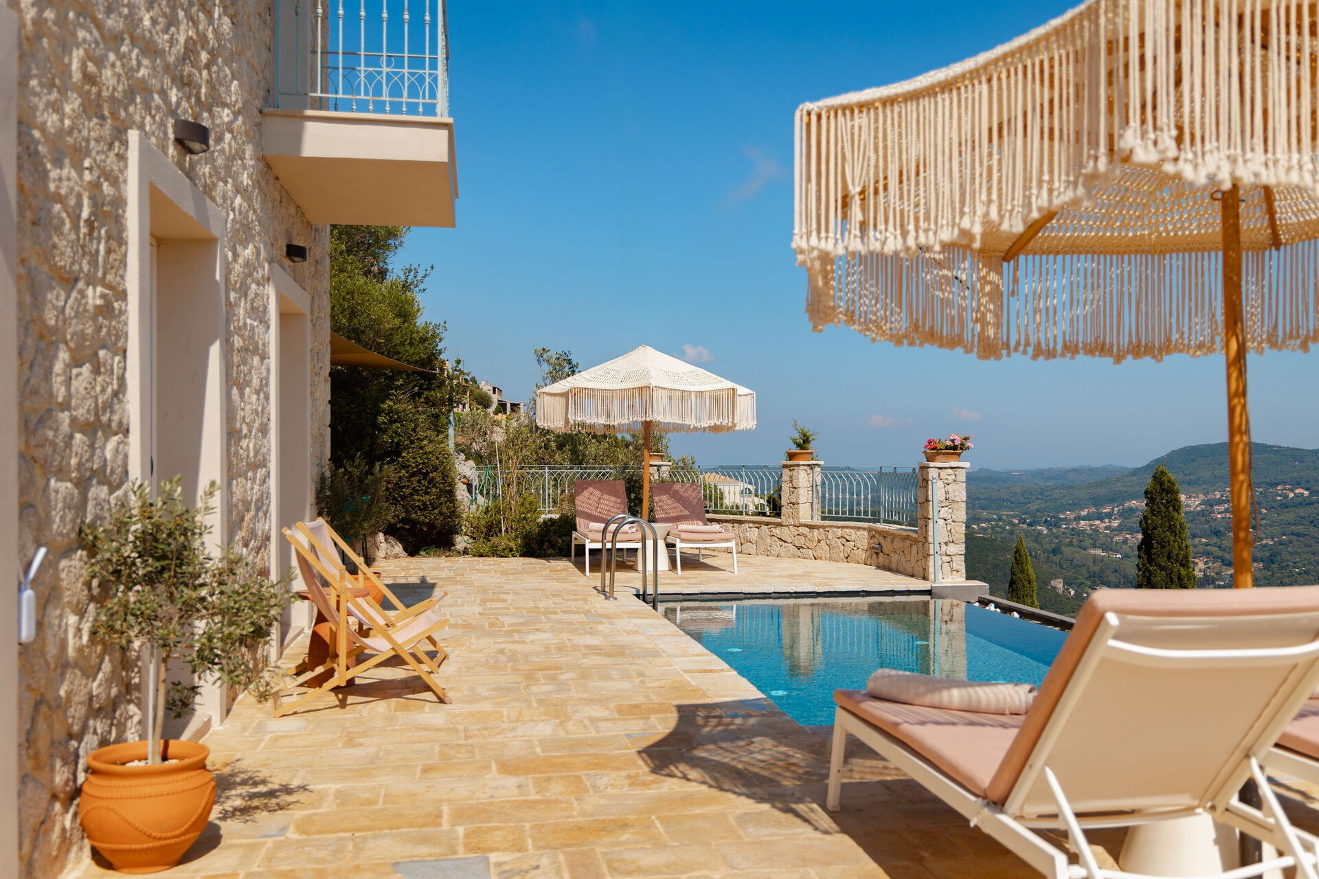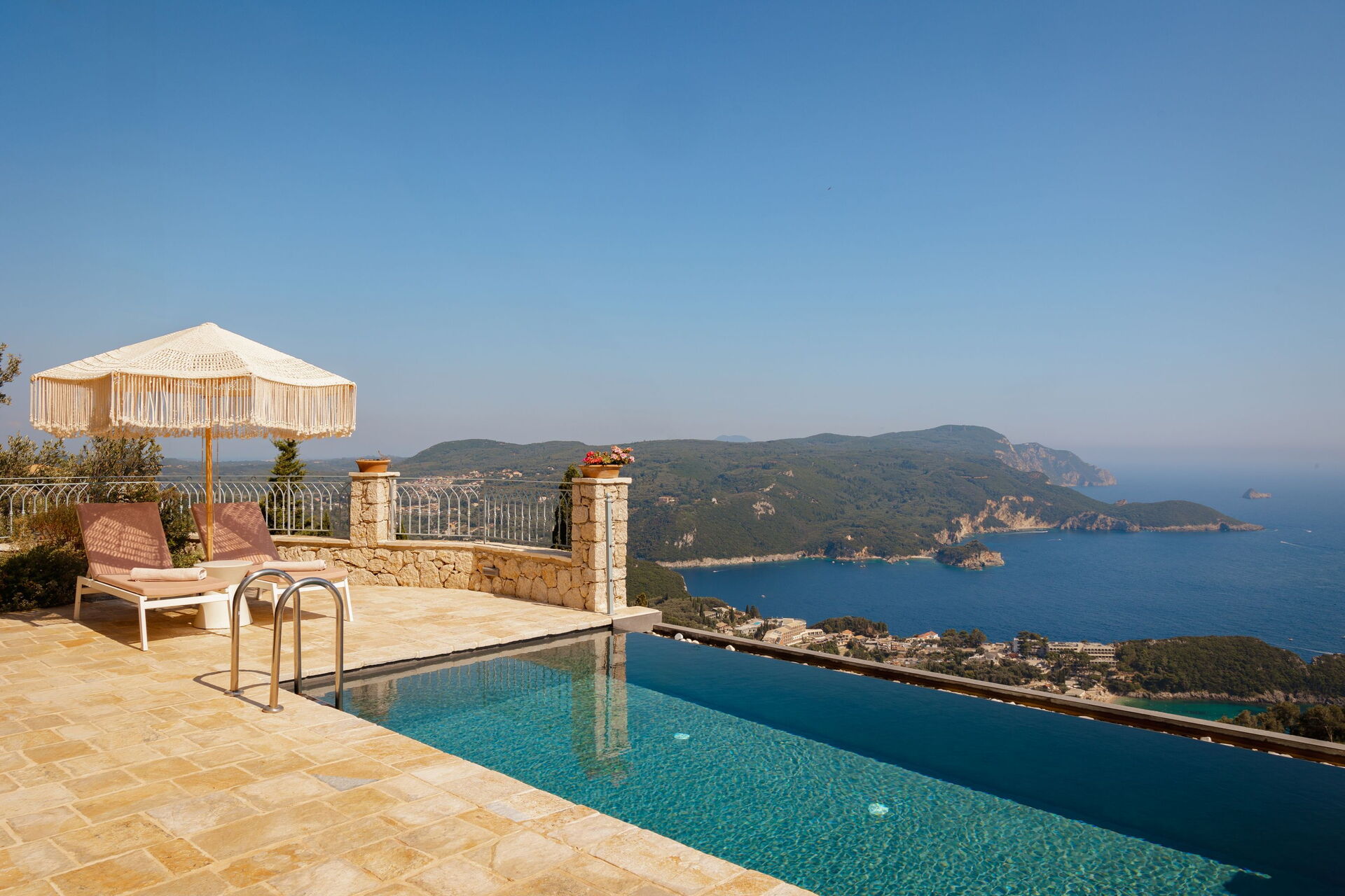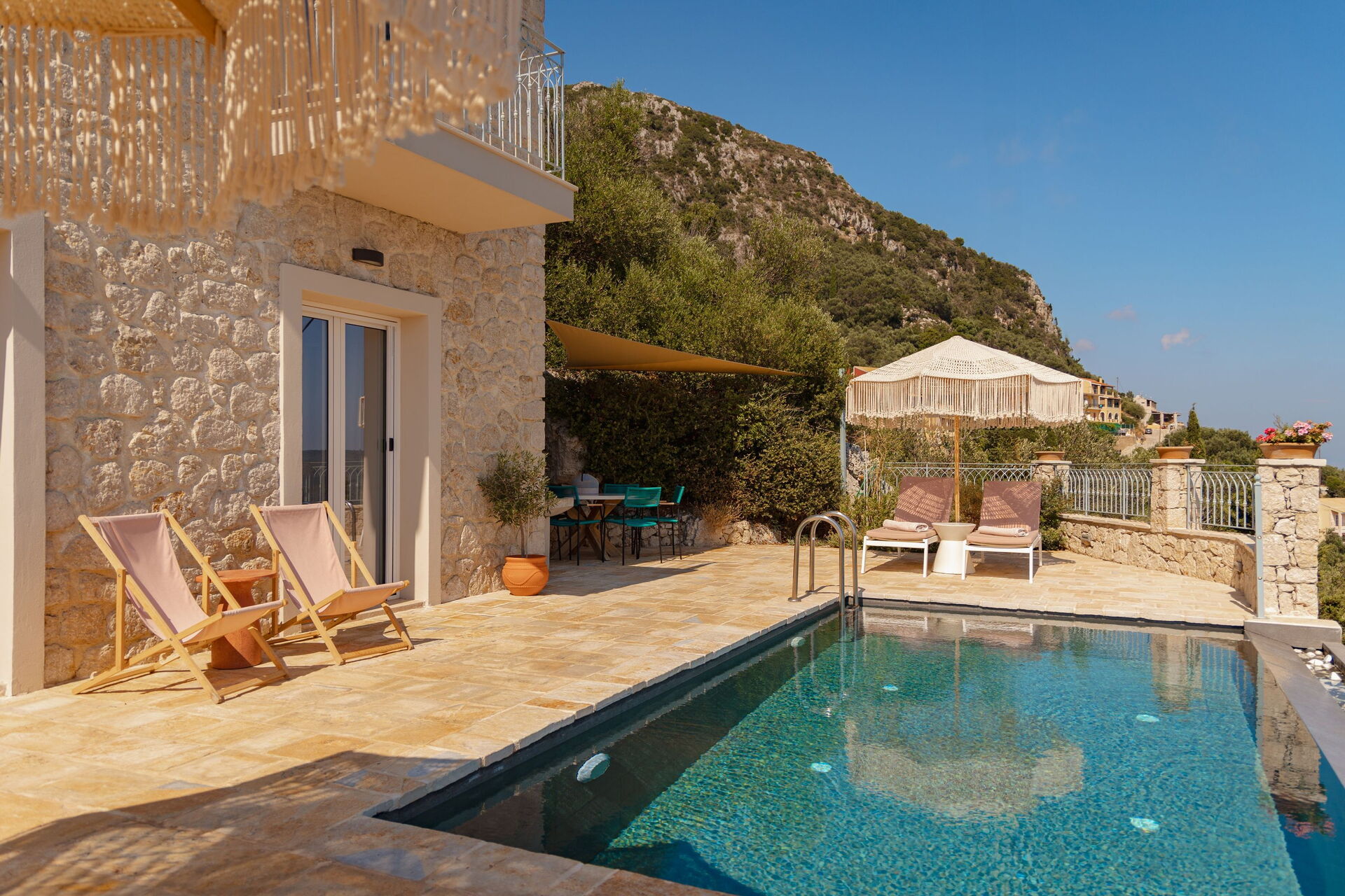 På det panoramiske uteområdet finner du et vakkert og privat svømmebasseng med bassengdekk, hvor du kan nyte de solfylte dagene på Korfu.