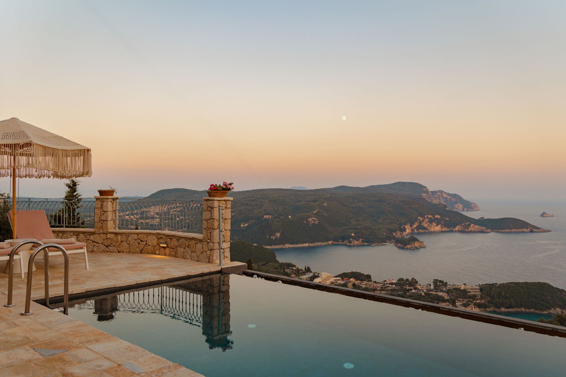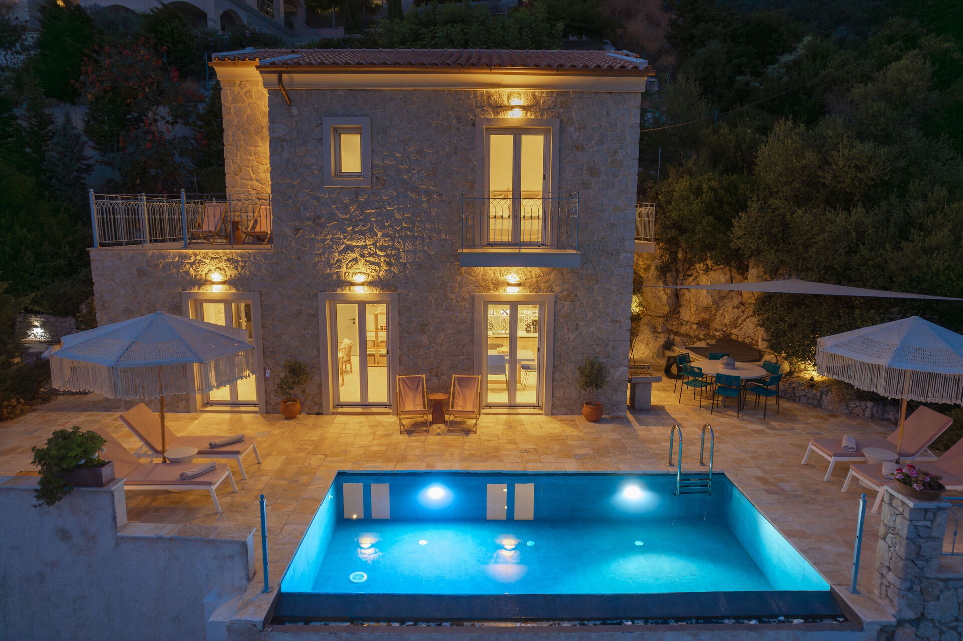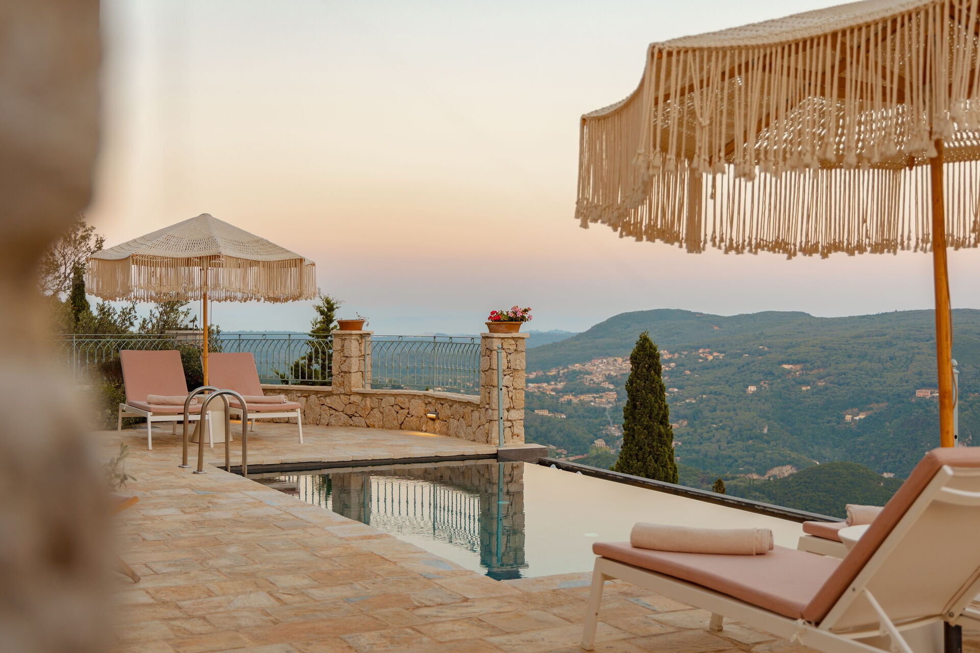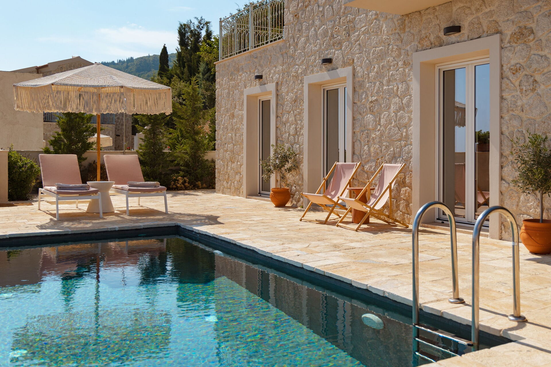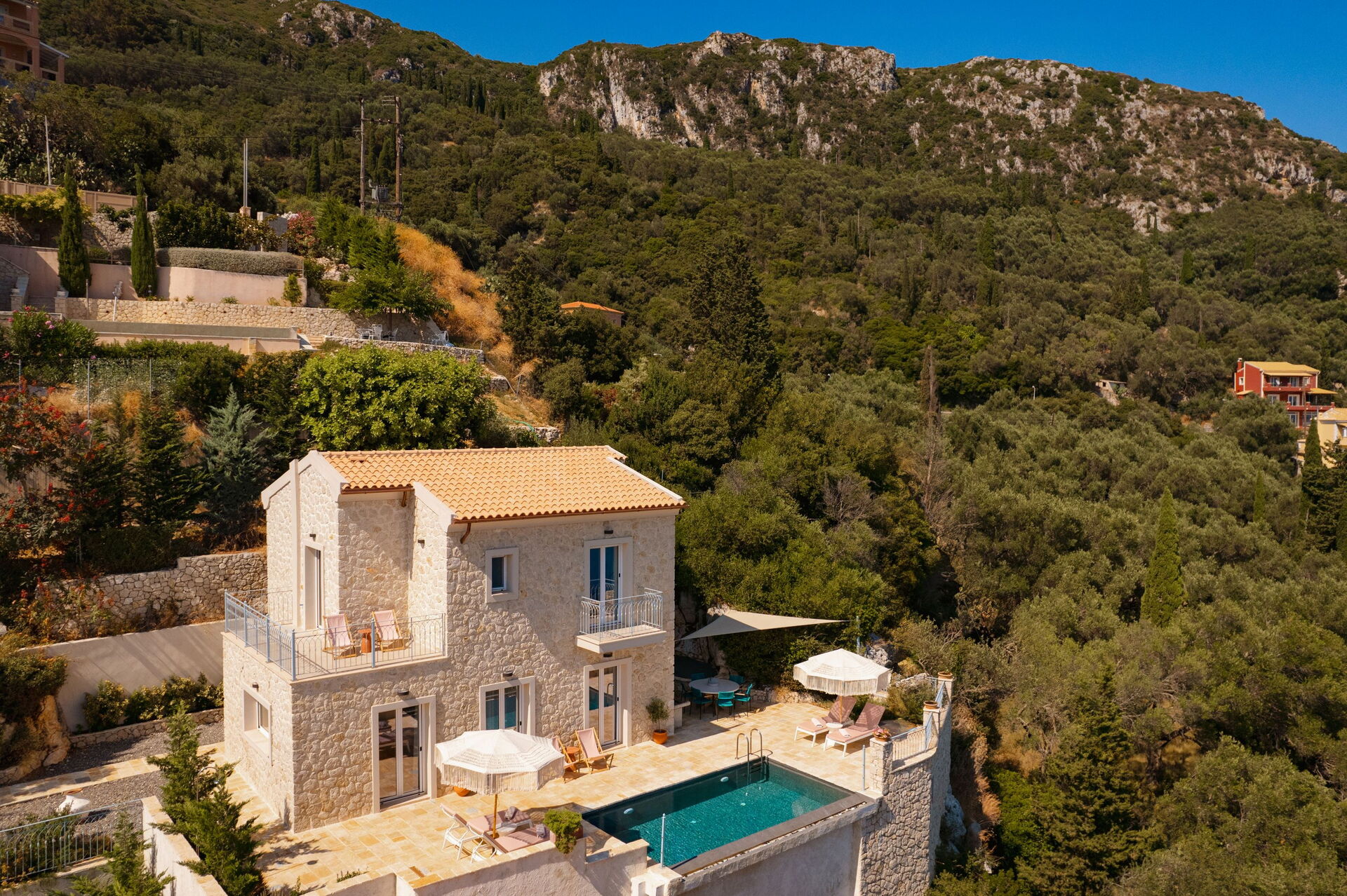 På det panoramiske uteområdet finner du et vakkert og privat svømmebasseng med bassengdekk, hvor du kan nyte de solfylte dagene på Korfu.