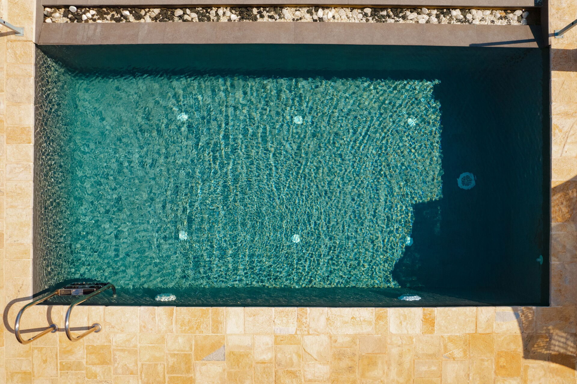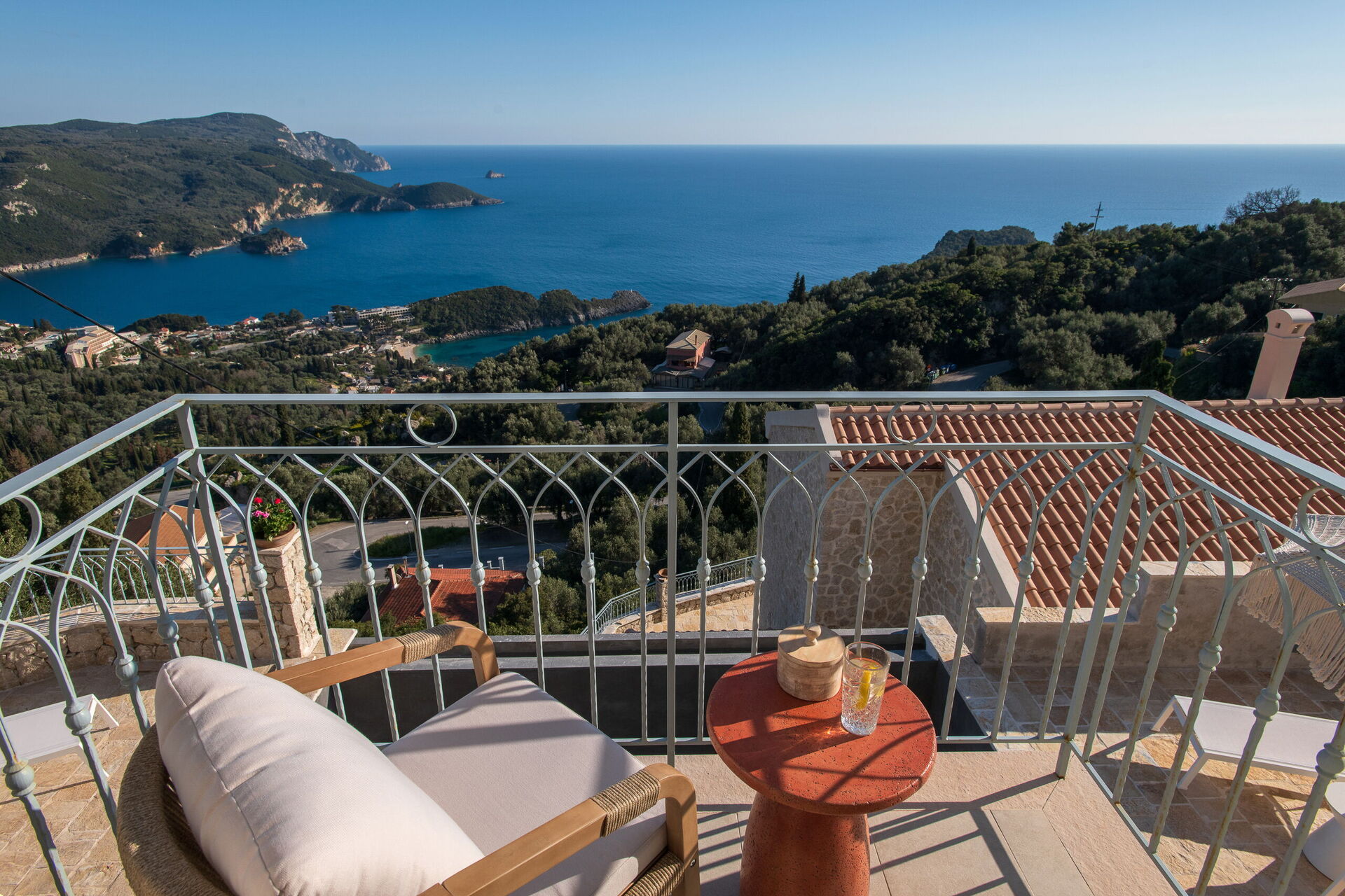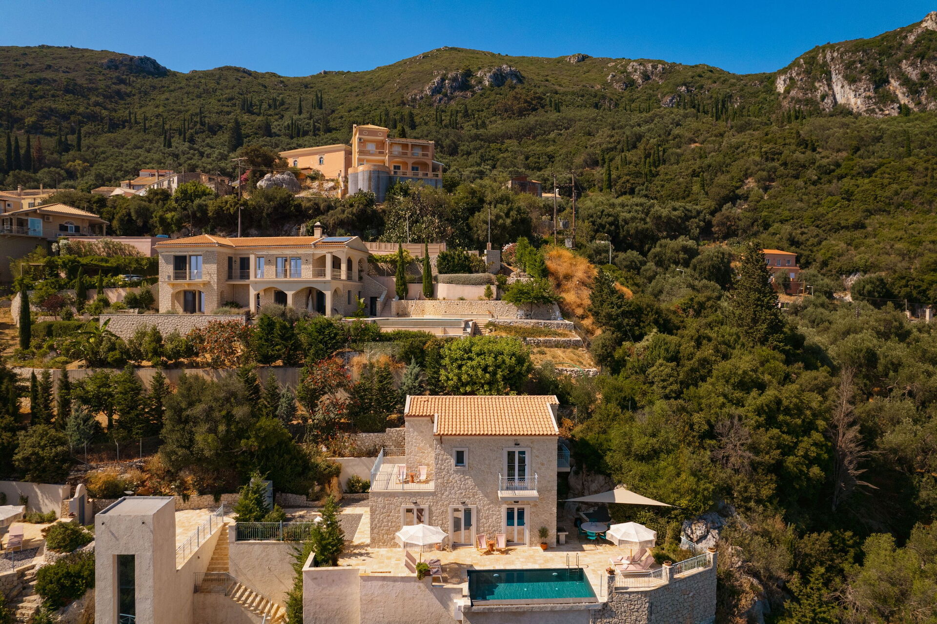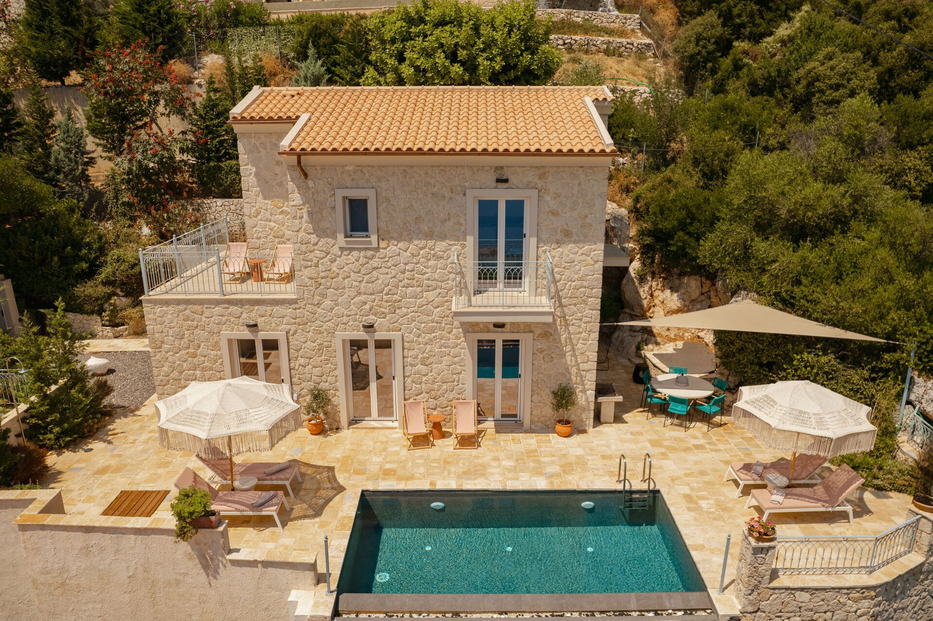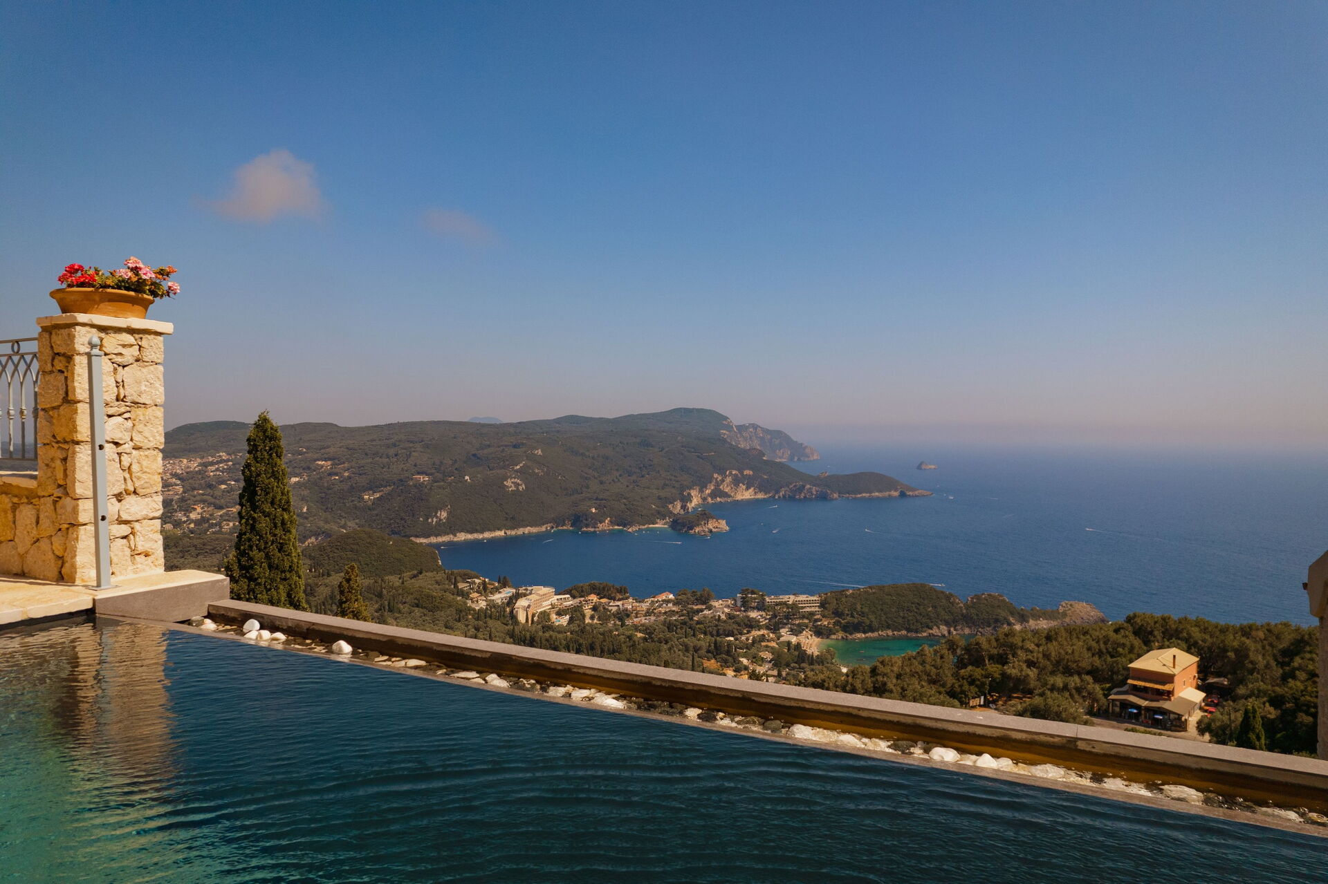 På det panoramiske uteområdet finner du et vakkert og privat svømmebasseng med bassengdekk, hvor du kan nyte de solfylte dagene på Korfu.