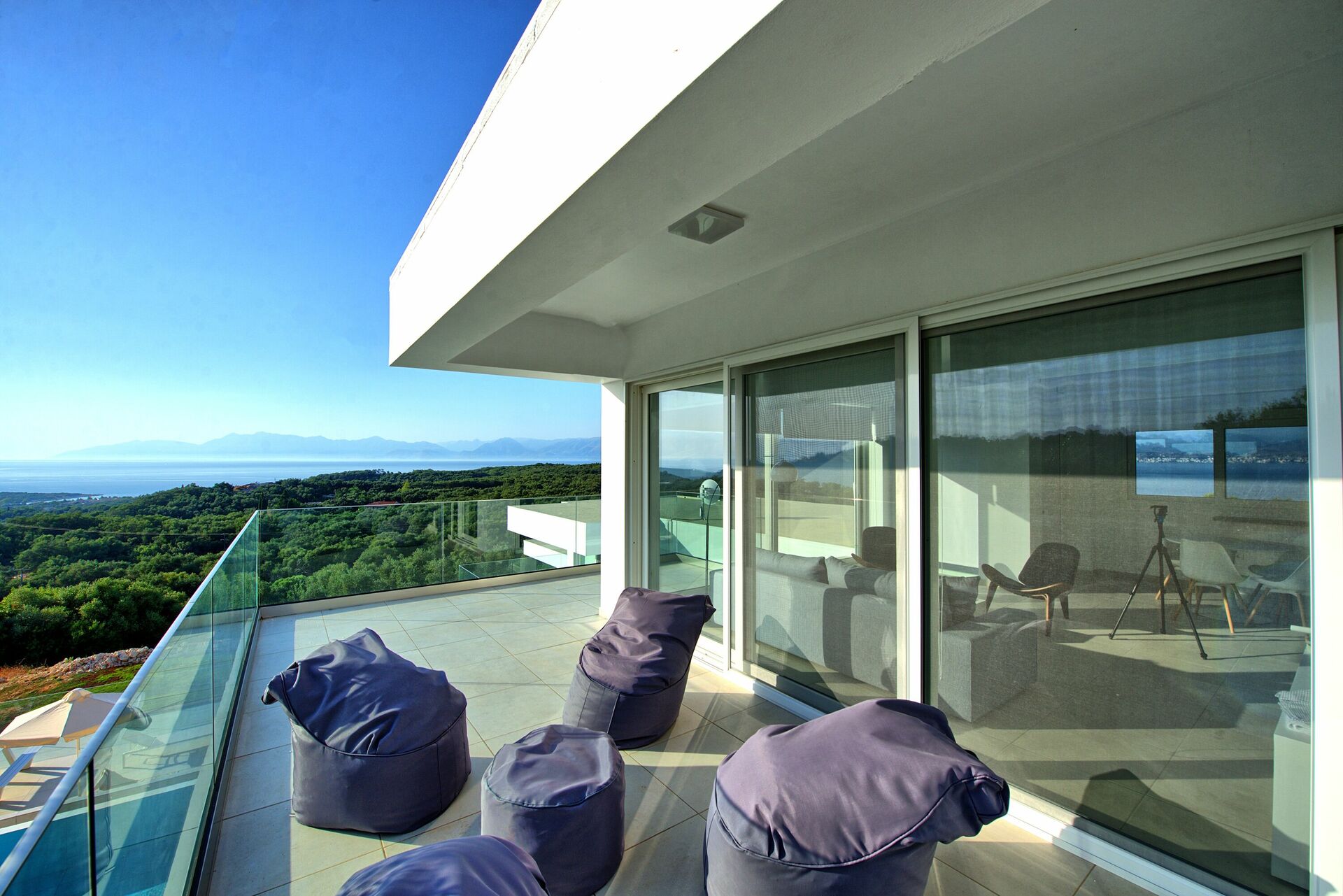 Huset er fordelt over 2 etasjer som er forbundet med en sidetrapp. Villa Athena har store terrassedører, store vinduer og designermøbler, og har derfor lyse rom. I første etasje er det en romslig stue (sofaer, wi-fi, klimaanlegg) med tilstøtende kjøkken (fullt utstyrt) samt 2 soverom (begge med eget bad). Ett soverom har en dobbeltseng + en sofa (som kan gjøres om til en enkel sovesofa i full størrelse), mens det andre soverommet har to enkeltsenger. Overetasjen er identisk med den nedre, bortsett fra at hovedsoverommet bare har en dobbeltseng og ikke en ekstra sovesofa. Det er en stor terrasse i begge etasjer gir vakker utsikt mot Det Joniske Hav og Den Albanske Kysten nedenfor.