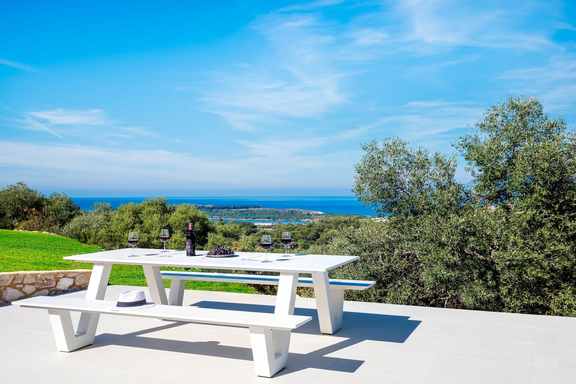 På uteområdet finner man pene steinlagte uteplasser med utemøbler for at alle gjestene skal kunne nyte den vakre utsikten over havet. En spiseplass for gjestene sammen med en grill er tilgjengelig for deilige utendørs måltider. Det private bassenget måler 7,5 m x 5,7 m (1,5 m dybde) og er vakkert opplyst om natten (tilgang via romerske trinn).