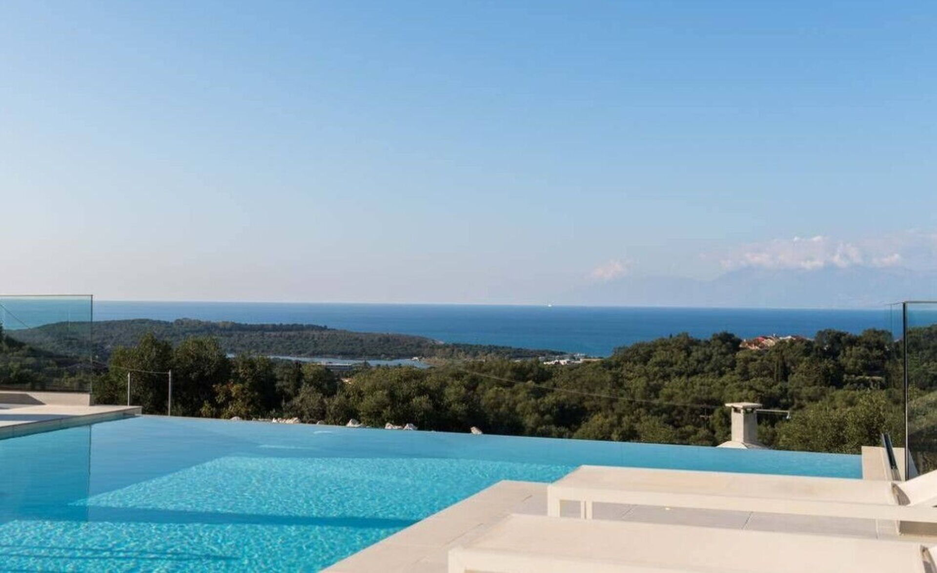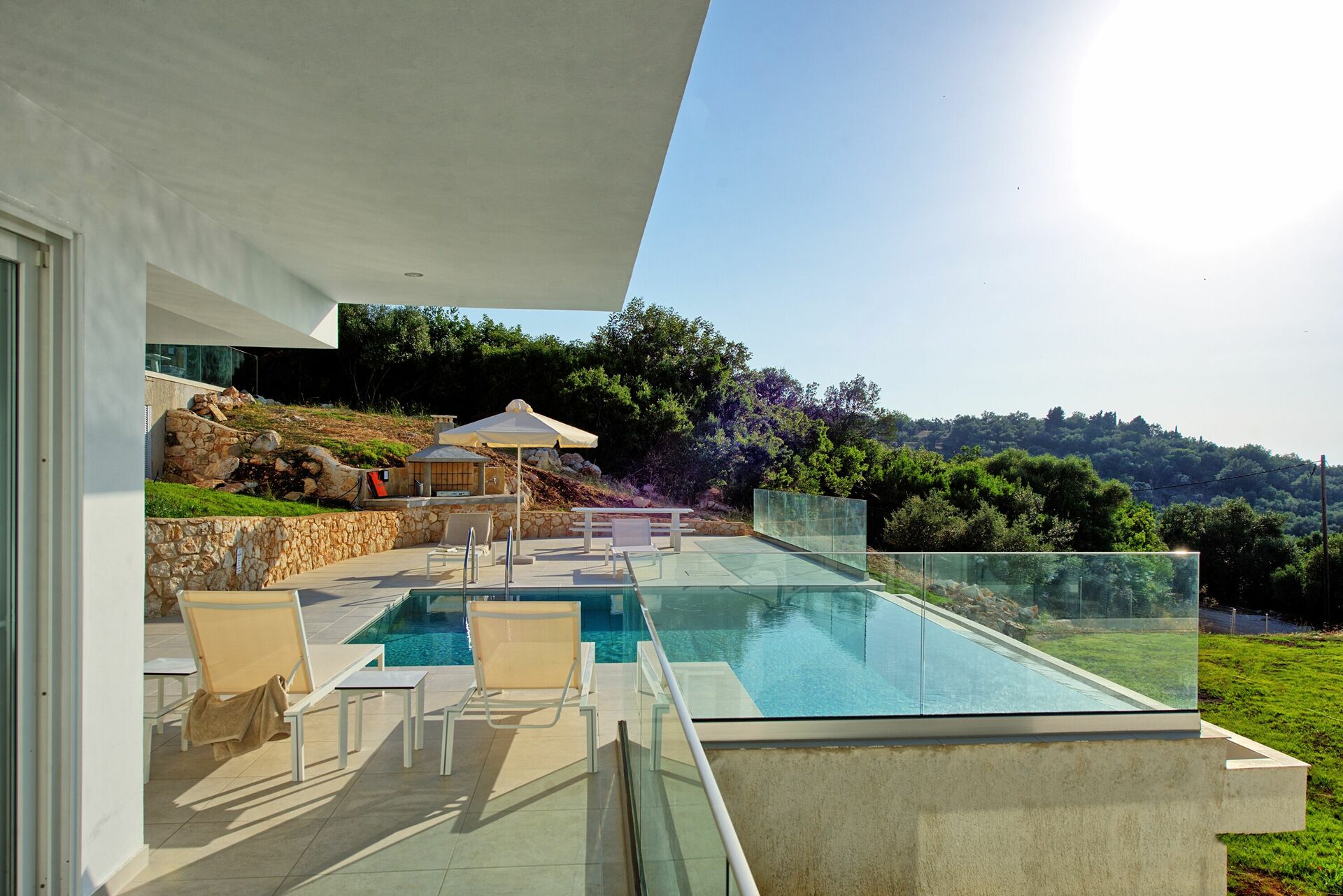 Villa med privat svømmebasseng og store terrasser langs den kjente nordøstkysten av Korfu i Hellas.