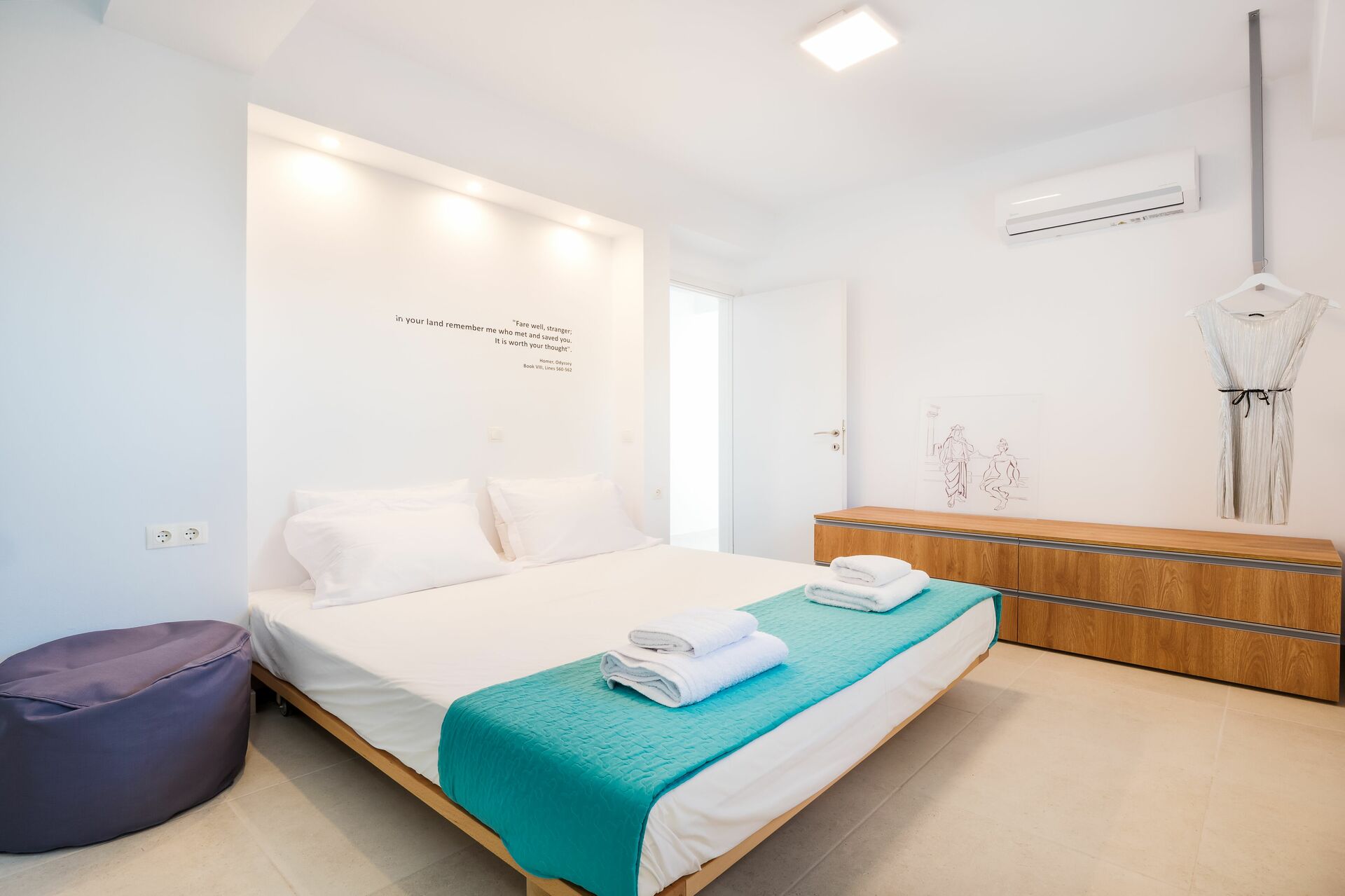 Innvendig er huset fordelt på 2 etasjer som er knyttet sammen via en sidetrapp. Villa Arete har store terrassedører, designermøbler, store vinduer som slipper inn mye lys. I første etasje er det en romslig stue (sofaer, wi-fi, klimaanlegg) med tilstøtende kjøkken (fullt utstyrt) samt 2 soverom (begge med eget bad). Ett soverom har en dobbeltseng + en sofa (som kan gjøres om til en enkel sovesofa i full størrelse), mens det andre soverommet er har to enkeltsenger. Overetasjen er identisk med den nedre, bortsett fra at hovedsoverommet bare har en dobbeltseng og ikke en ekstra sovesofa. Store terrasser i begge etasjer gir magisk utsikt over Det joniske hav og den albanske kysten utenfor.