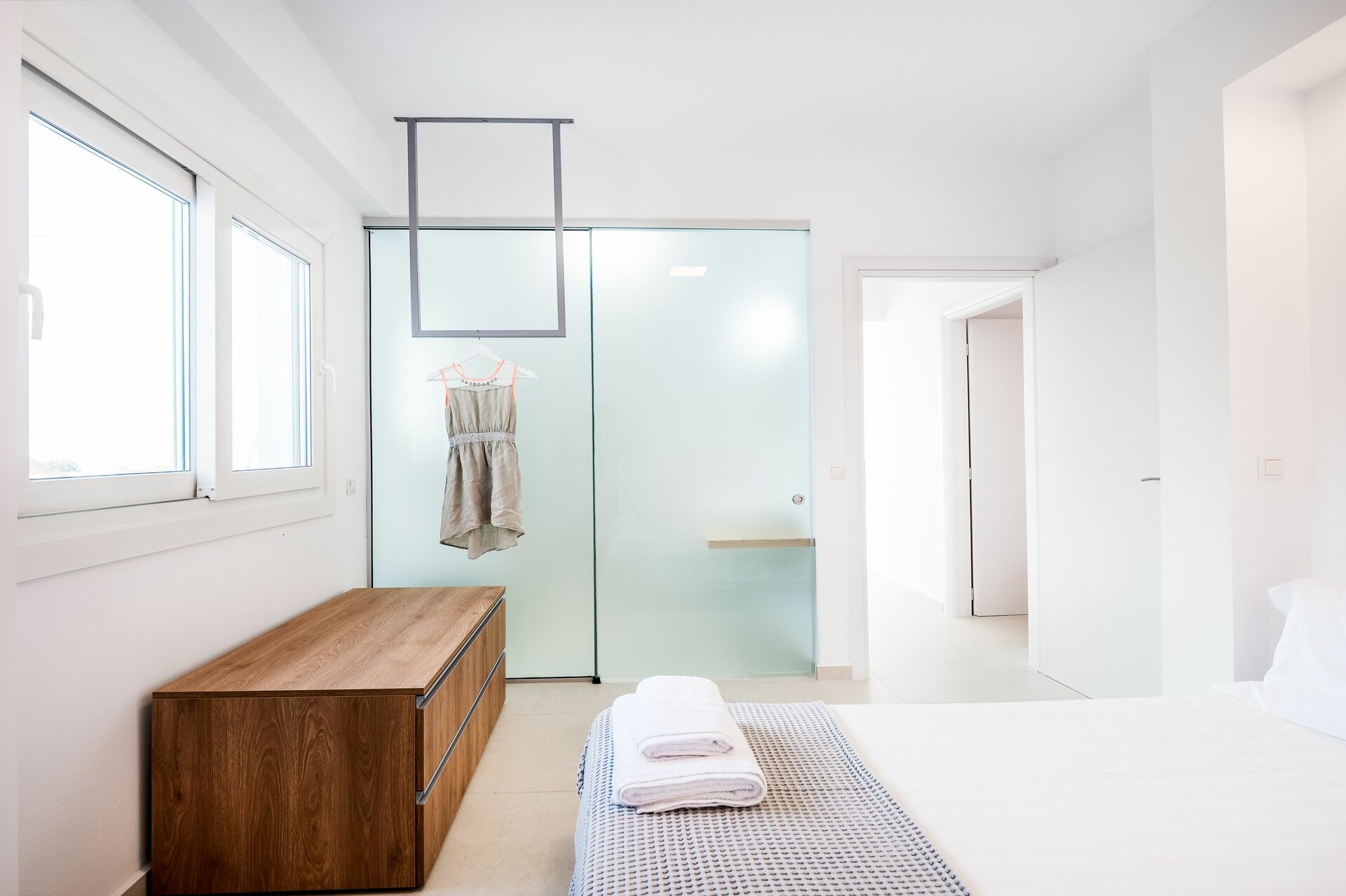 Første etasje : stue (klimaanlegg, flatskjerm-tv, sofaer, lenestol, wi-fi internett) med økken (stekeovn, oppvaskmaskin, kjøleskap, fryser, brødrister, vannkoker) med store terrassedører som åpner mot utsiden, tomannsrom (klimaanlegg) med dusjrom med eget bad, soverom med dobbeltseng + enkeltseng med dusjrom (vaskemaskin).