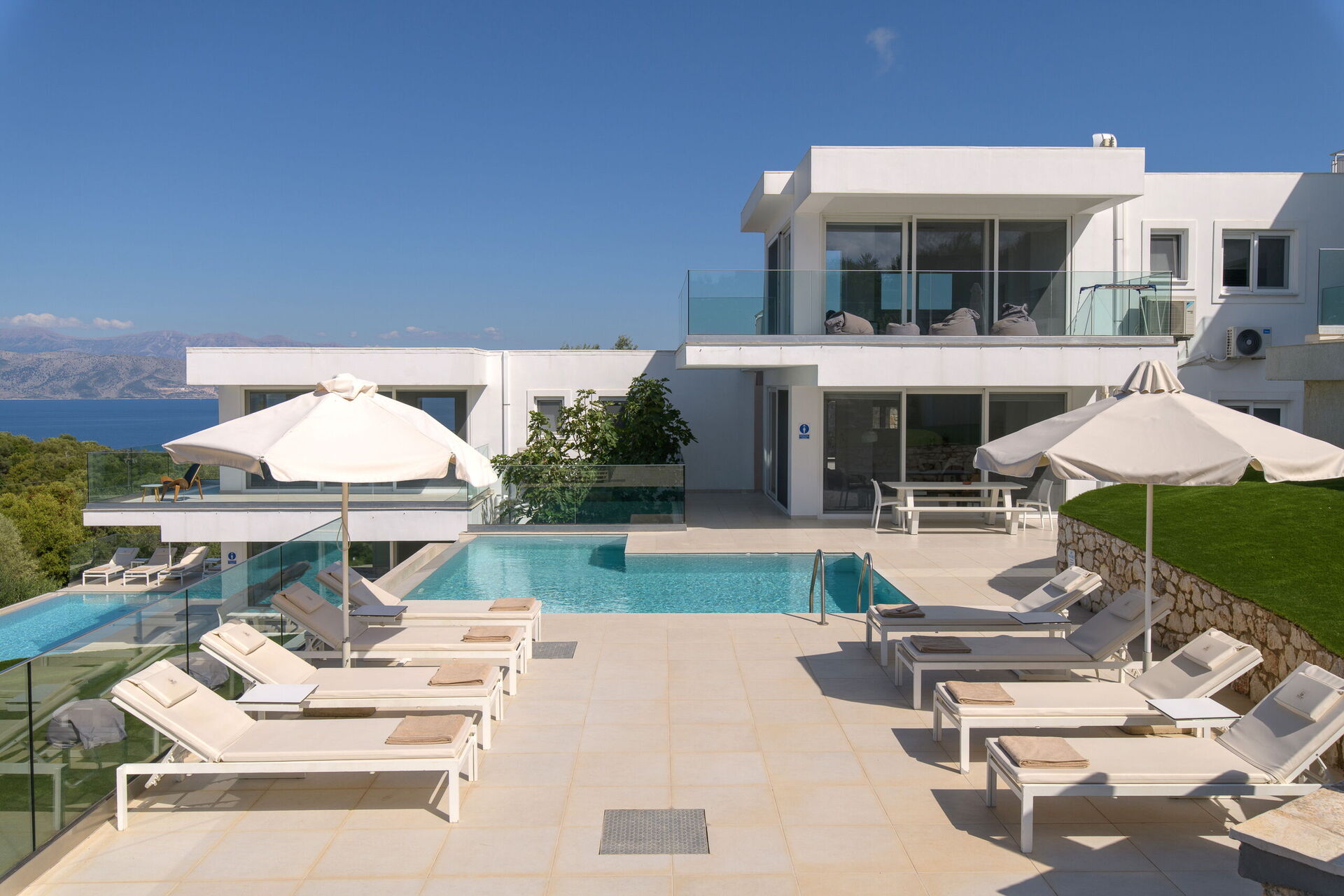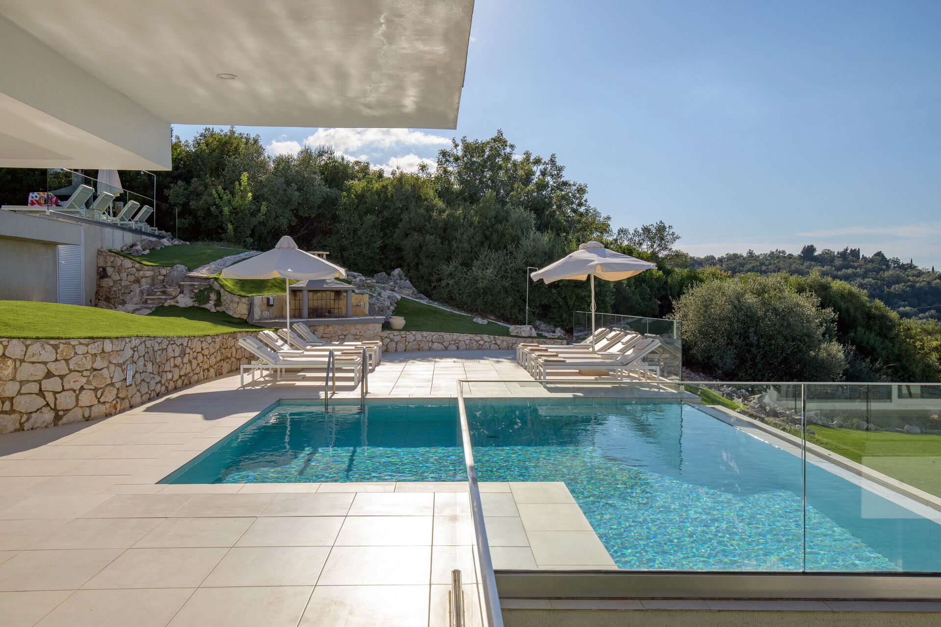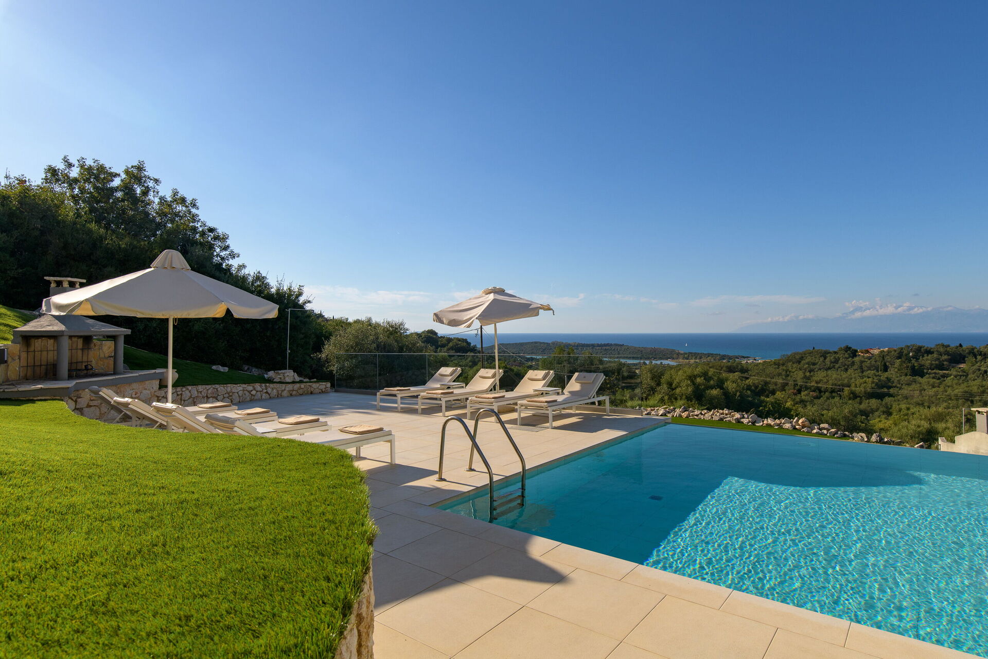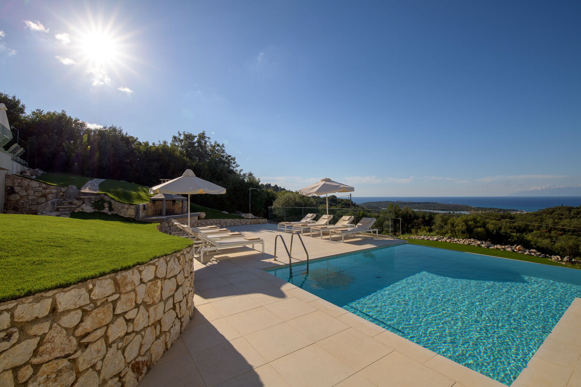 Villa med privat svømmebasseng og store terrasser langs den kjente nordøstkysten av Korfu i Hellas.