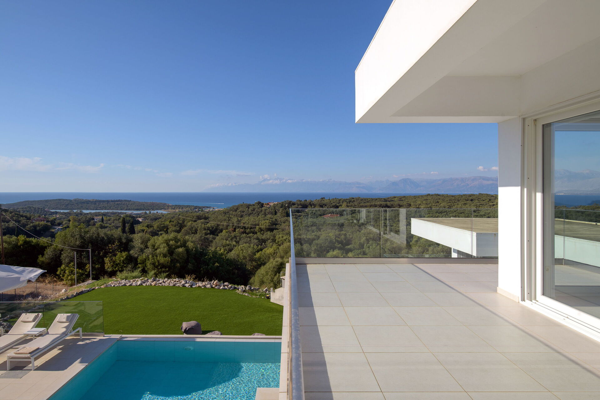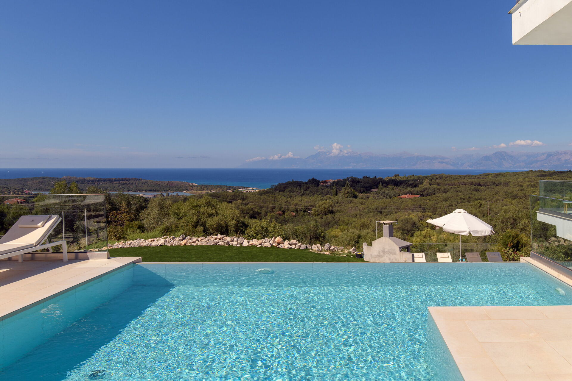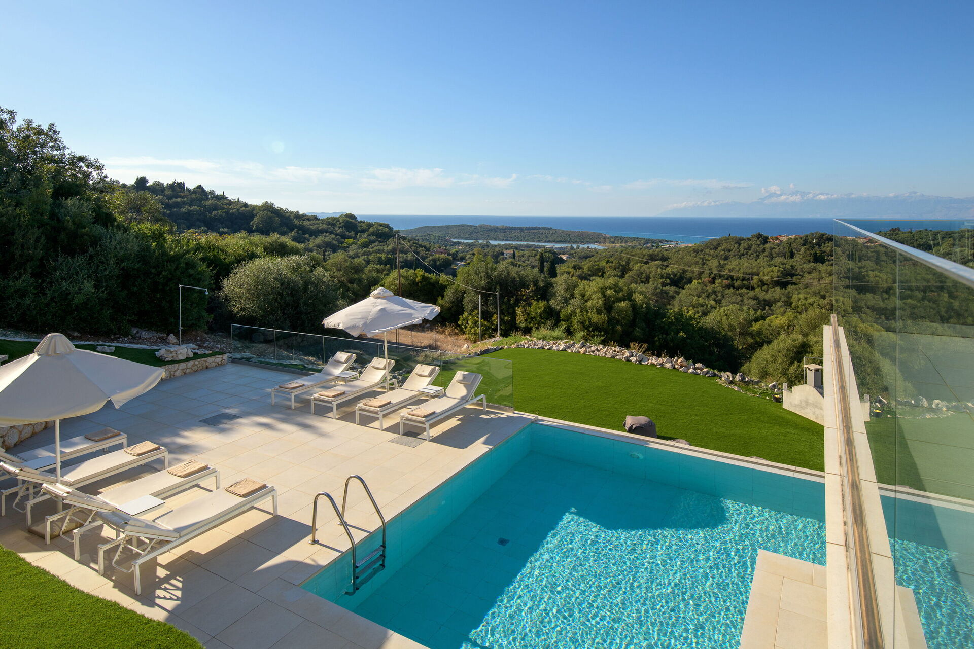 Villa med privat svømmebasseng og store terrasser langs den kjente nordøstkysten av Korfu i Hellas.