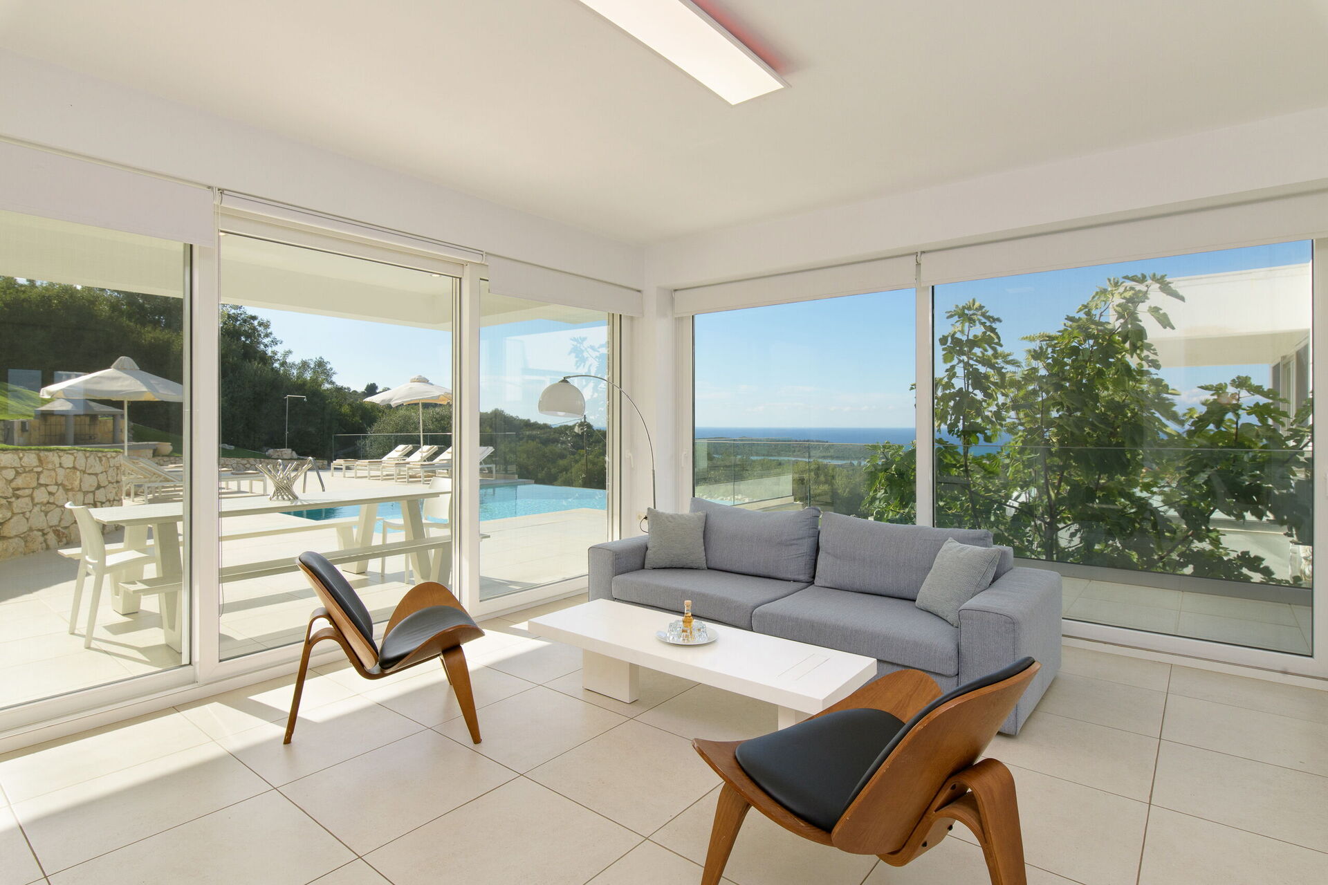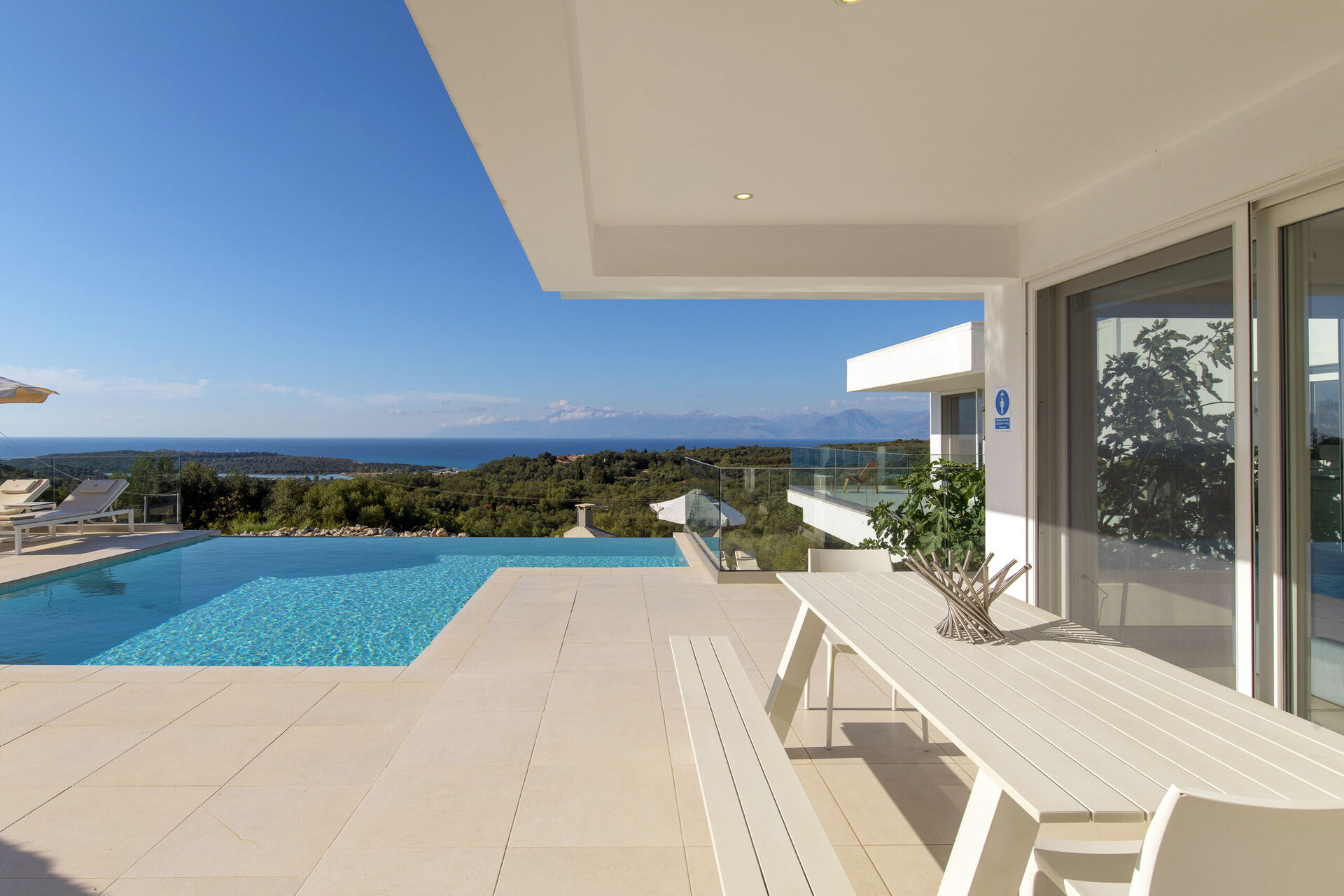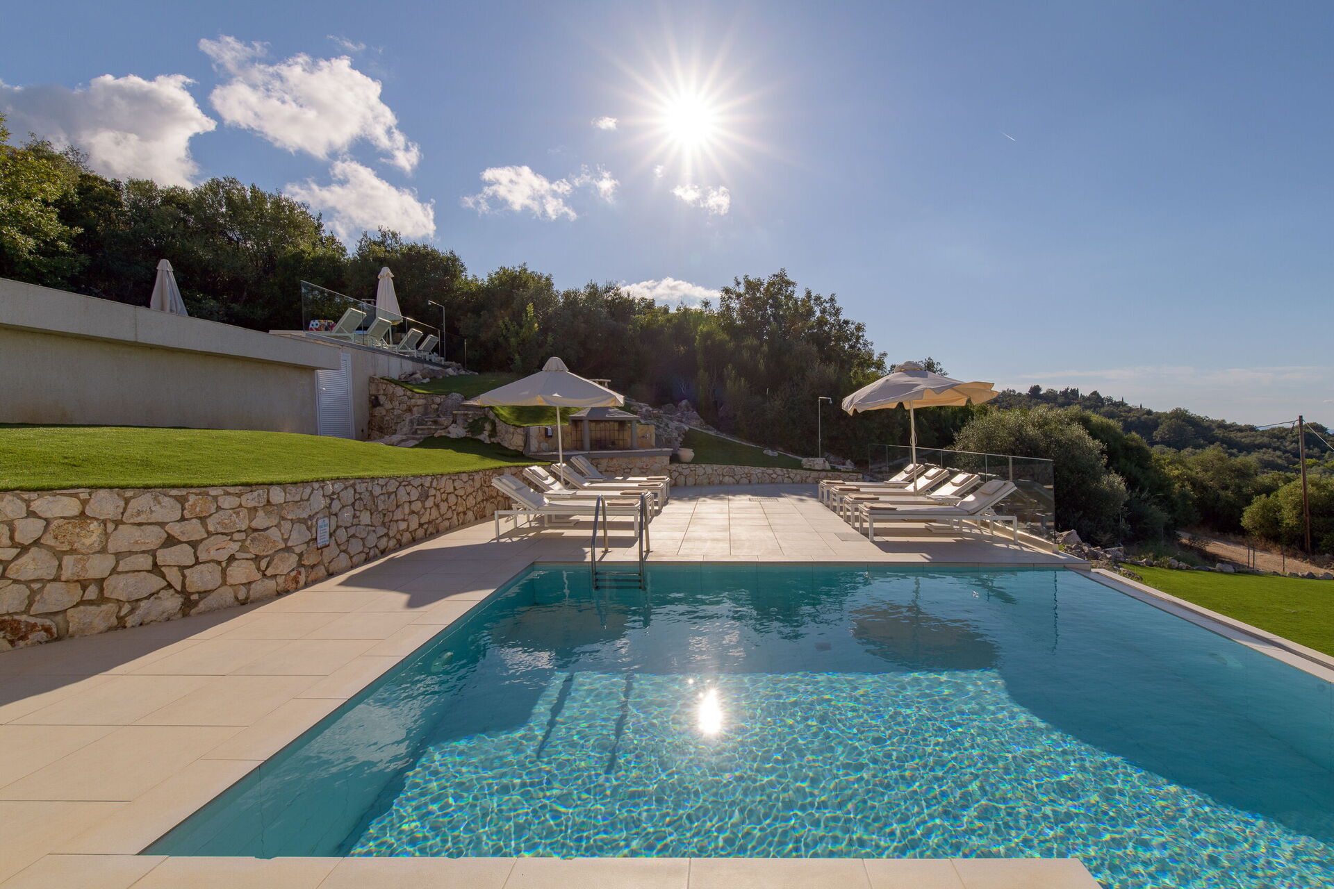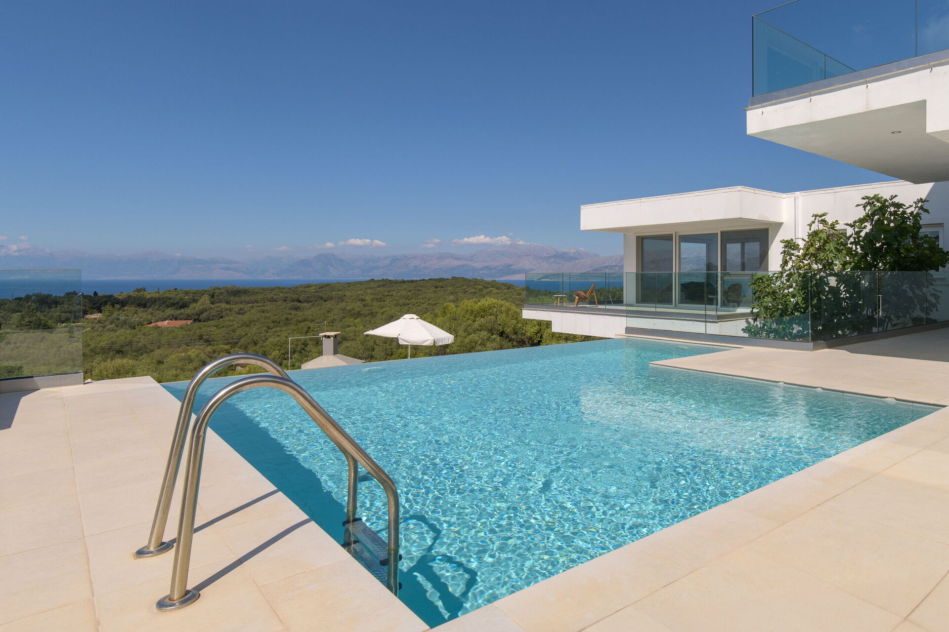 Villa med privat svømmebasseng og store terrasser langs den kjente nordøstkysten av Korfu i Hellas.