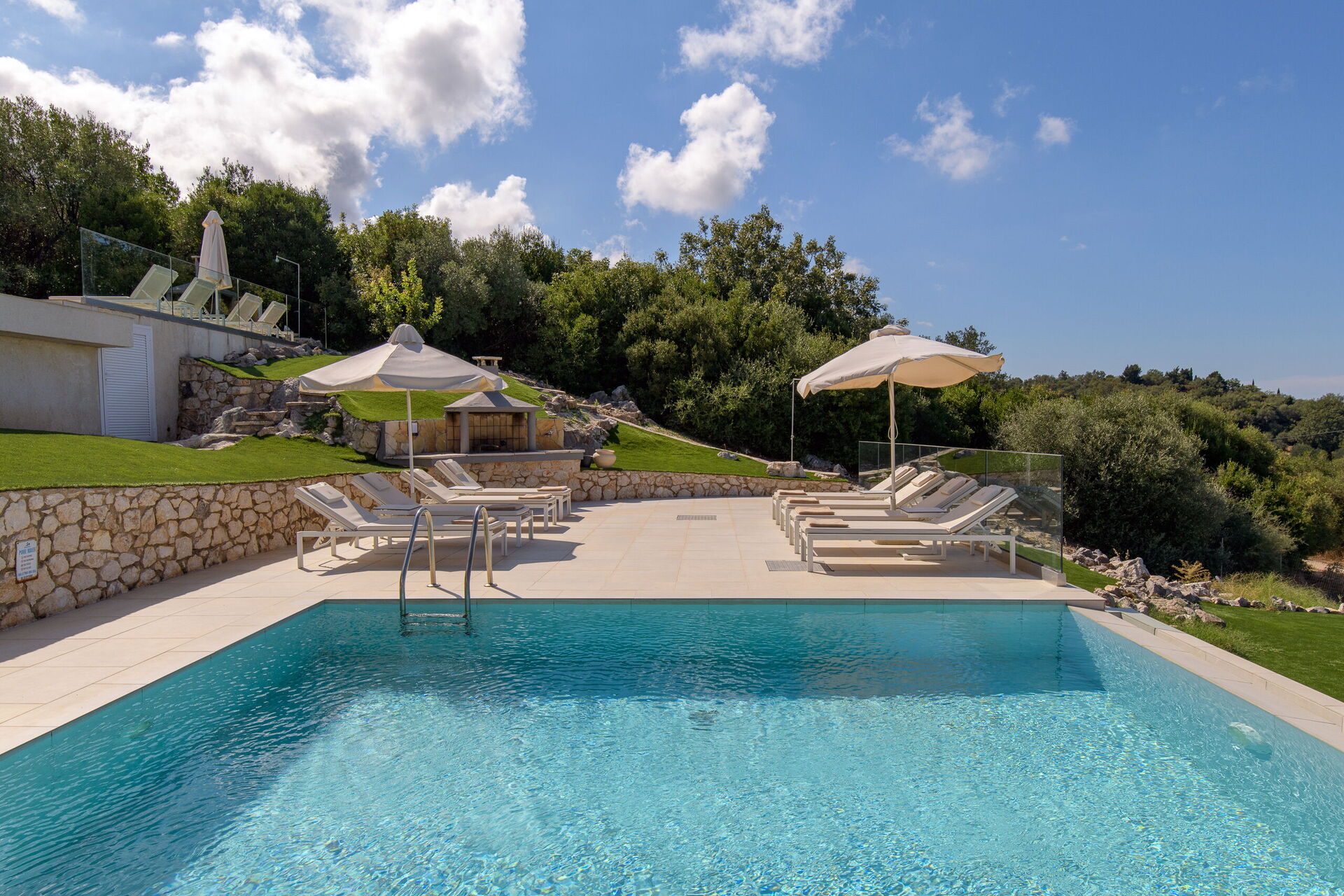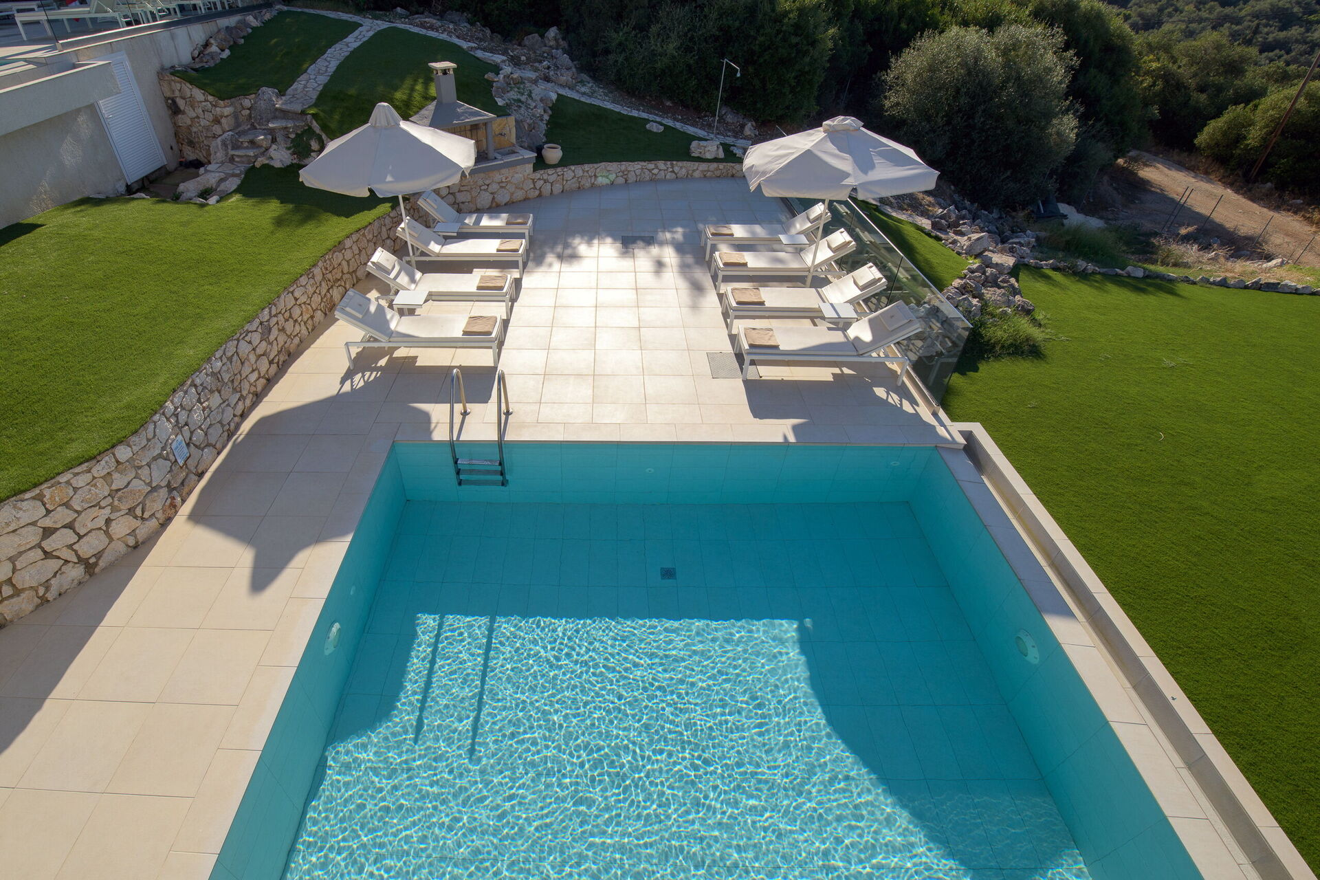 På uteområdet finner man pene steinlagte uteplasser med utemøbler for at alle gjestene skal kunne nyte den vakre utsikten over havet. En spiseplass for gjestene sammen med en grill er tilgjengelig for deilige utendørs måltider. Det private bassenget måler 7,5 m x 5,7 m (1,5 m dybde) og er vakkert opplyst om natten (tilgang via romerske trinn).