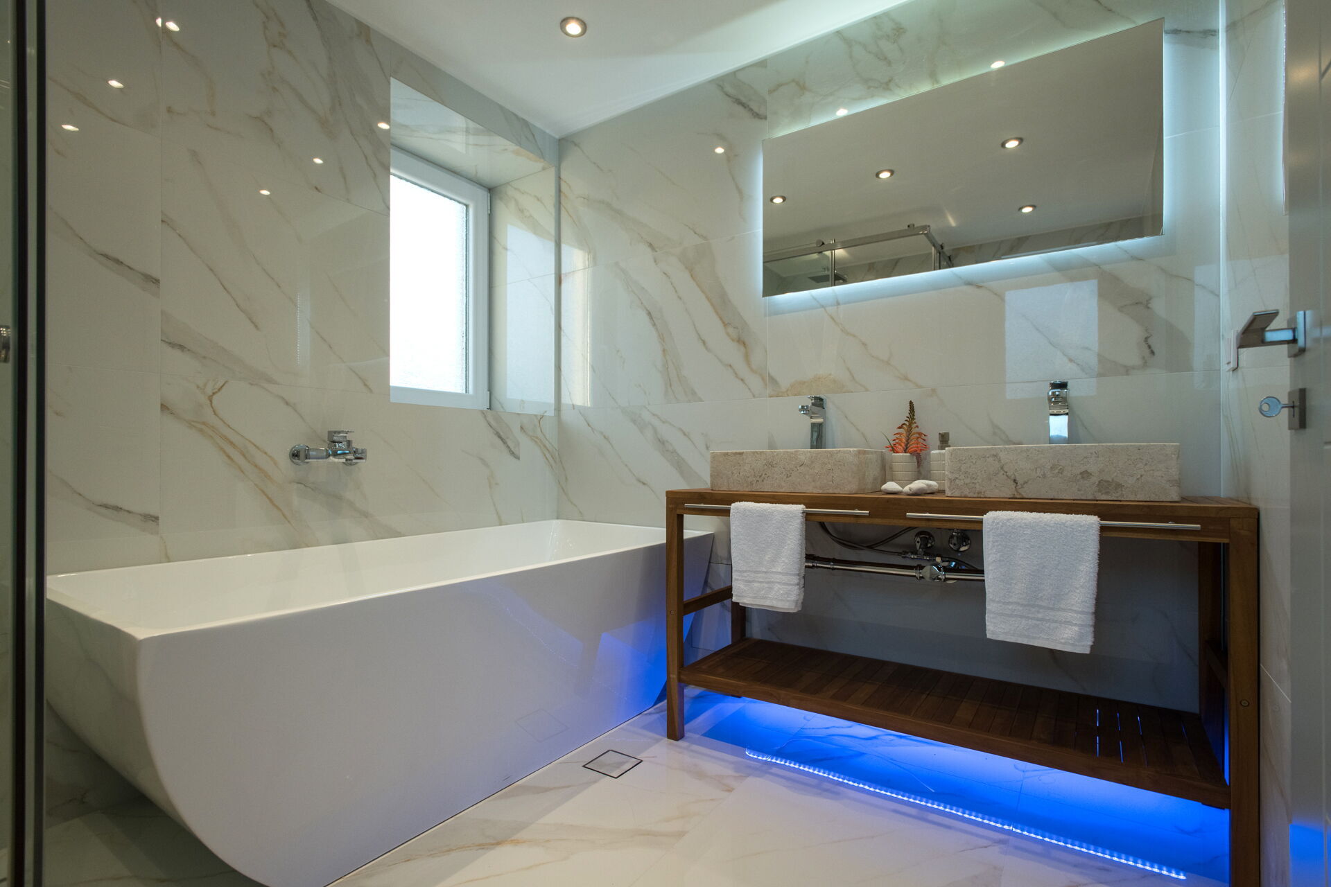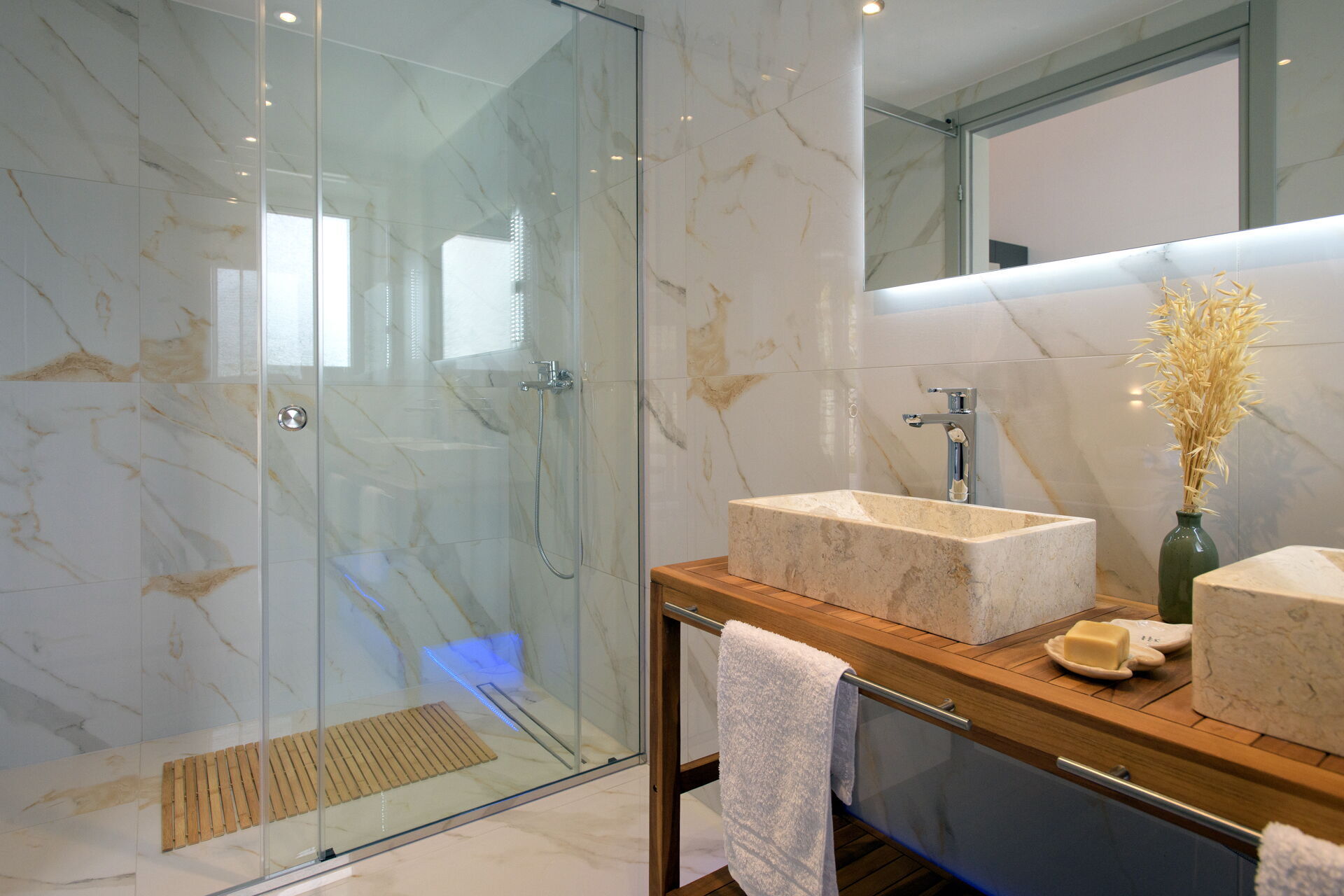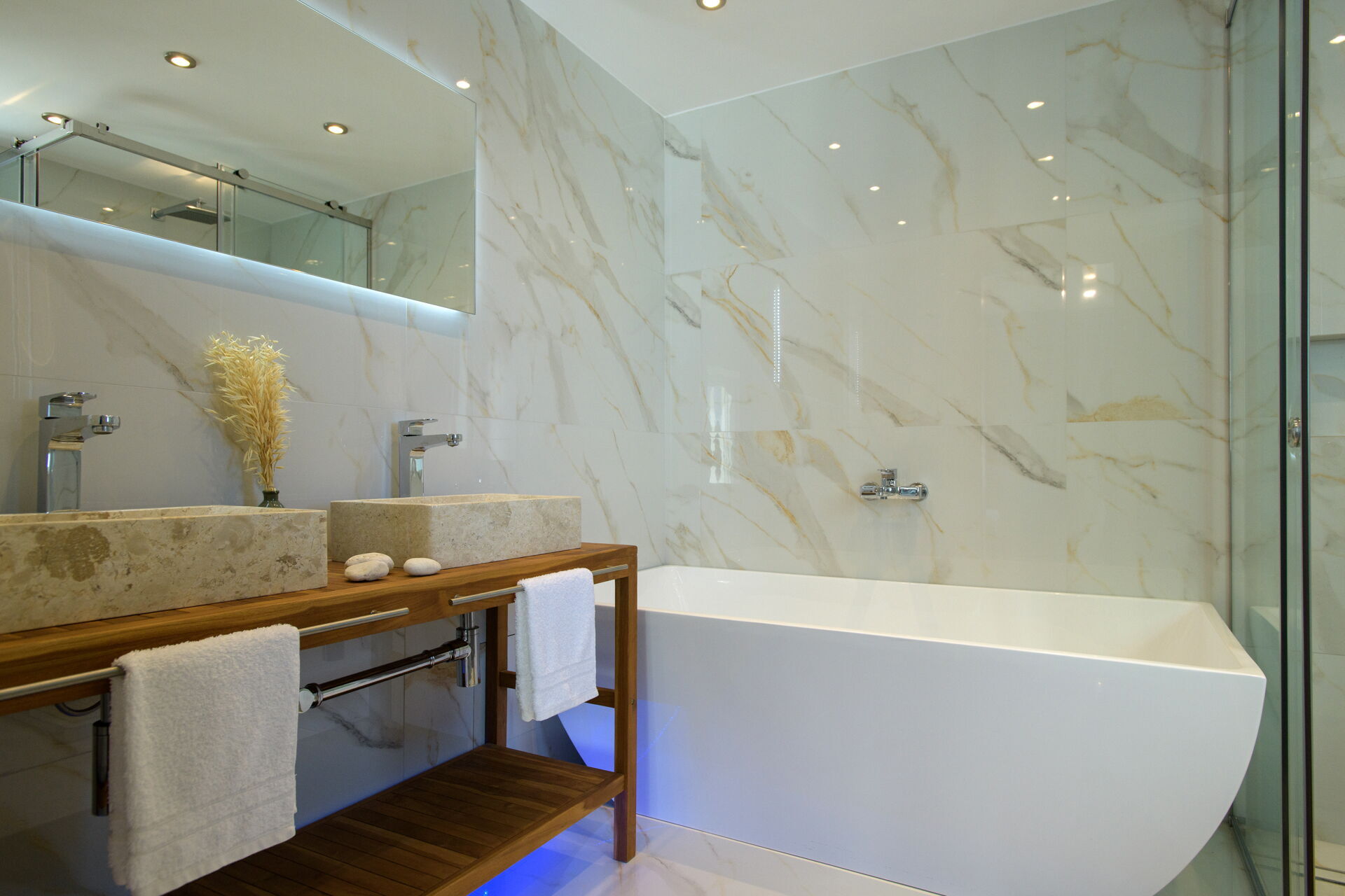 Villaen er over 3 etasjer og med 3 soverom og store fellesarealer, inkludert et velværeområde med innendørs boblebad (plassert i villaens underetasje).