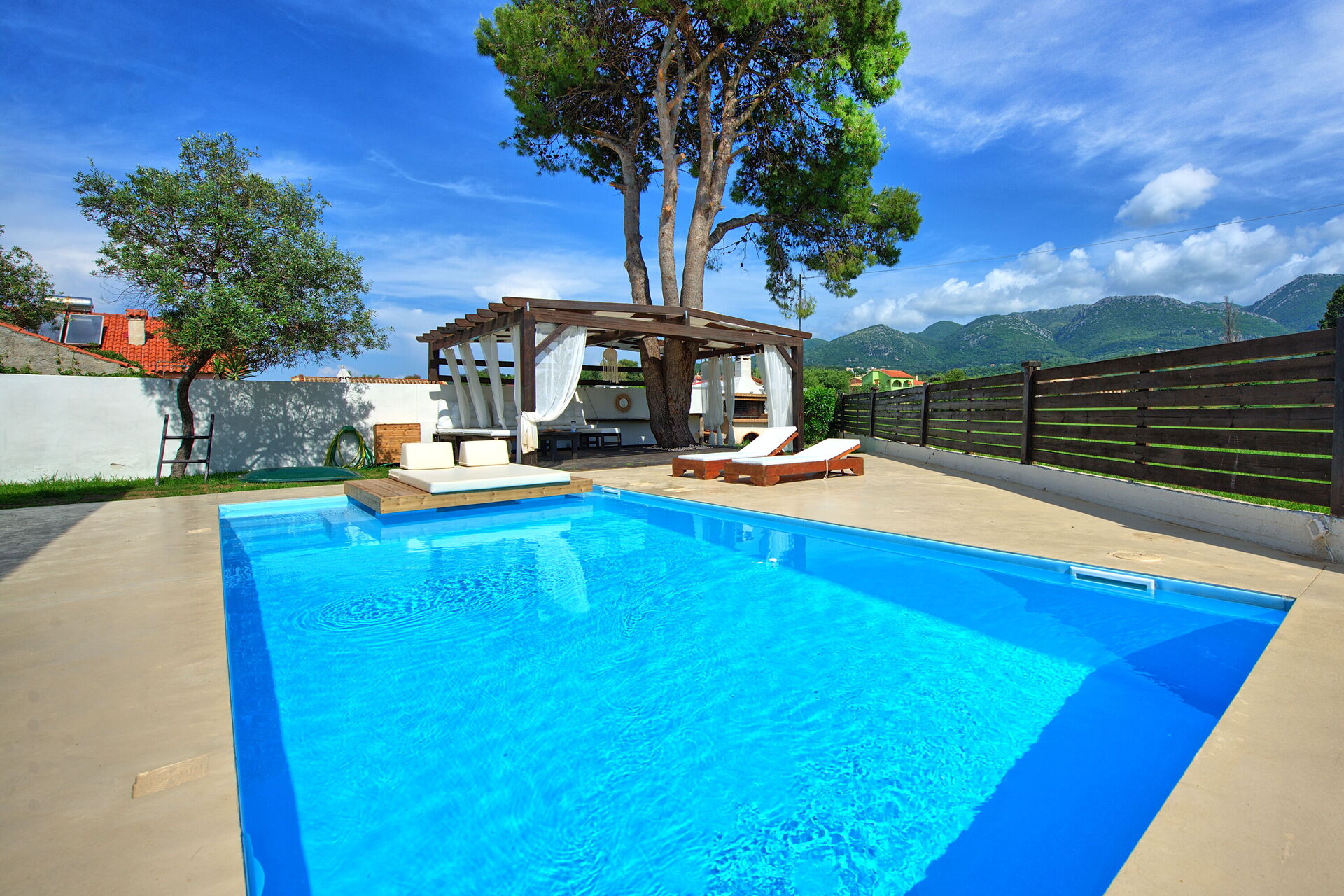 Beautiful view over the nearby mountain range. Easy walking distance to the beach, even for families with children. Stunning garden to relax in. The wooden terrace needs rebuilding (Owner said this would happen in the next couple of months). We loved being here with our children and would come back. Not if there will be a pool in the future though. The beach and other pool options are in such close vicinity that we would not want to have extra water usage nor the danger of a pool for kids in the garden.