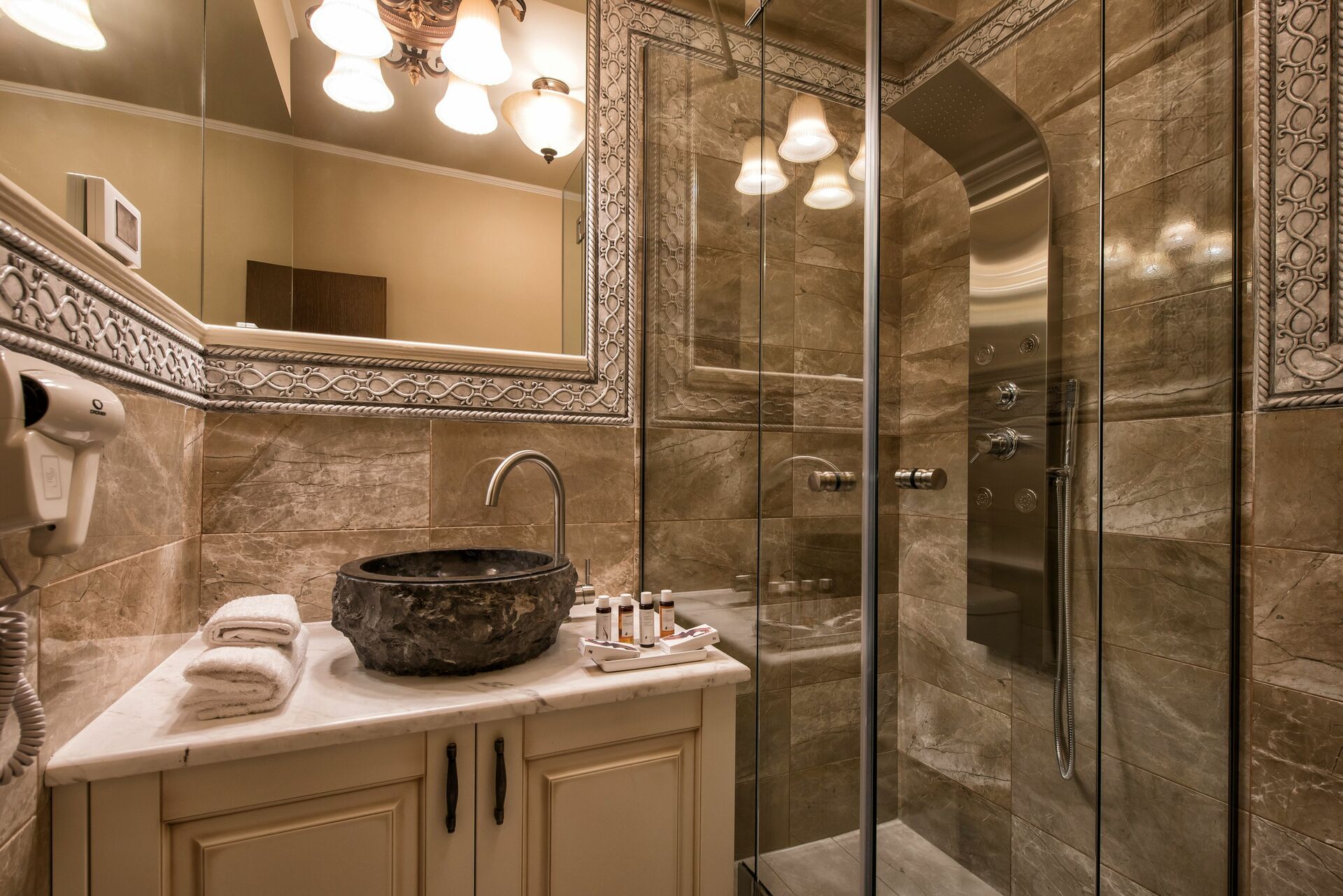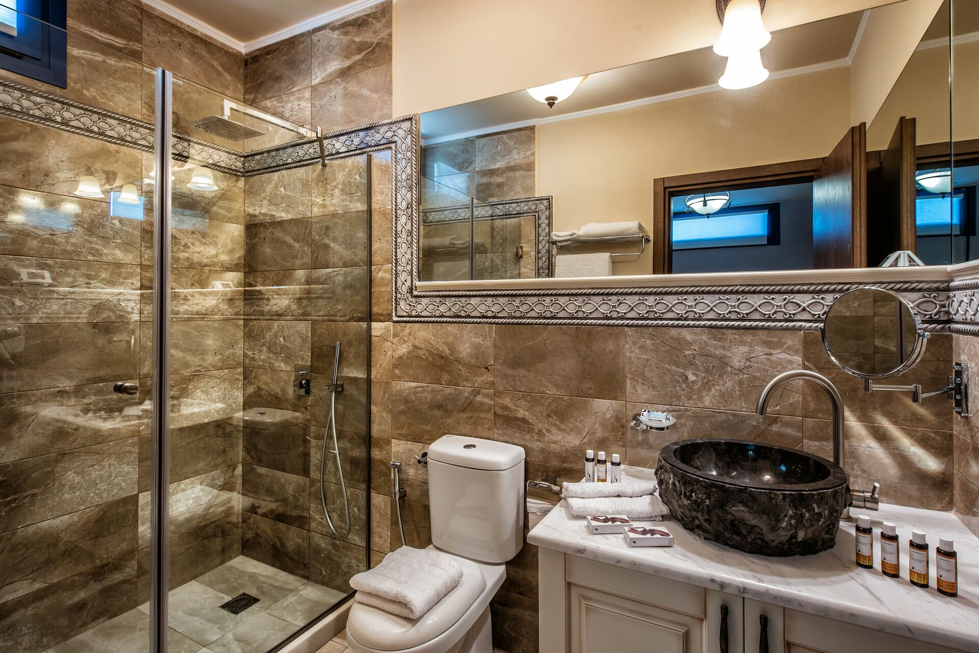 Dobbeltrom med eget bad med dusj og tilgang til balkong med havutsikt, dobbelt soverom, soverom med 2 enkeltsenger og tilgang til balkong med havutsikt, bad med dusj.