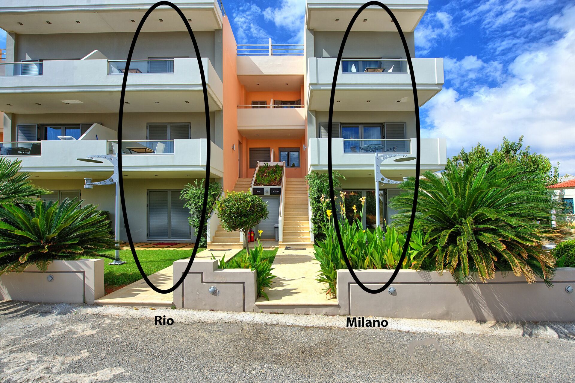 Sandy Rio er en del av en gruppe på 3 rekkehus med hvert sitt private basseng, bare 100 meter fra sjøen i Agia Marina på Kreta i Hellas.