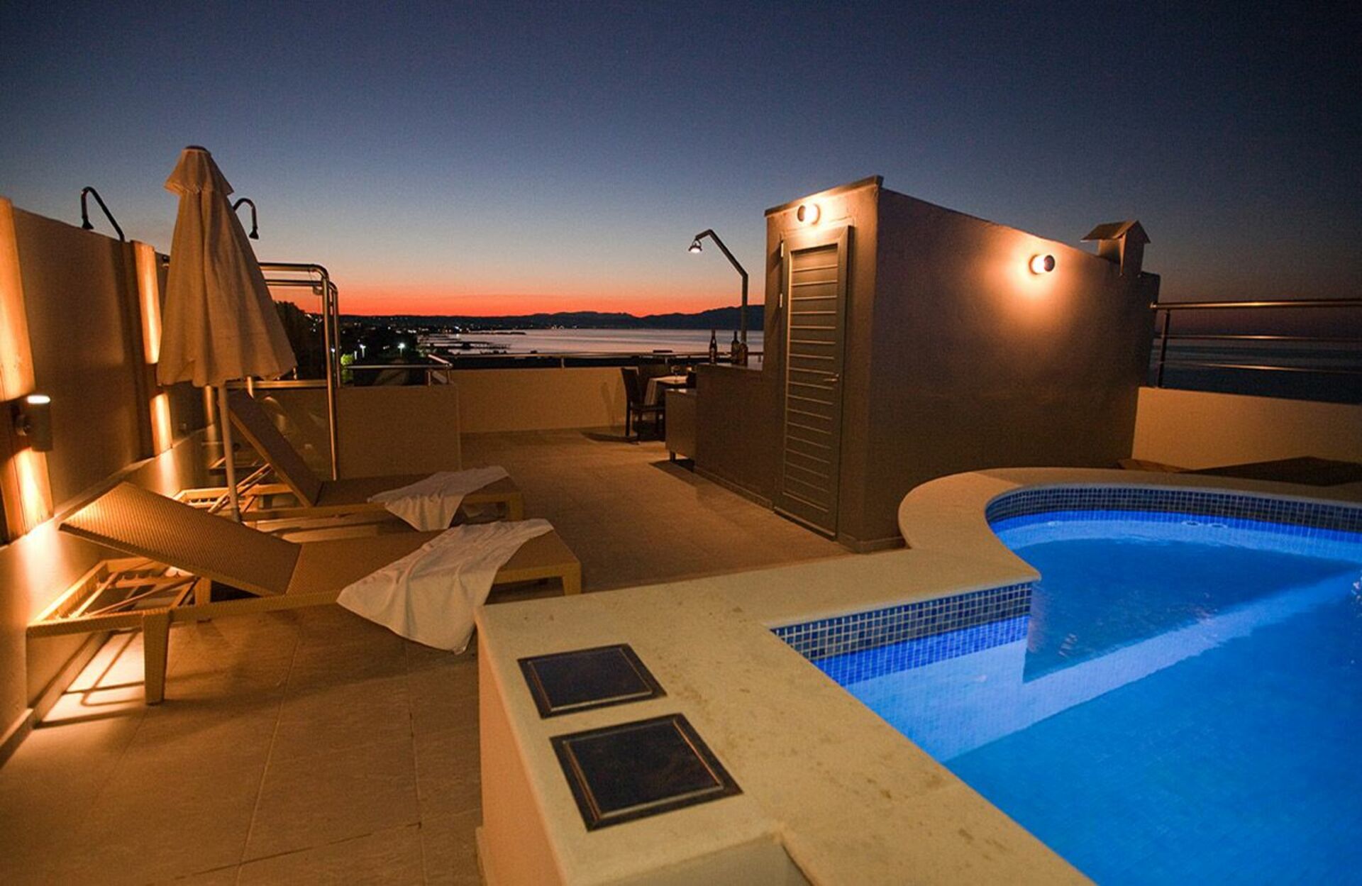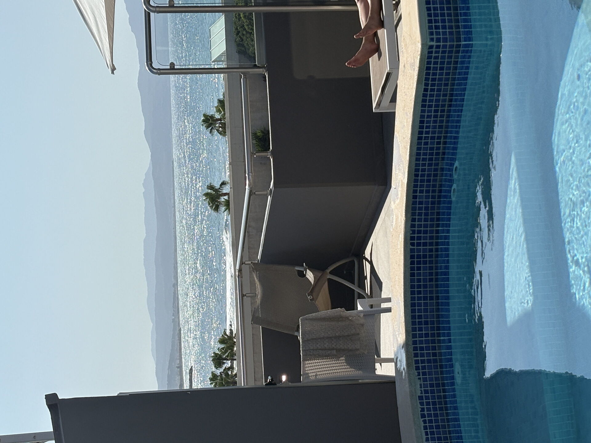 Fjerde etasje: terrasse med panoramautsikt og privat basseng (dybde: 0,55 meter), utendørs dusj, bord og stoler for uteservering.