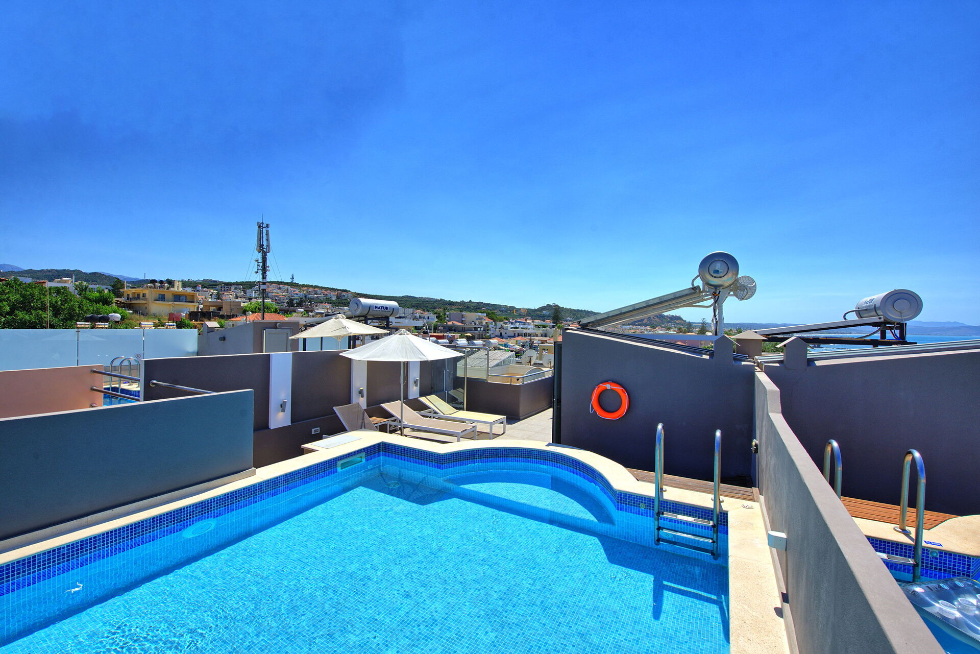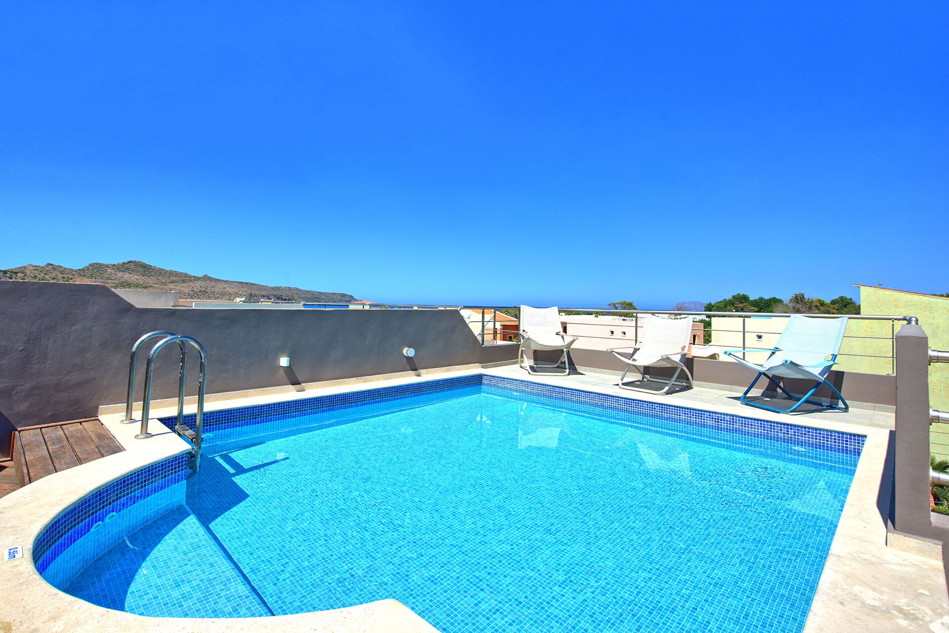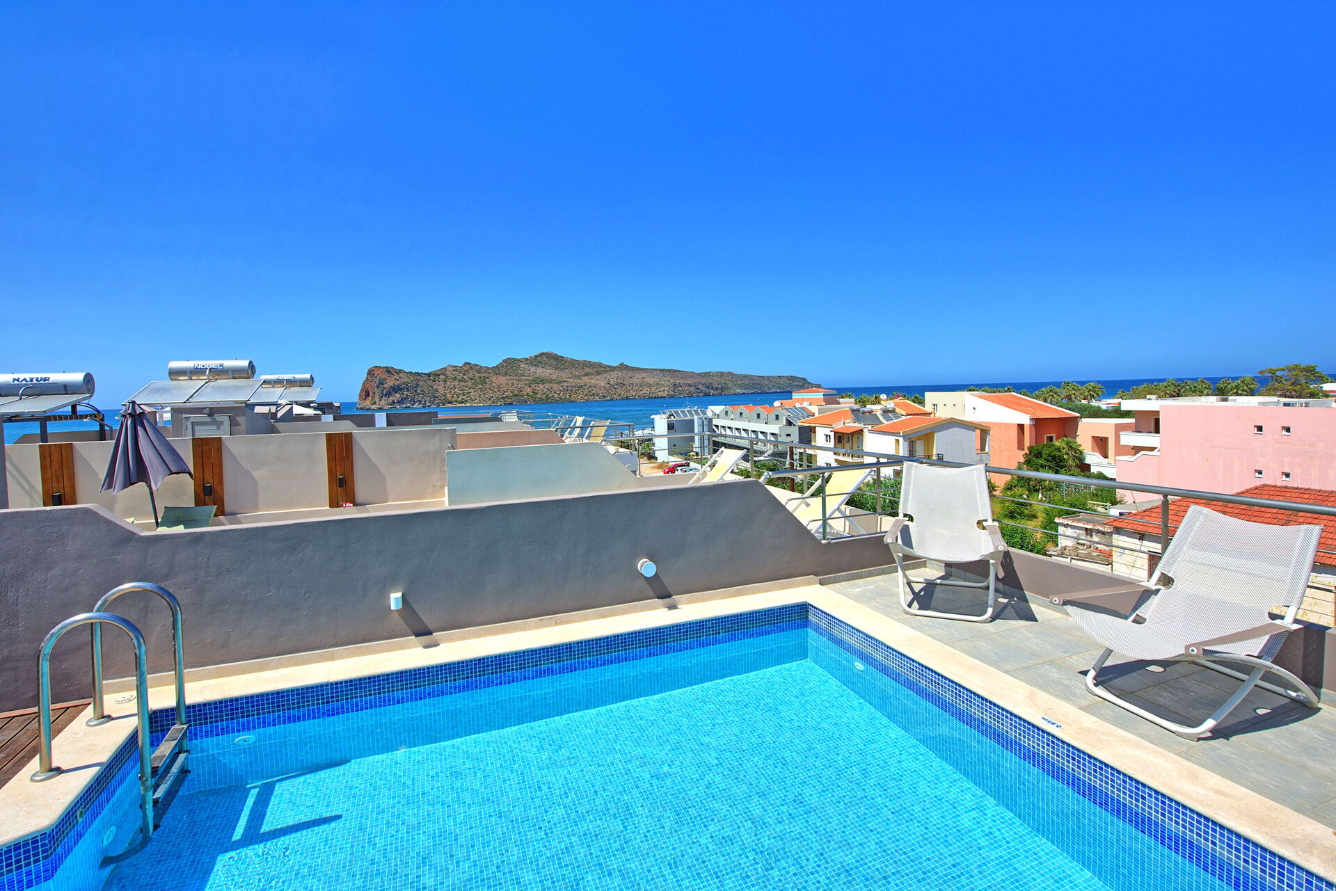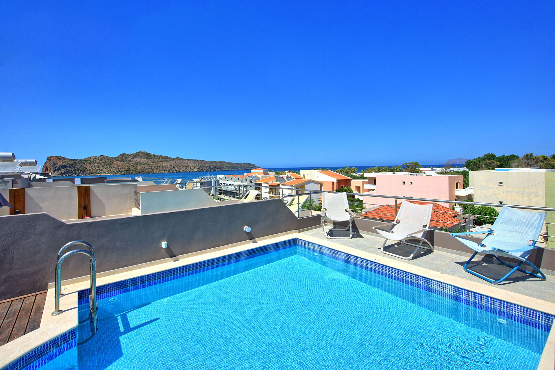 Casablanca er en del av en gruppe på 3 rekkehus med hvert sitt private basseng, bare 100 meter fra sjøen i Agia Marina på Kreta i Hellas.