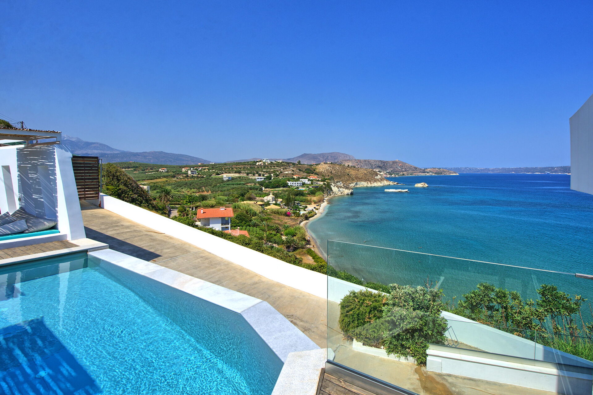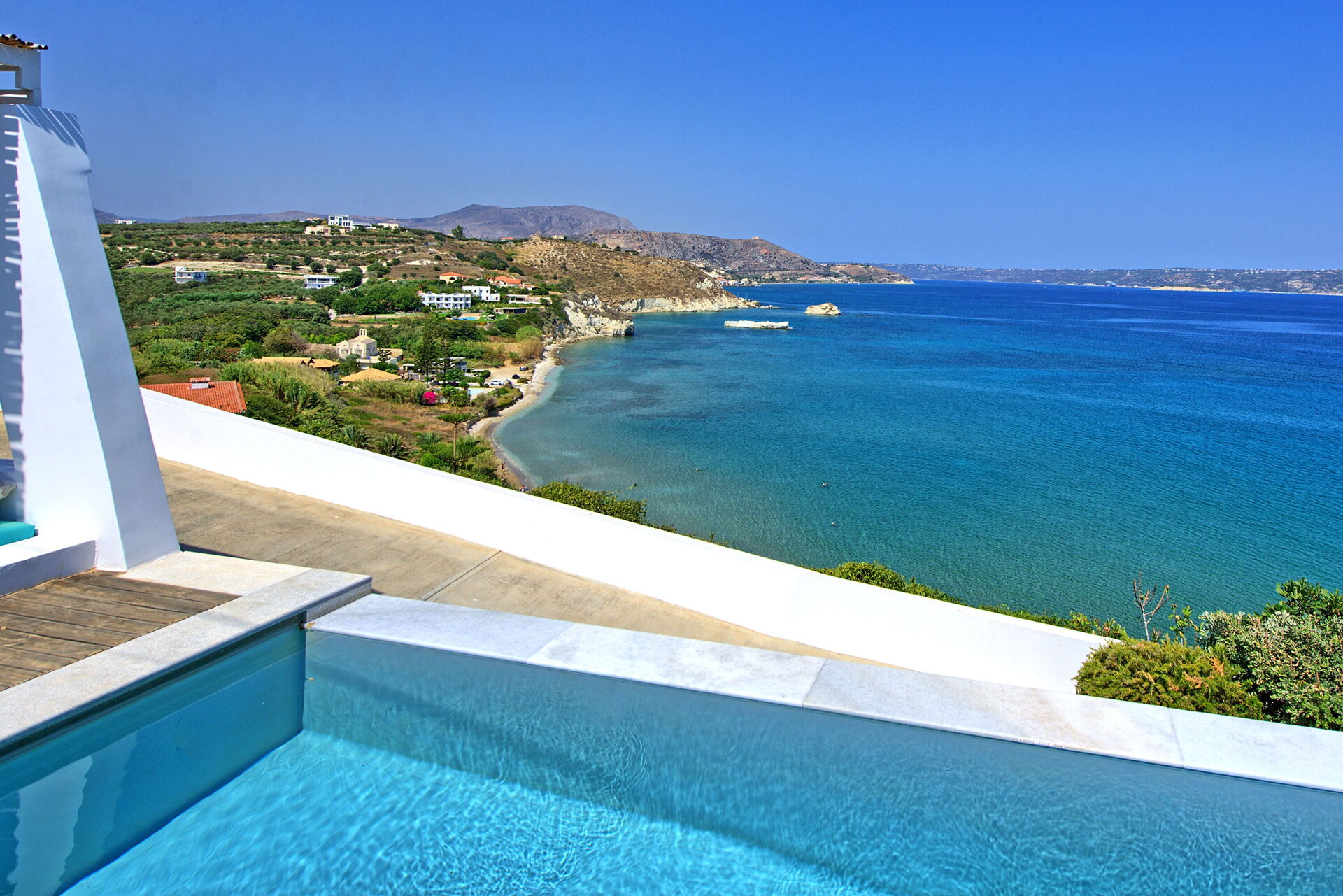 Villa Sapphire er et elegant feriehus på Kreta med privat basseng og panoramautsikt over sjøen.