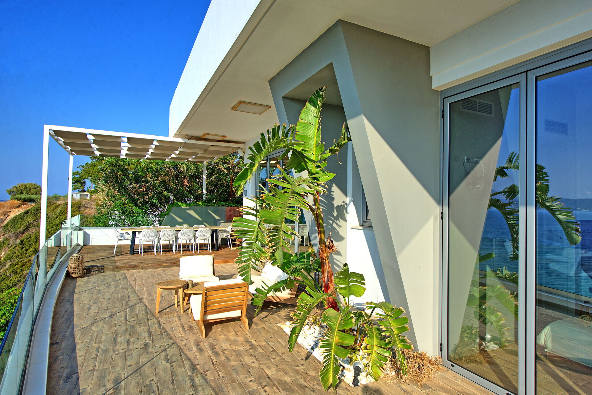Den utmerkede beliggenheten og panoramautsikten over havet er bare ett av husets sterke sider. Den andre er de store vinduene som gir en fantastisk utsikt over havet også fra innsiden av huset.