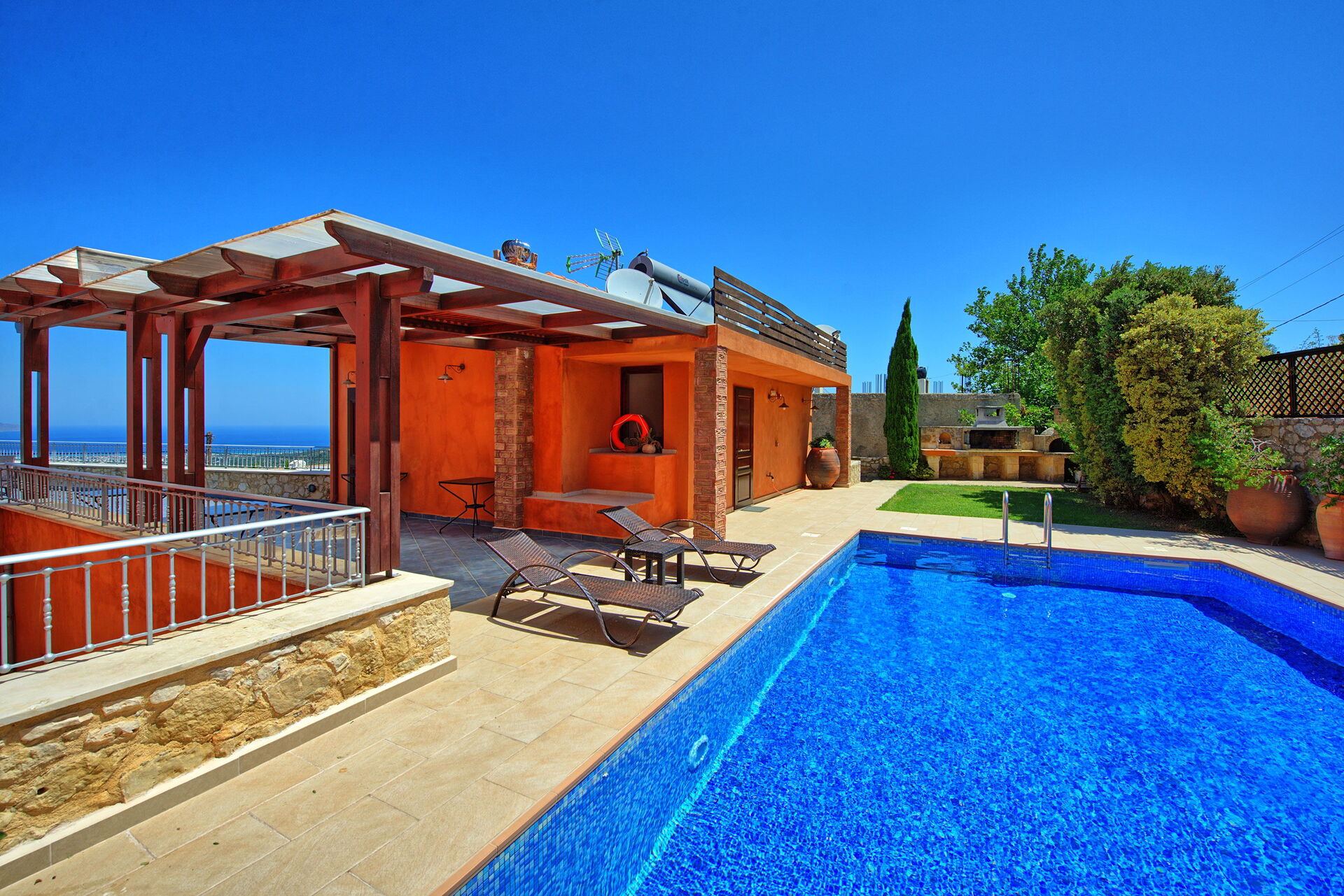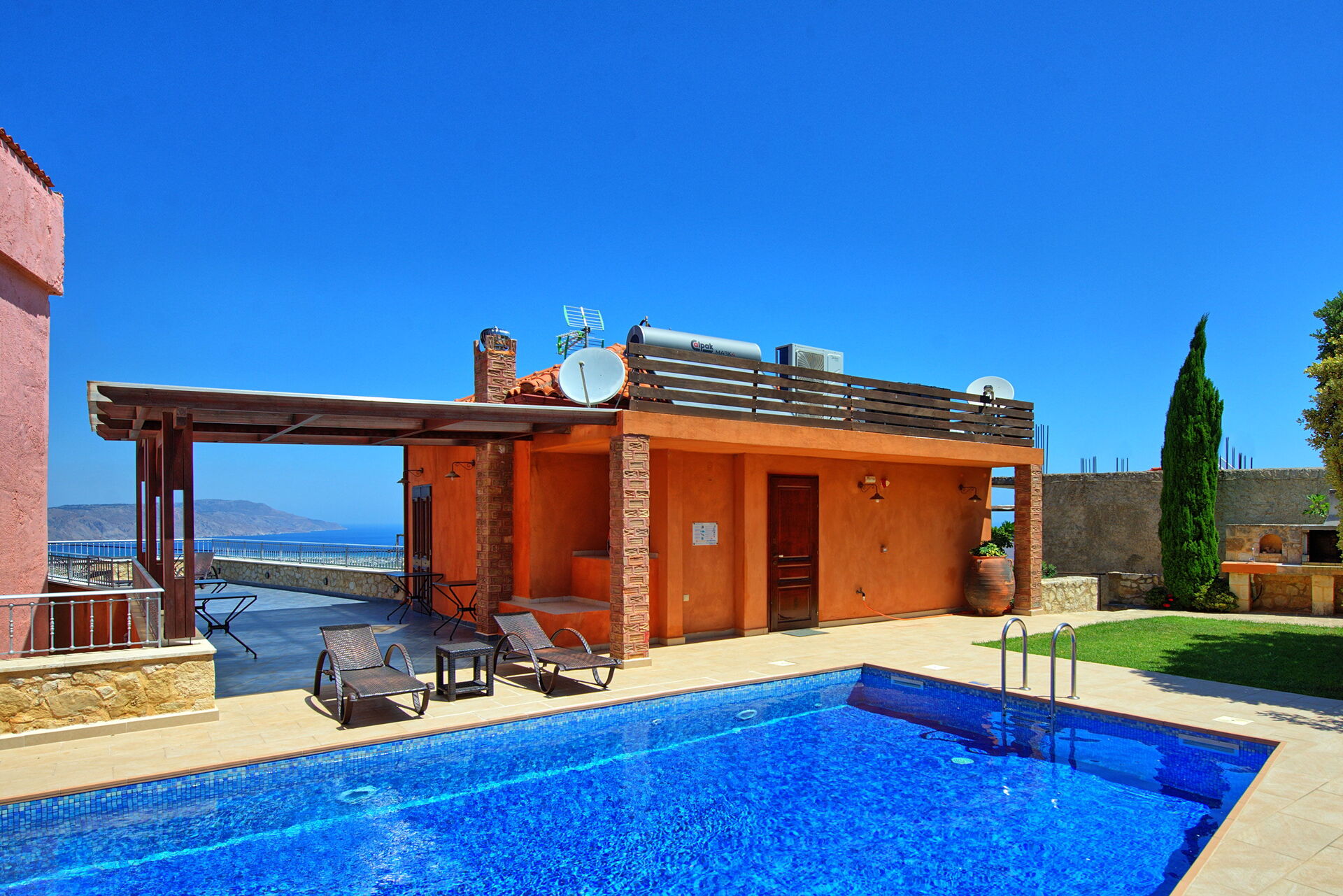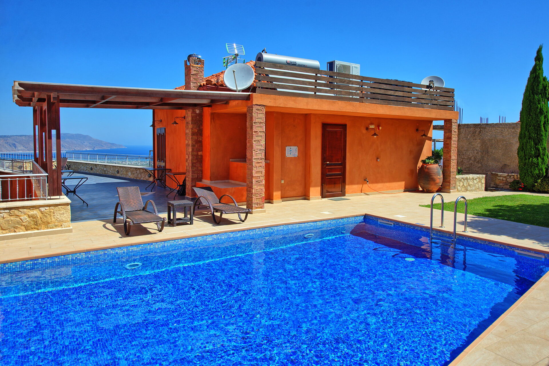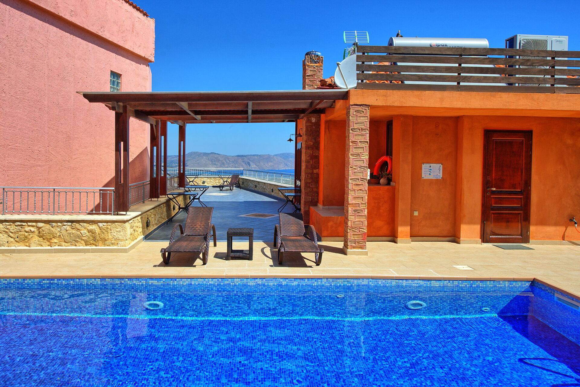 Villa Rodanthi har et vakkert basseng for avkjøling på solfylte dager, og en herlig terrasse for uteservering med fantastisk utsikt.