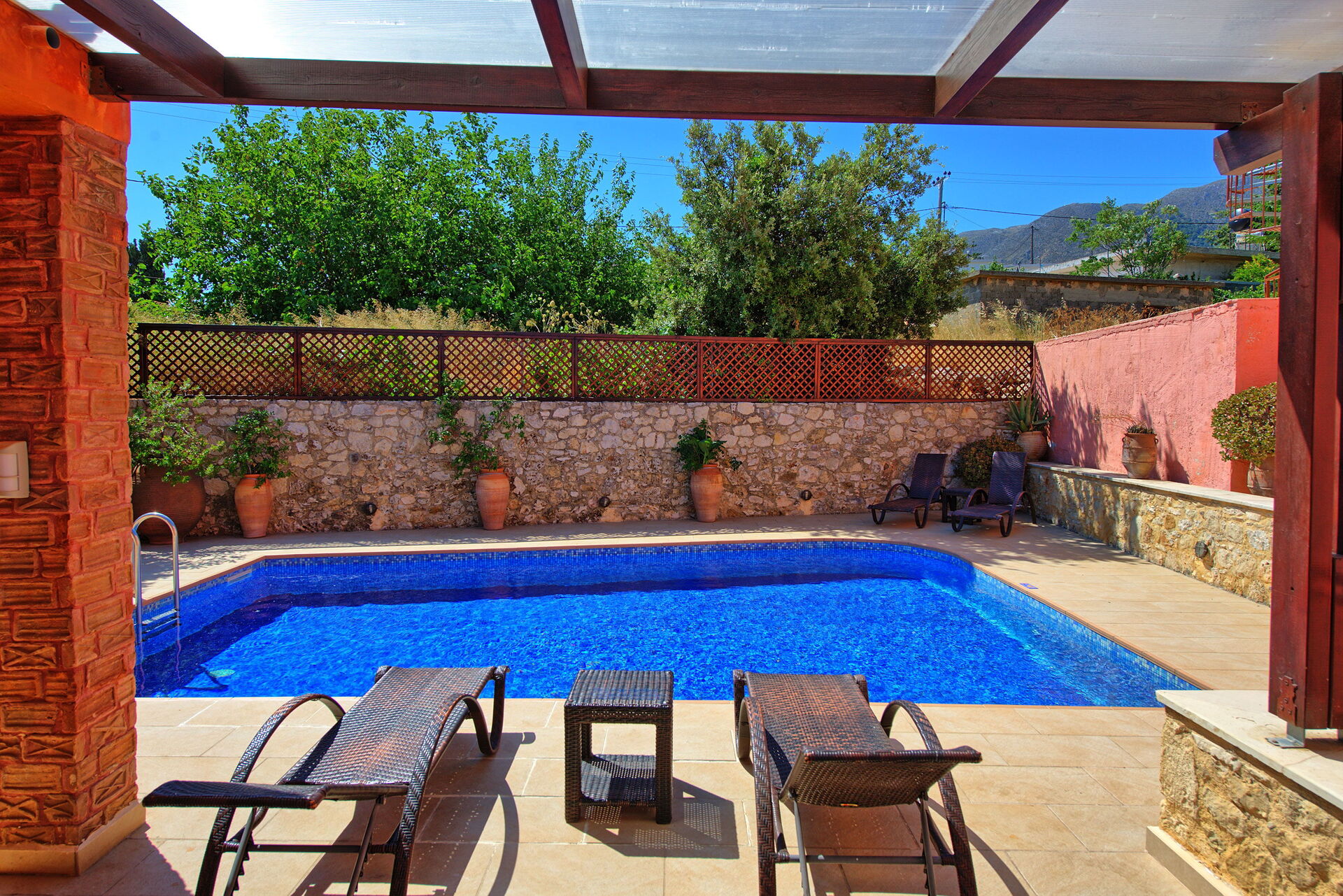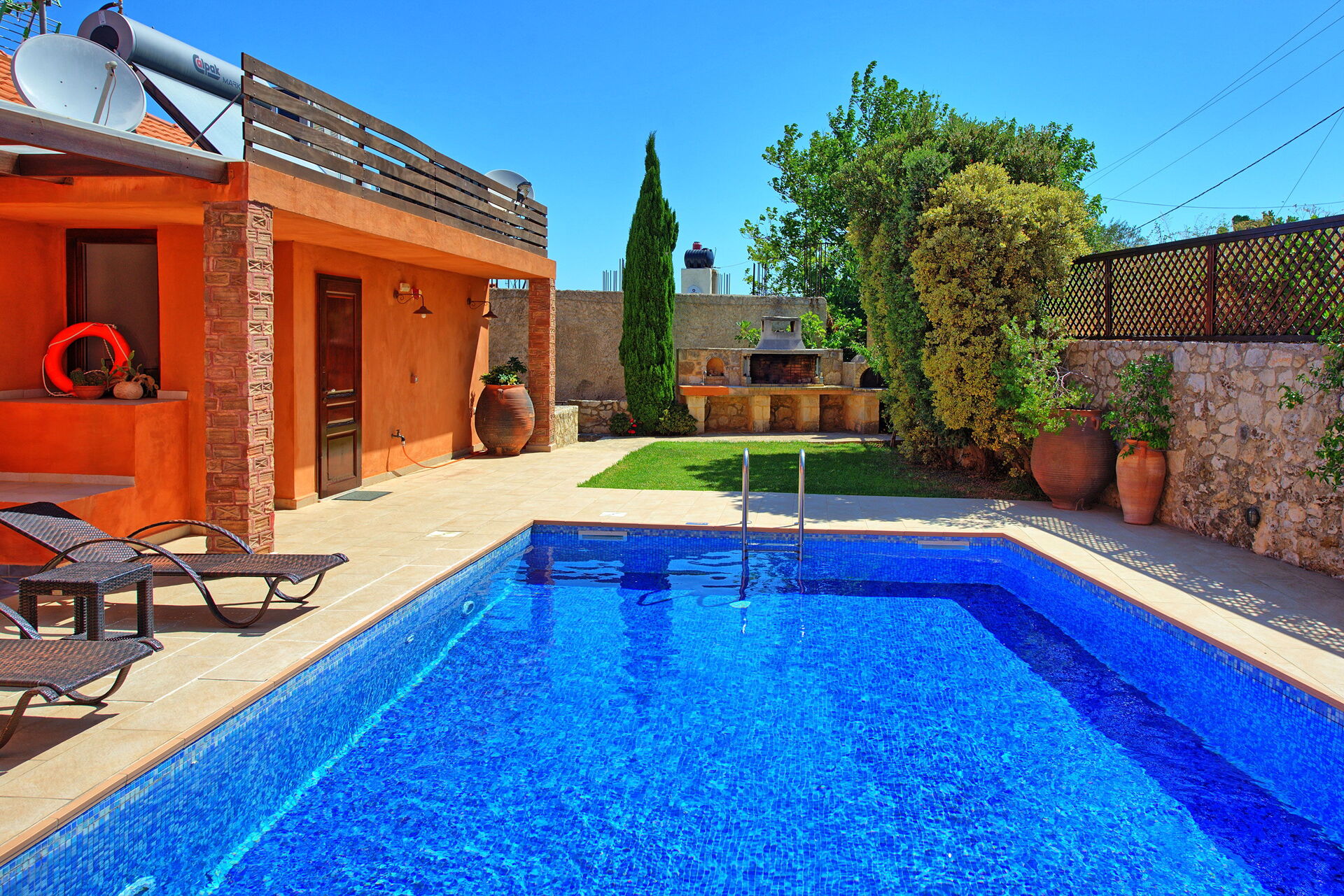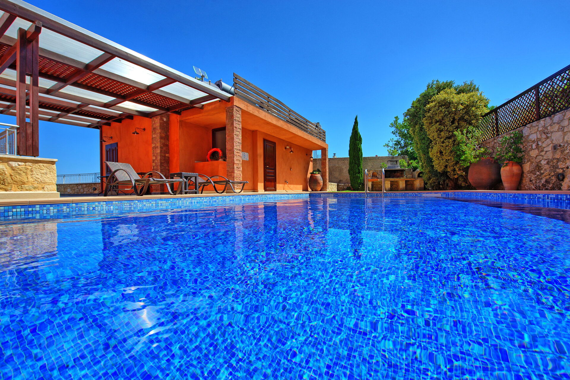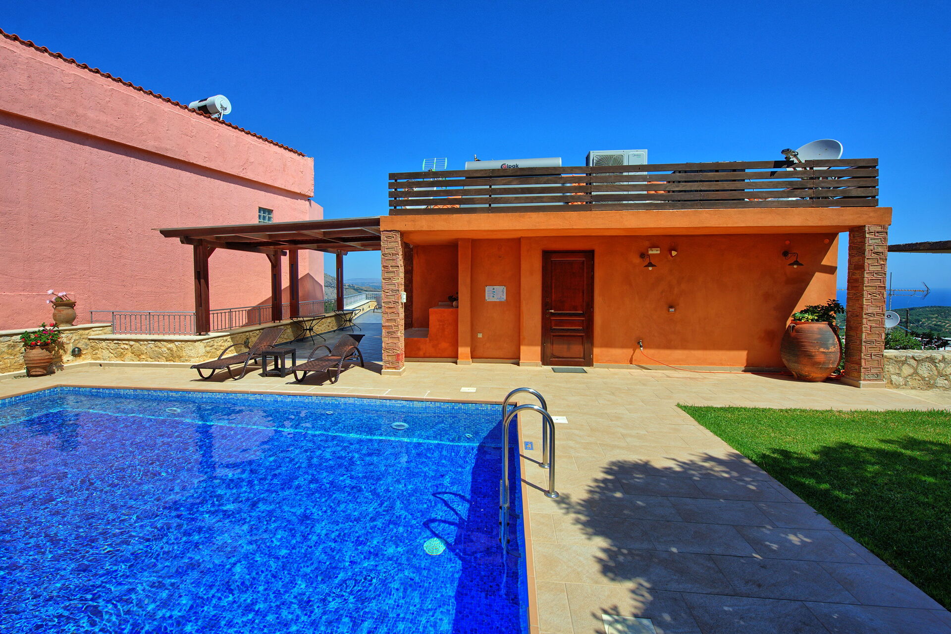 Villa Rodanthi har et vakkert basseng for avkjøling på solfylte dager, og en herlig terrasse for uteservering med fantastisk utsikt.