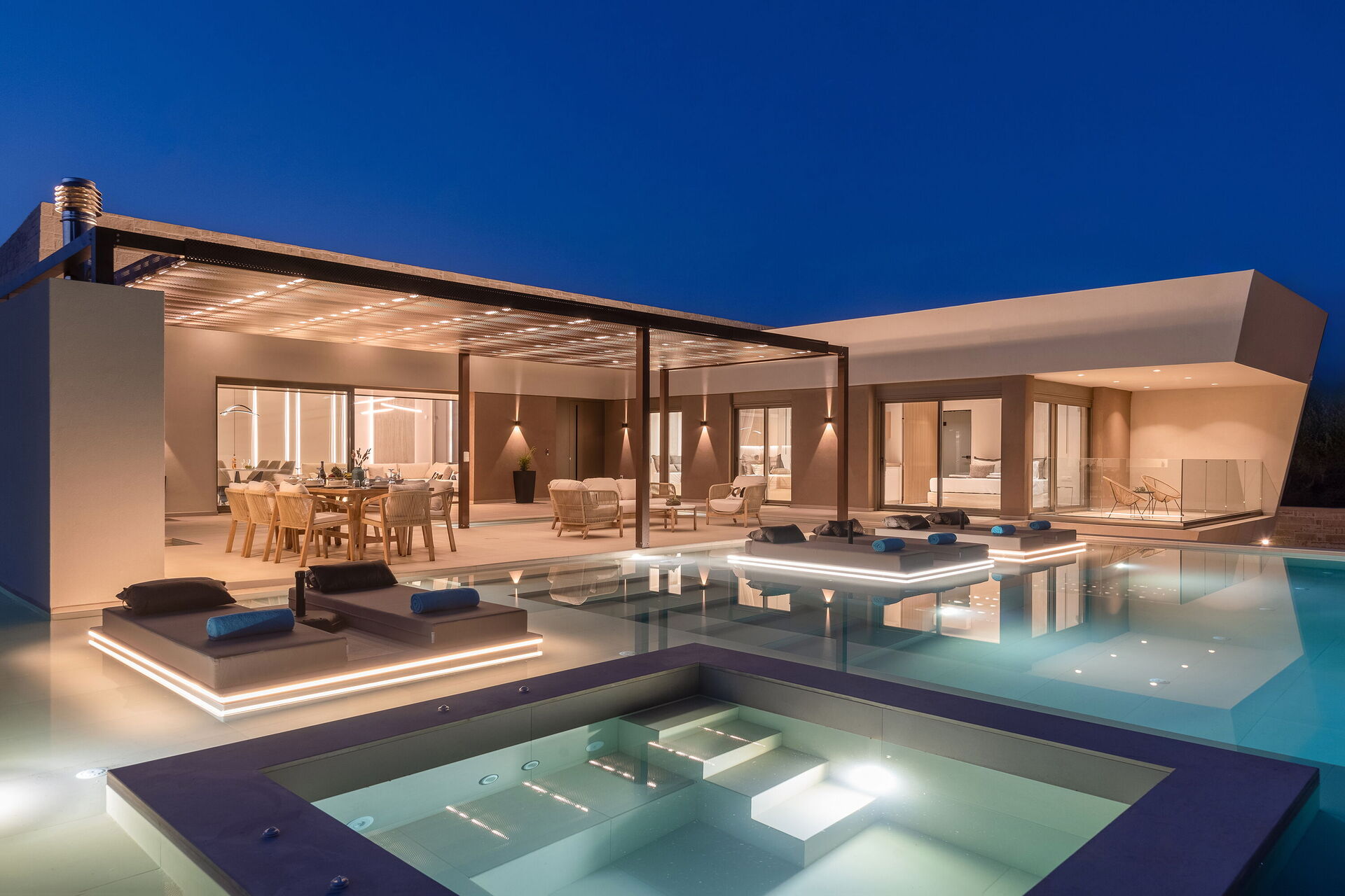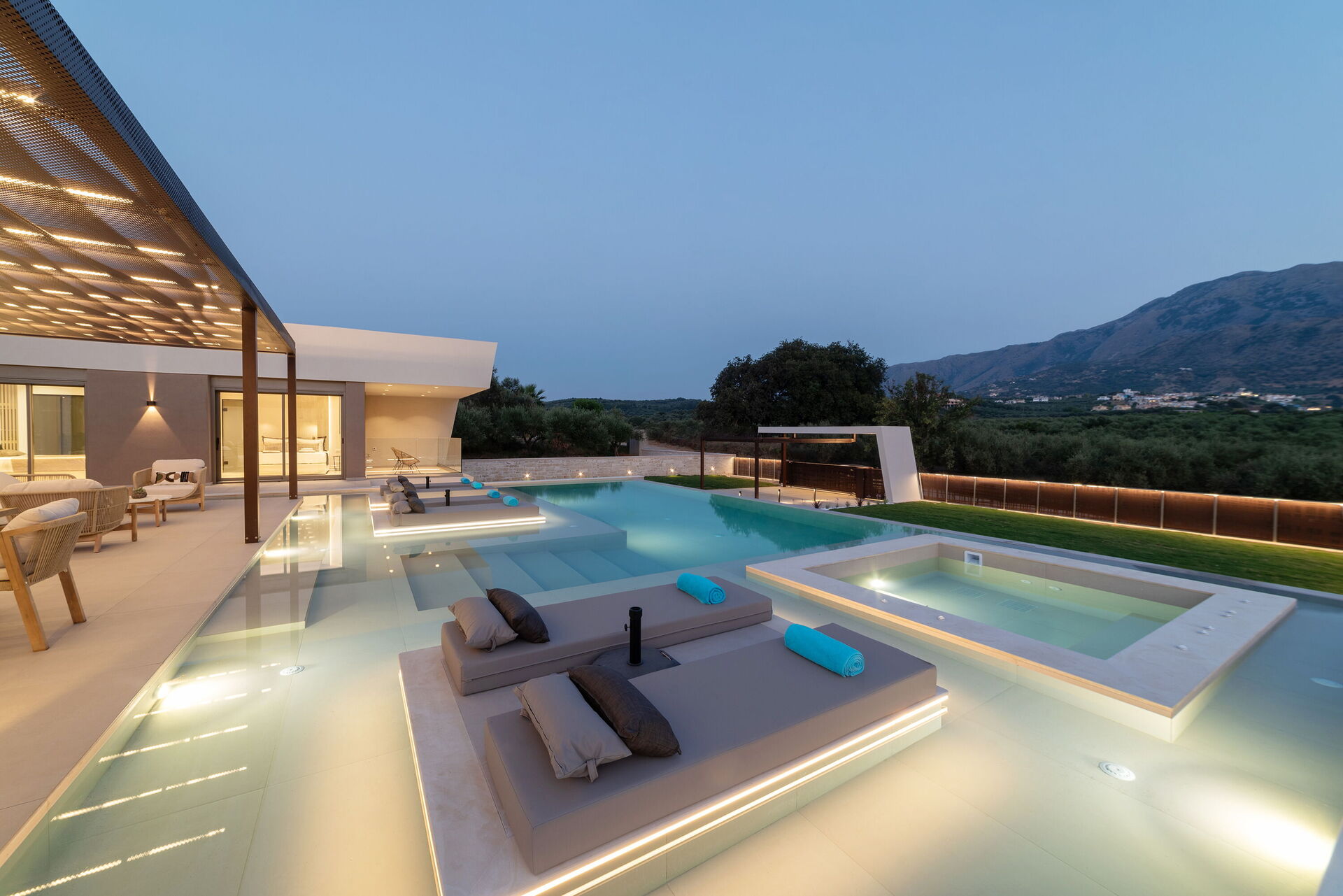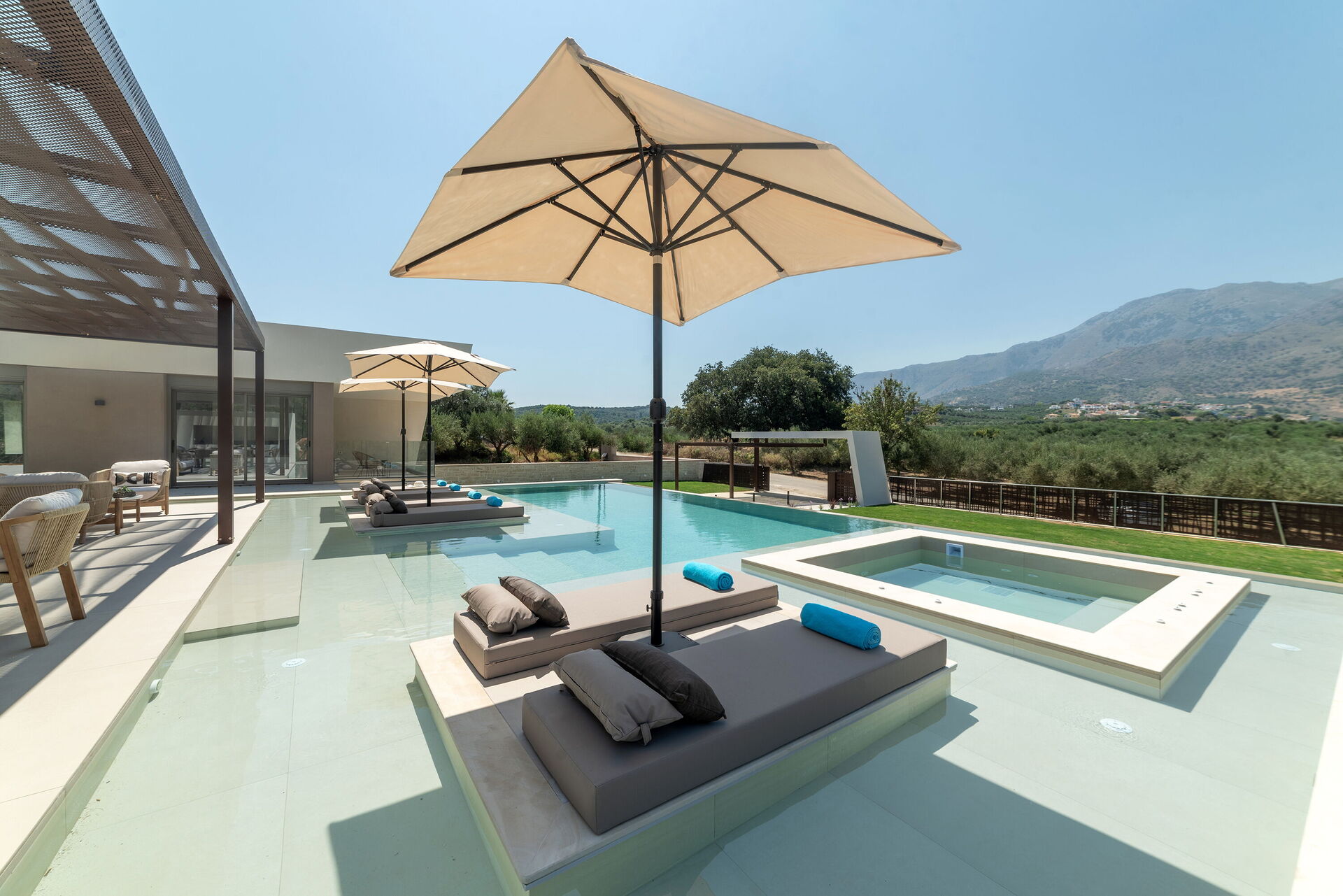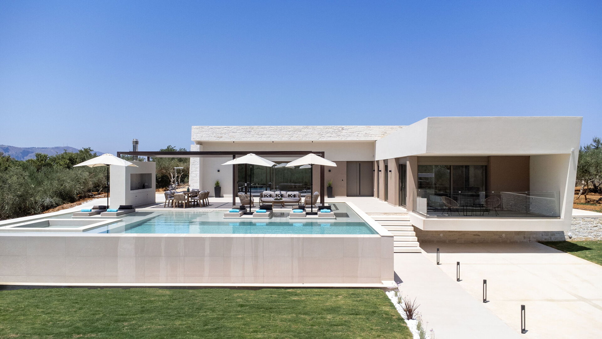Design og komfort kjennetegner denne lyse, luksuriøse villaen: møblene og planløsningen er valgt med stor omhu. Innvendig og utvendig er eiendommen designet for å by på den høyeste komforten. Feriehuset har plass til 7/8 personer fordelt på 4 soverom, og på uteområdet er det et stort, møblert område med utekjøkken og spiseområde hvor man kan nyte vakre solskinnsdager på Kreta. I det private bassenget (med boblebad) kan gjestene kjøle seg ned og ha det gøy.