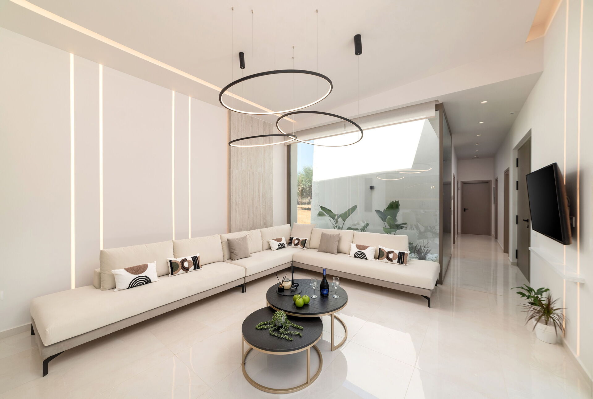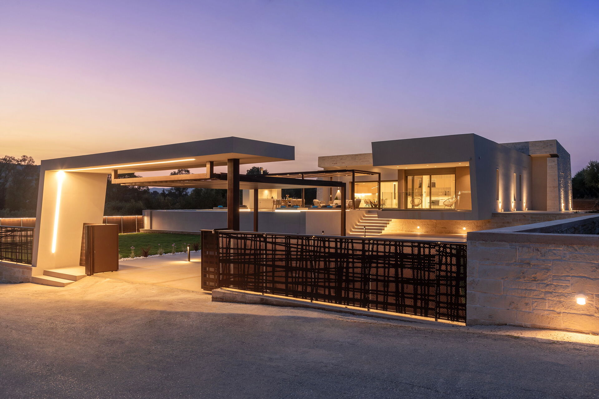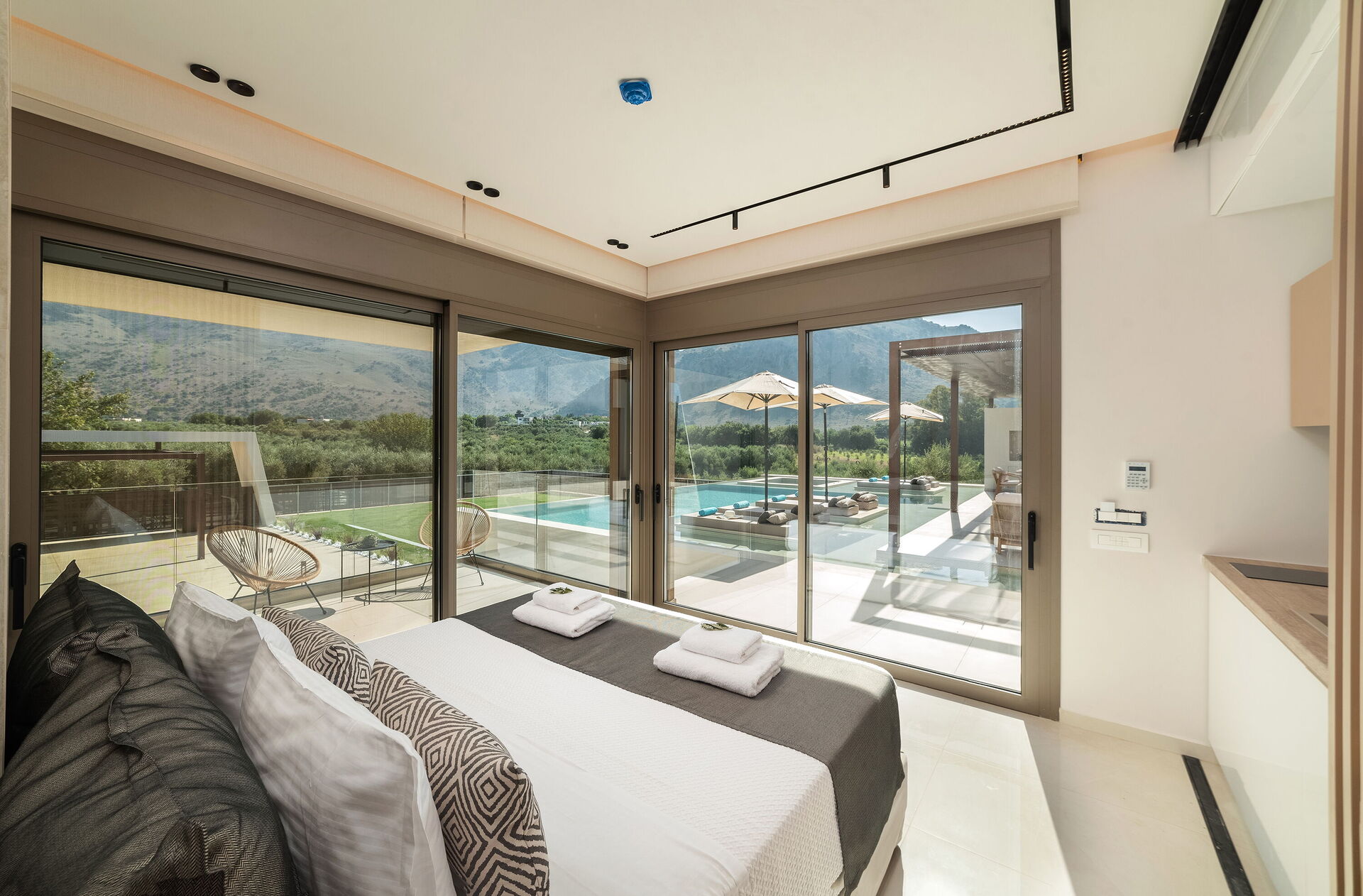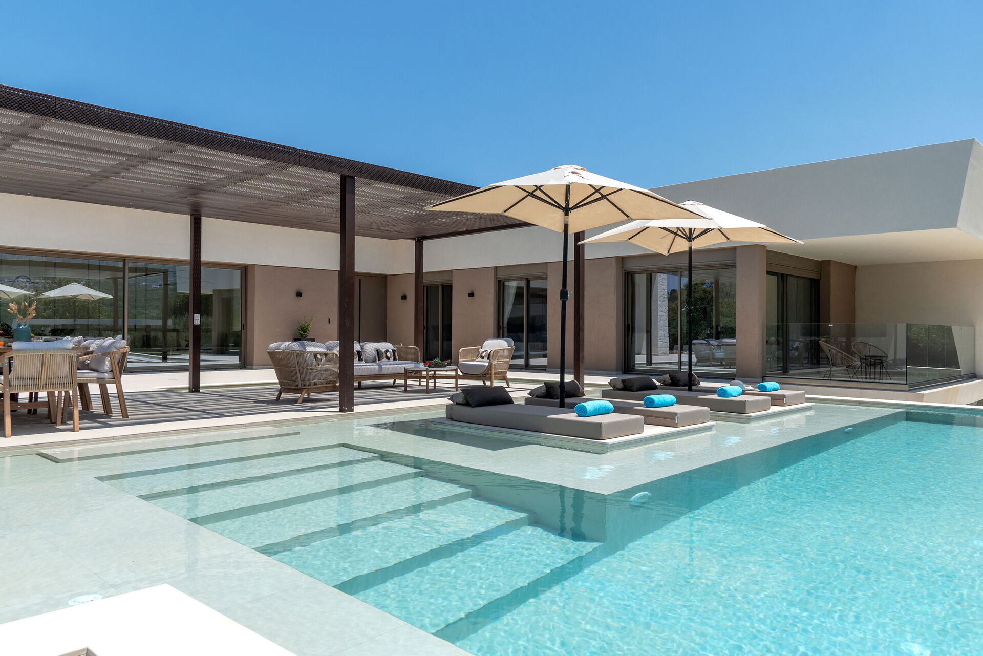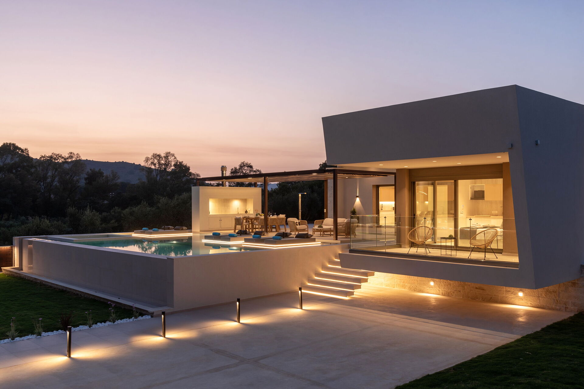 Design og komfort kjennetegner denne lyse, luksuriøse villaen: møblene og planløsningen er valgt med stor omhu. Innvendig og utvendig er eiendommen designet for å by på den høyeste komforten. Feriehuset har plass til 7/8 personer fordelt på 4 soverom, og på uteområdet er det et stort, møblert område med utekjøkken og spiseområde hvor man kan nyte vakre solskinnsdager på Kreta. I det private bassenget (med boblebad) kan gjestene kjøle seg ned og ha det gøy.