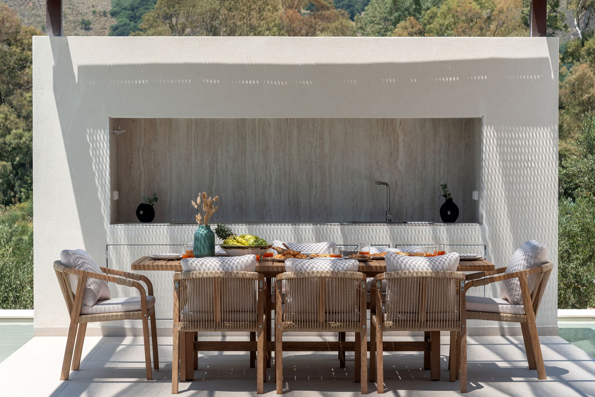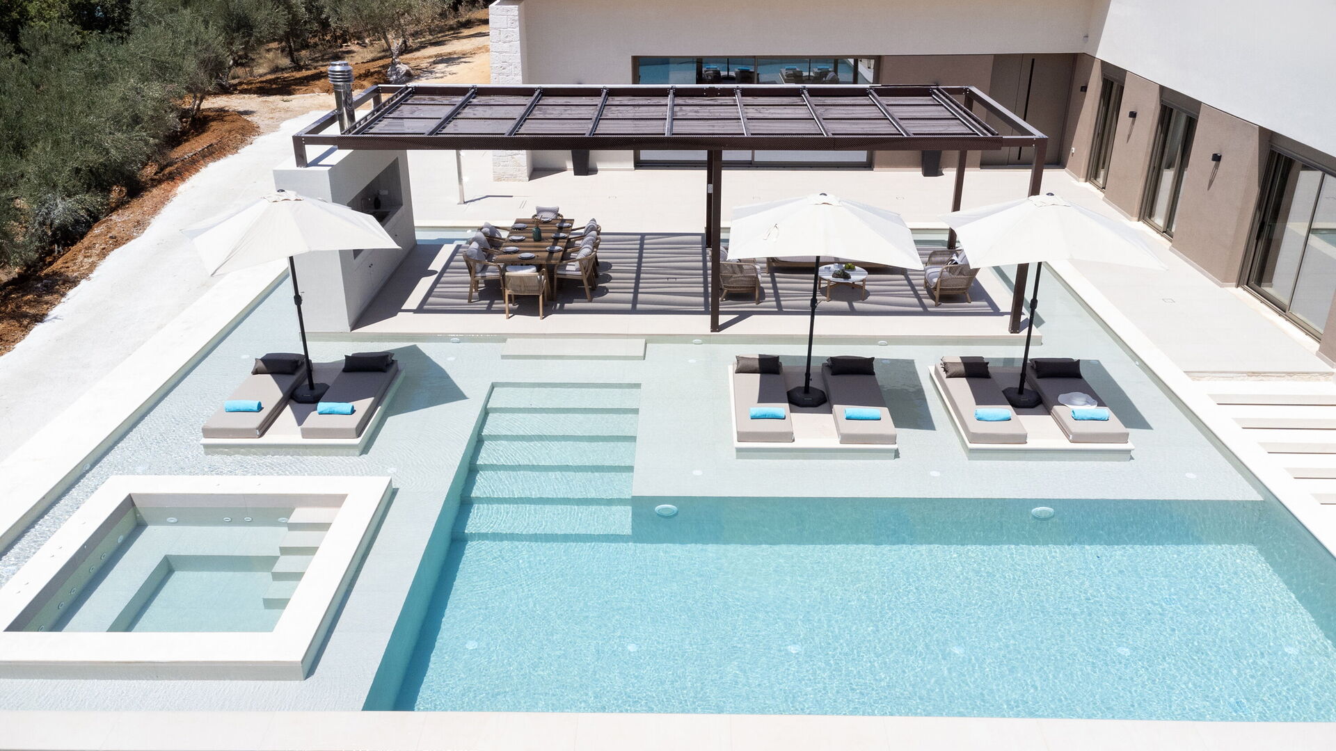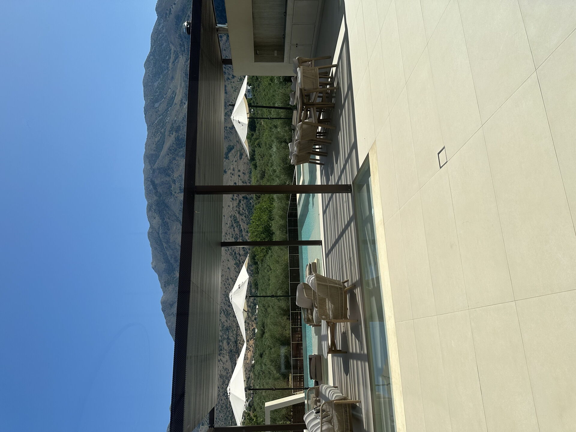 The Villa is n a beautiful setting of olive trees, with stunning views of the mountains. The Villa is very modern, was spotlessly clean and we felt the pool area in particular felt really luxurious- it’s easy to spend lazy days here listening to the crickets, the goat bells and the cockerel.